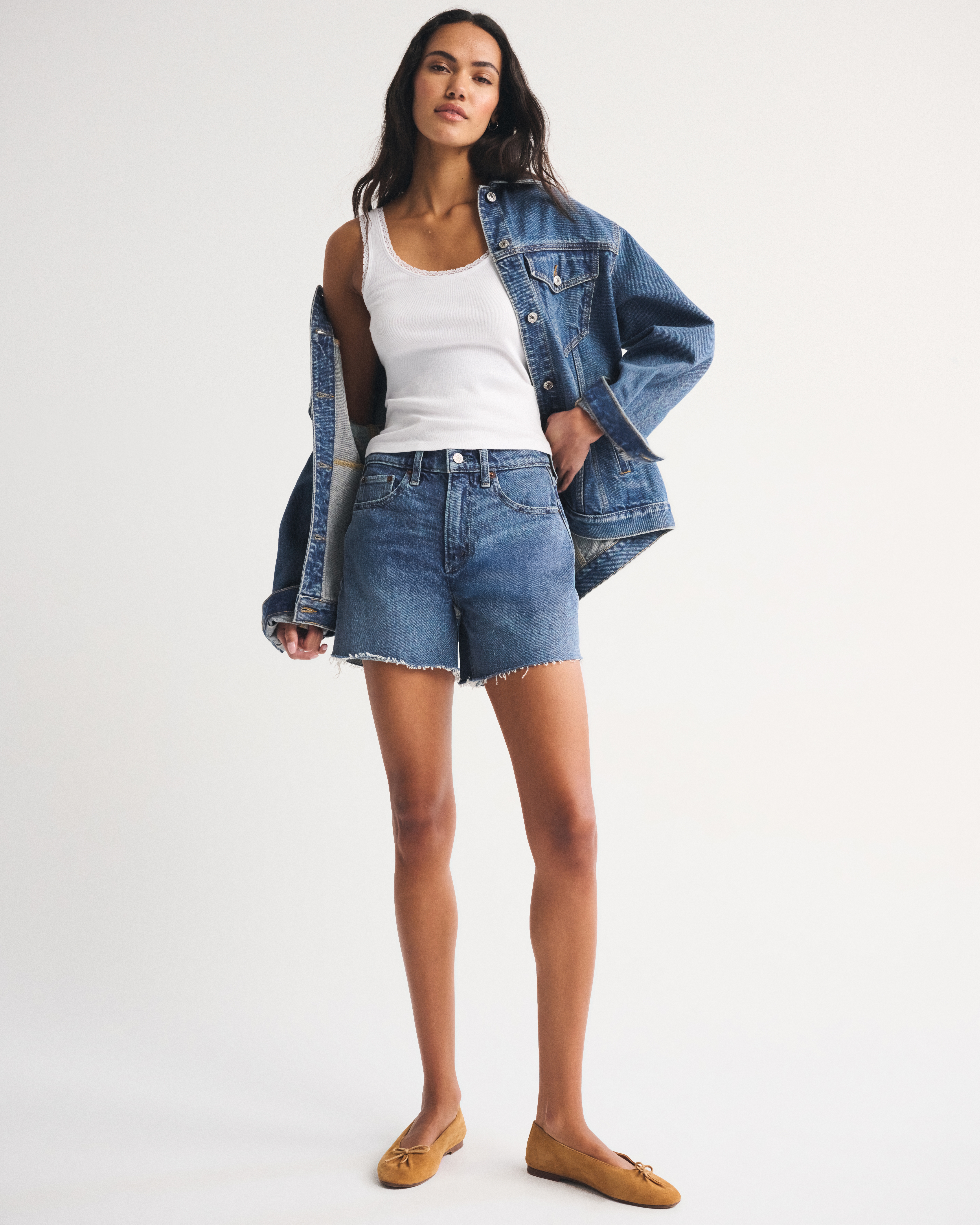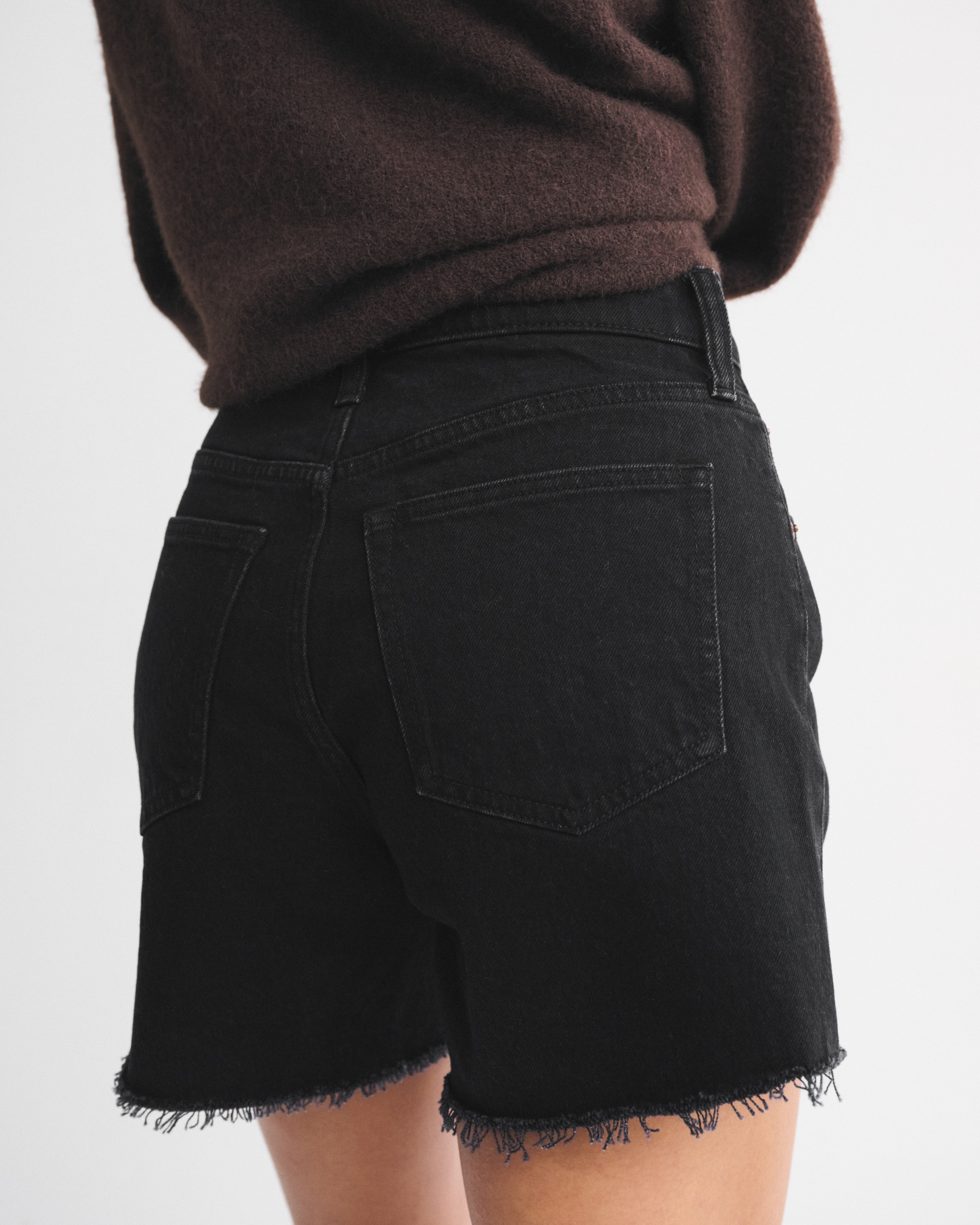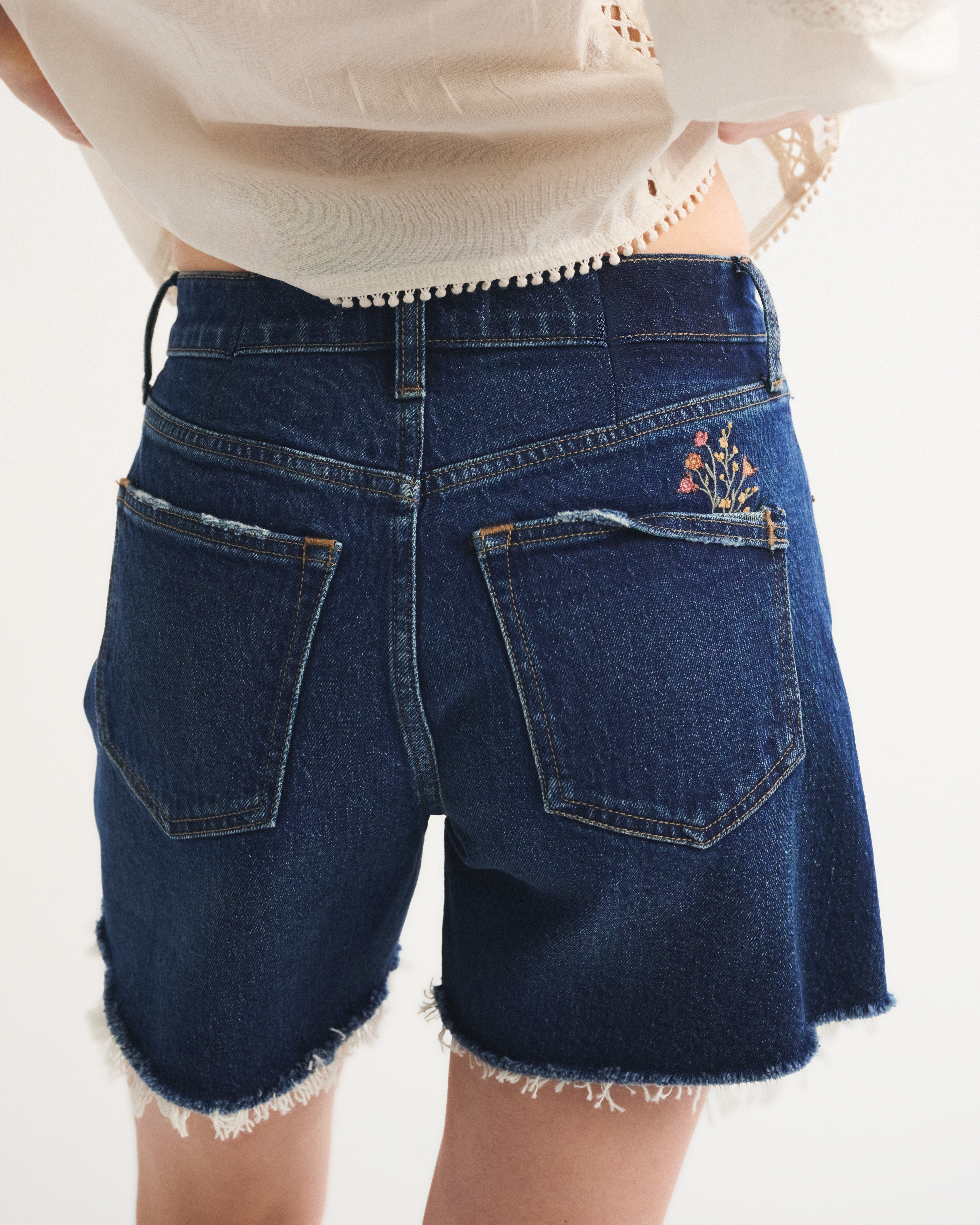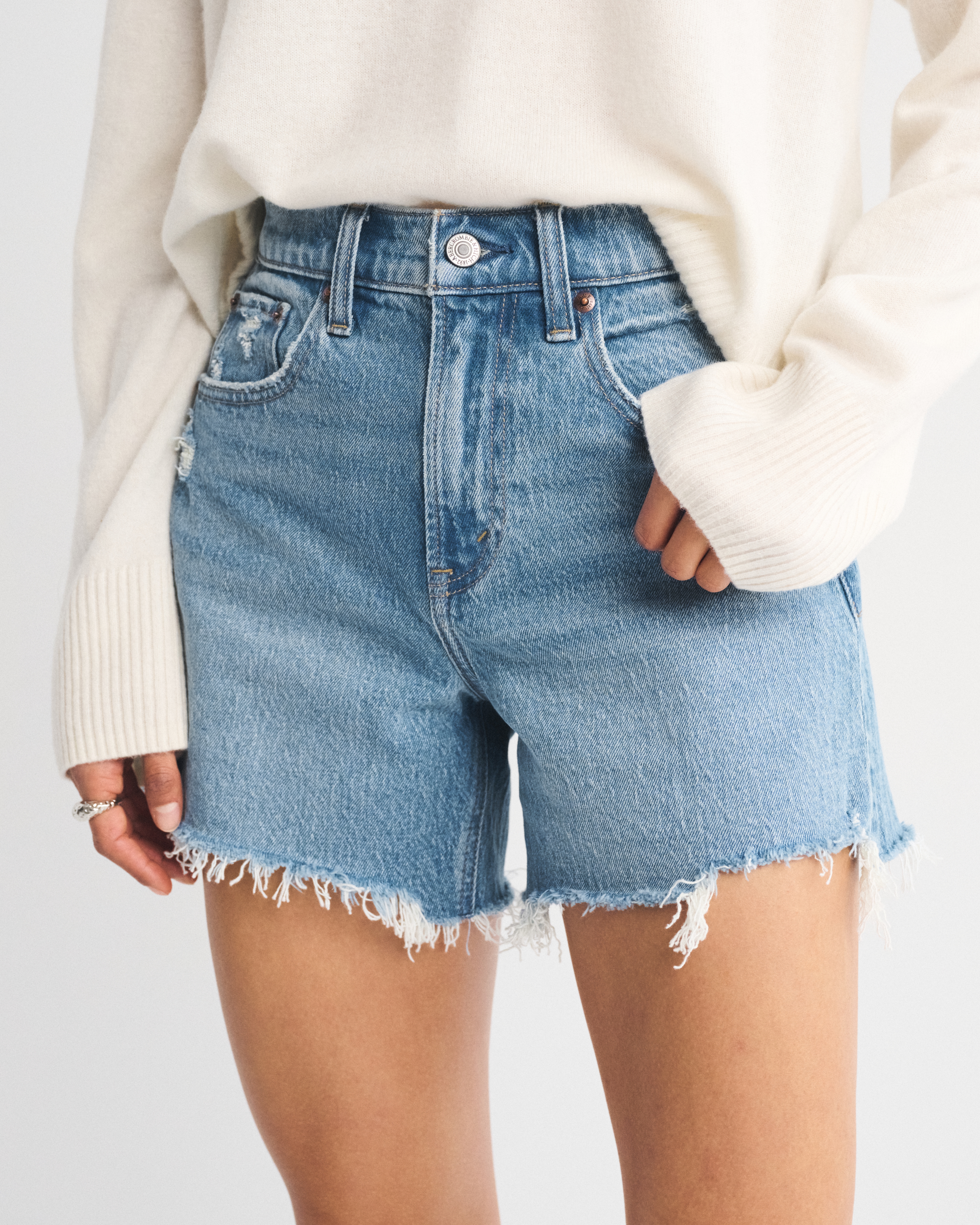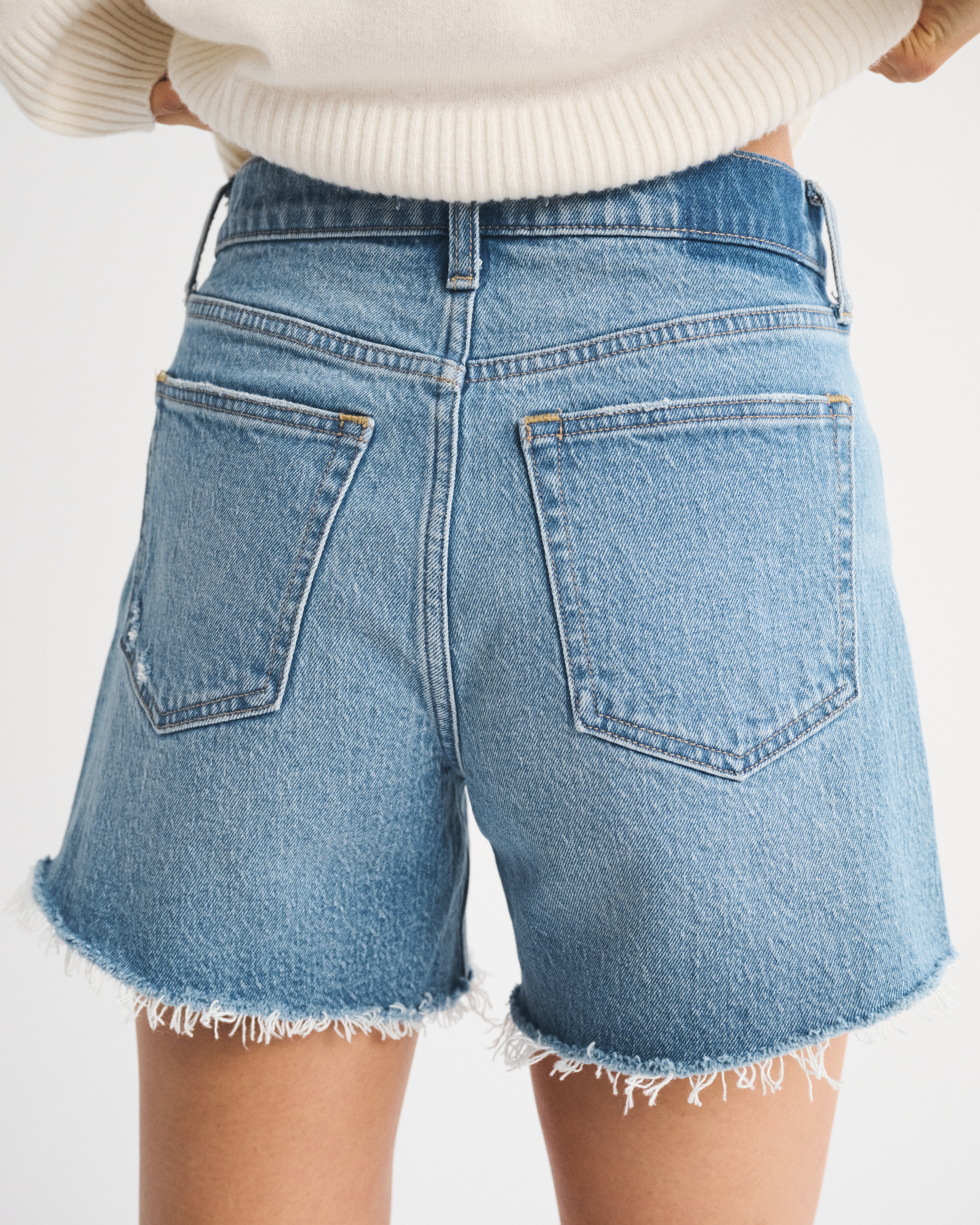 High rise with a relaxed fit throughout the hip and thigh, and a 5 inch (13 cm) inseam. Vintage stretch denim in a medium wash, with distressed details and frayed hem. Imported.