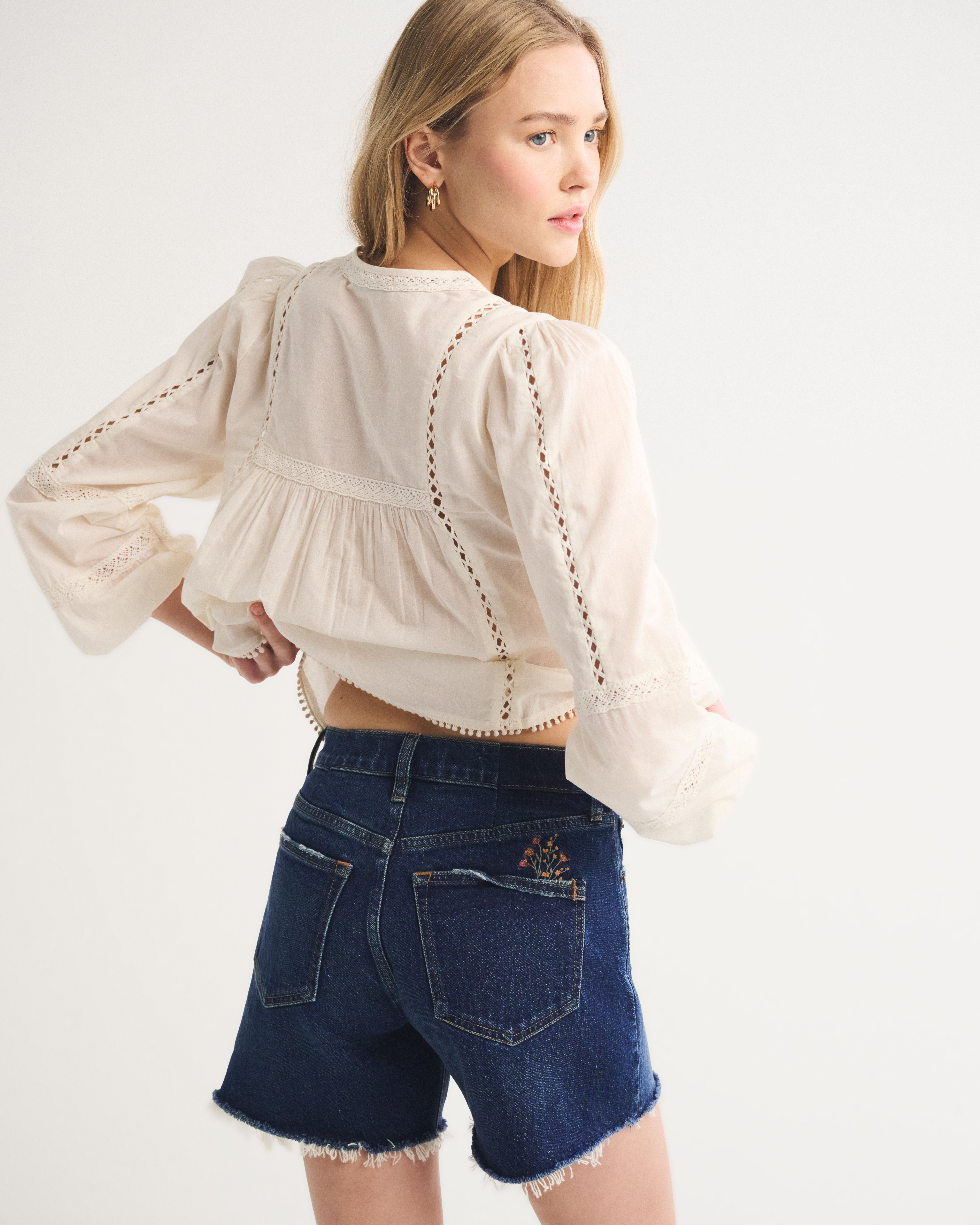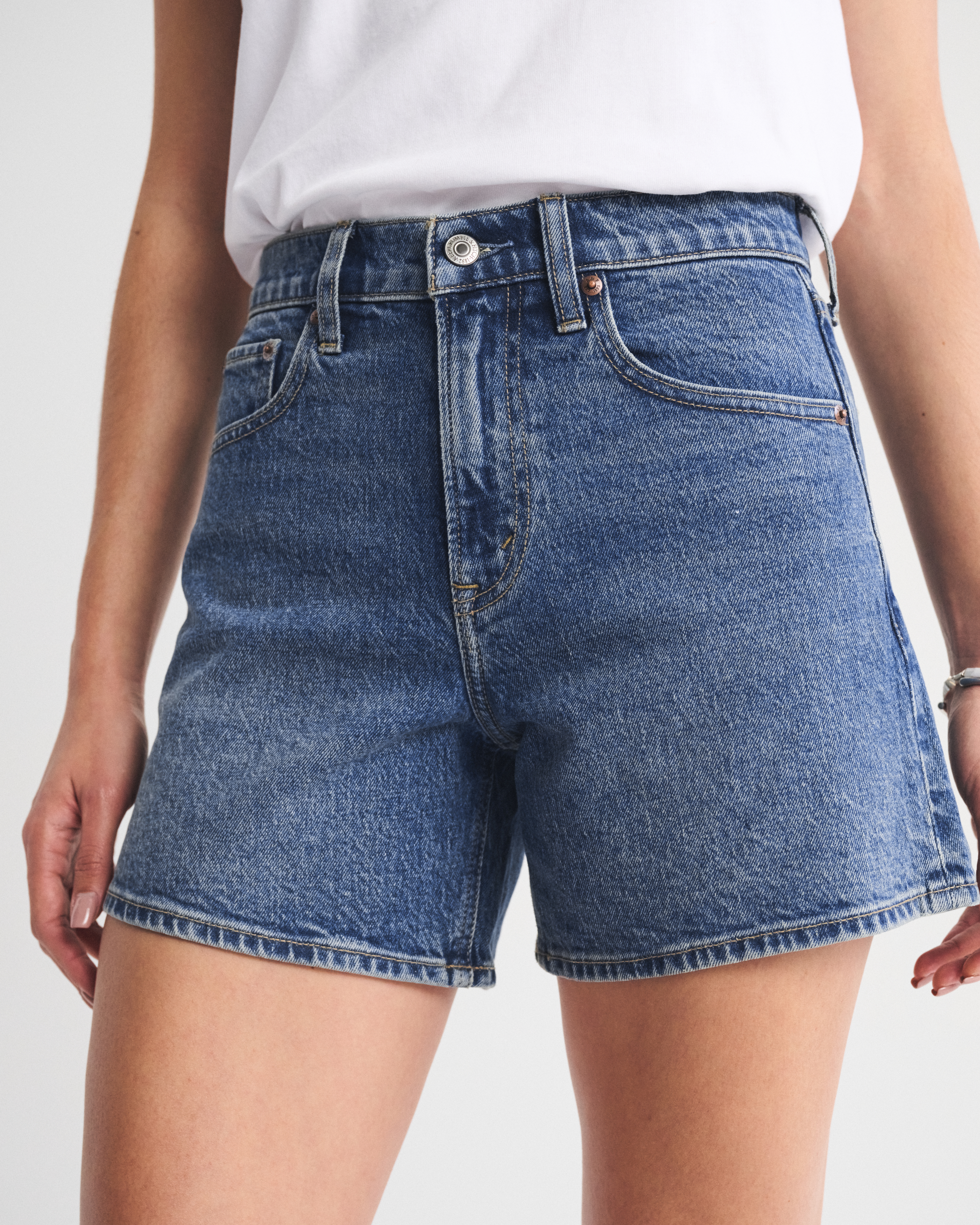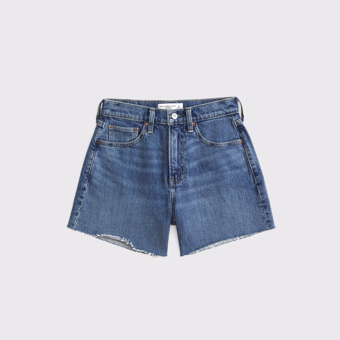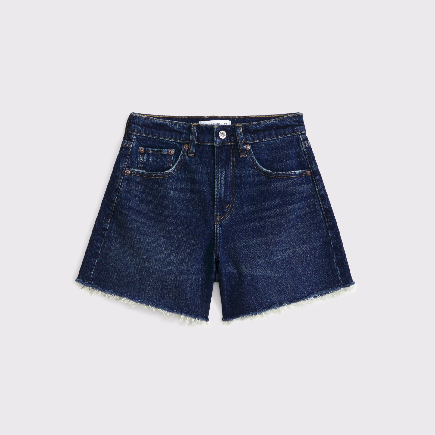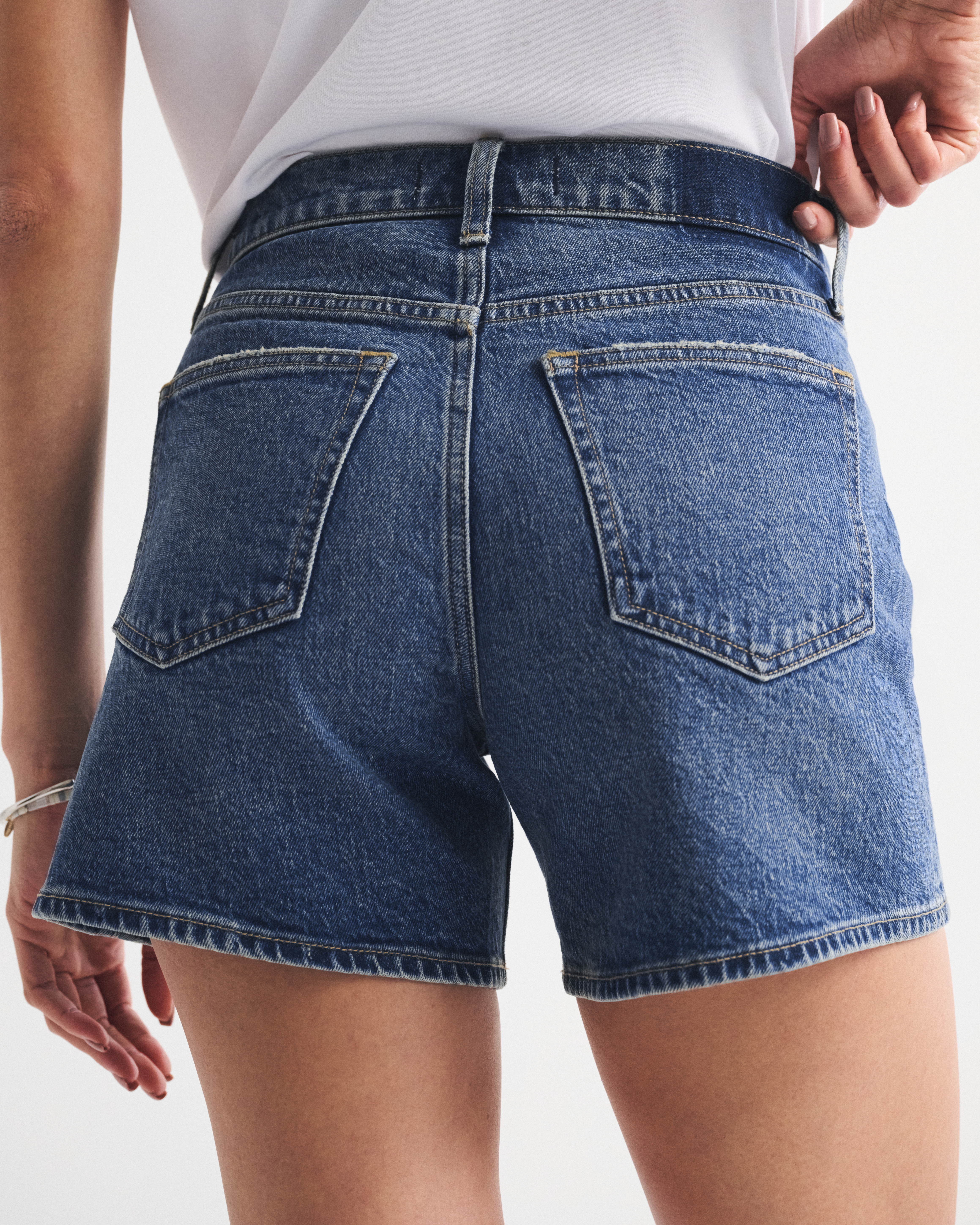 High rise with a relaxed fit throughout the hip and thigh, and a 5 inch (13 cm) inseam. Vintage stretch denim in a medium wash, with distressed details and frayed hem. Imported.