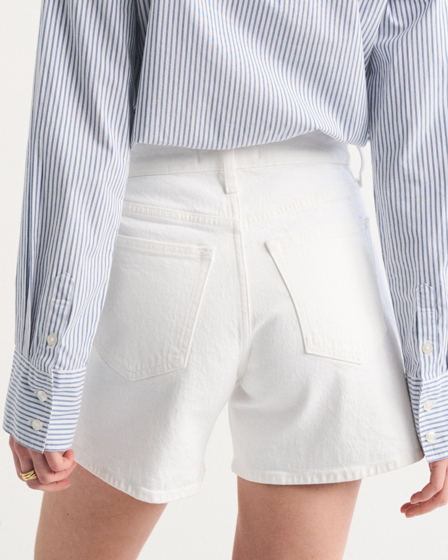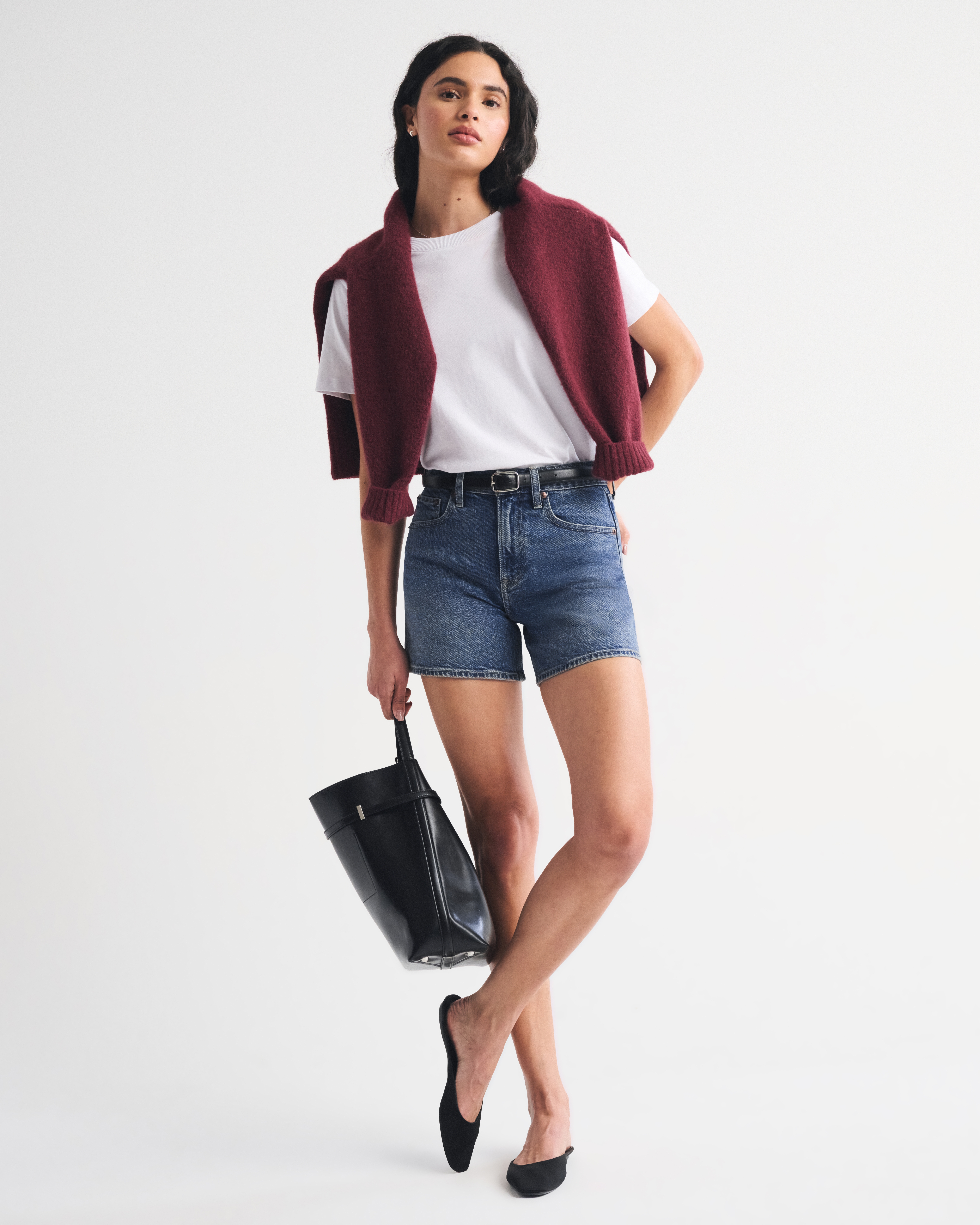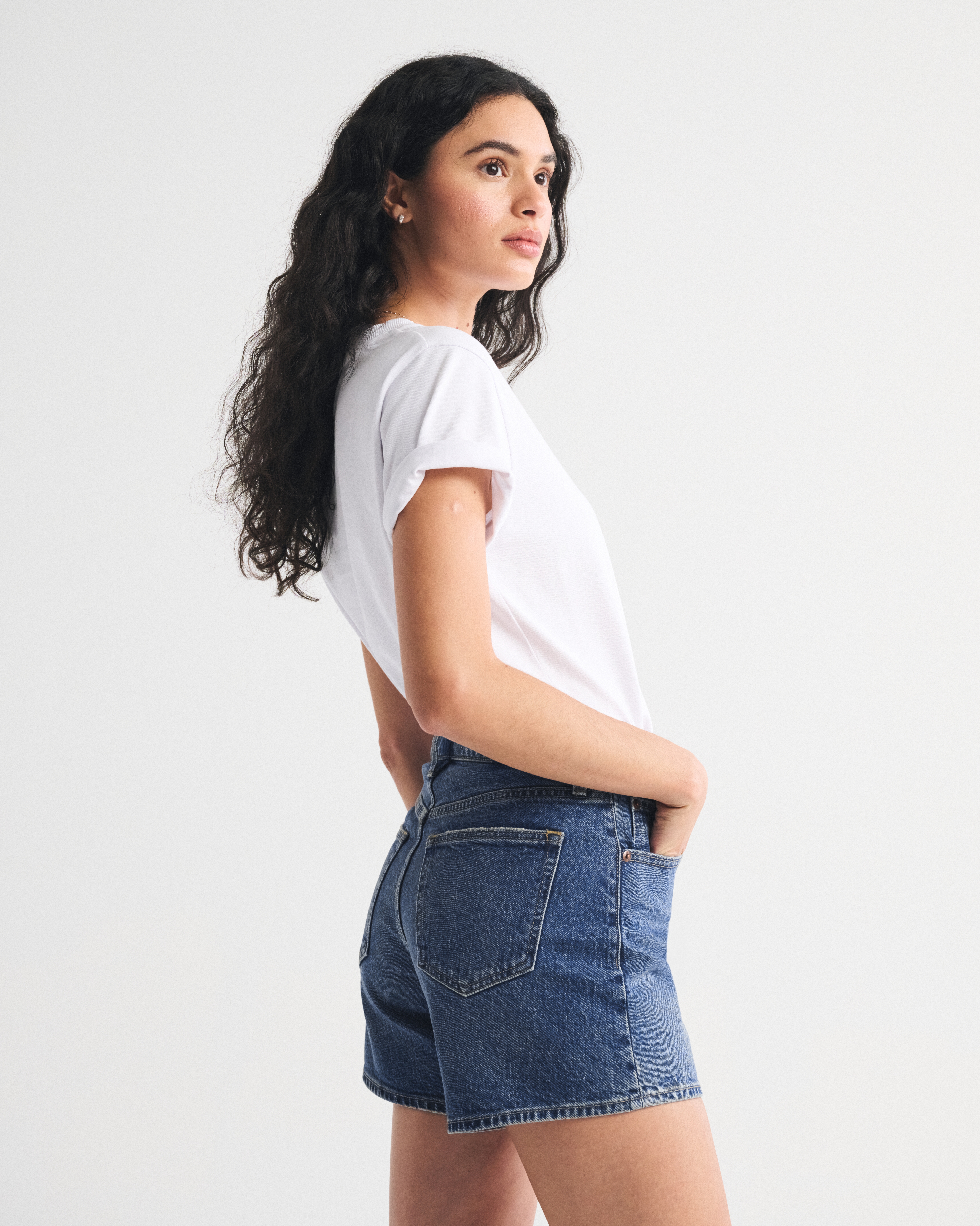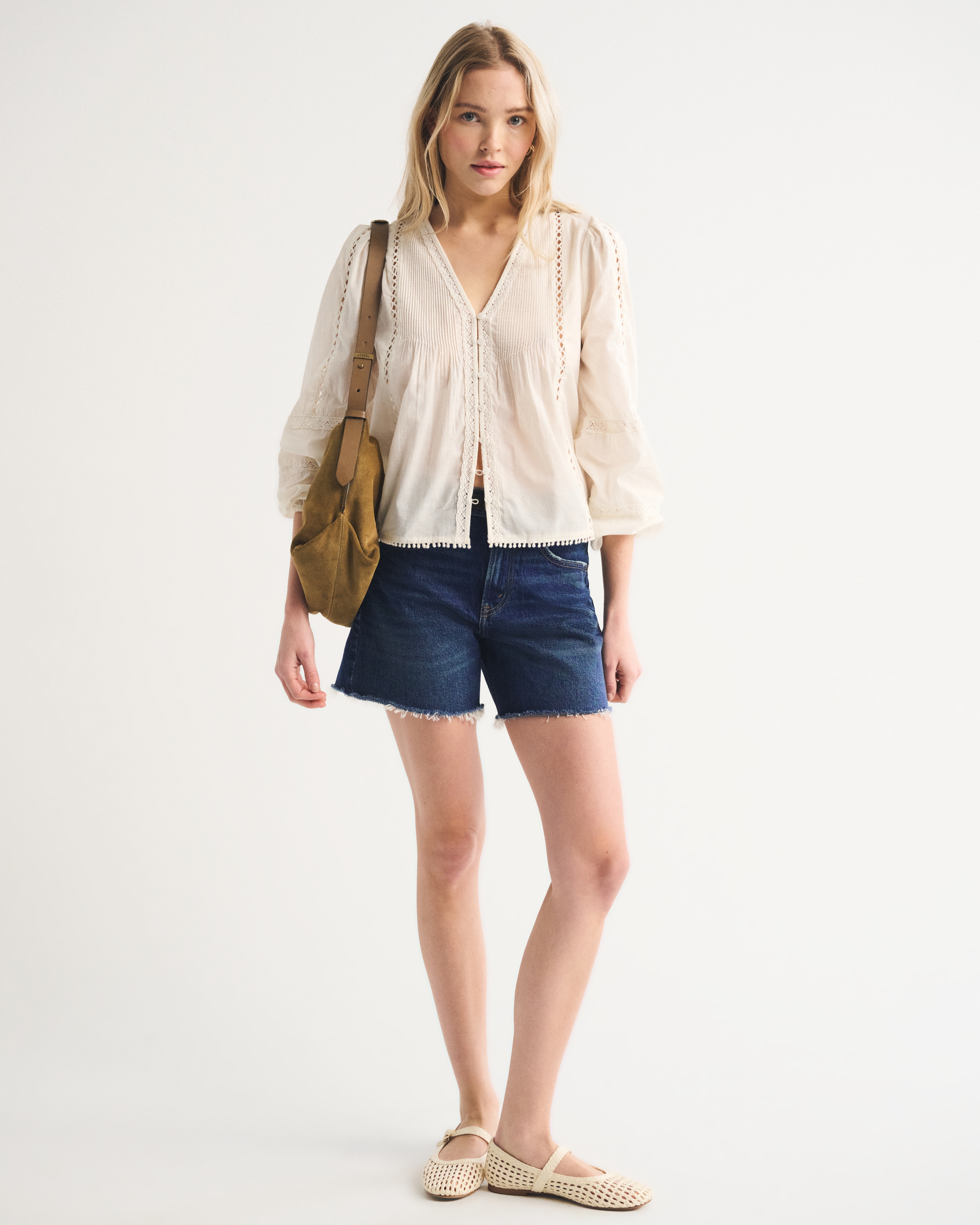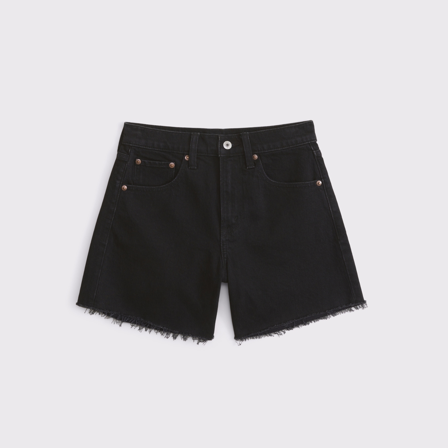 High rise with a relaxed fit throughout the hip and thigh, and a 5 inch (13 cm) inseam. Vintage stretch denim in a medium wash, with distressed details and frayed hem. Imported.
