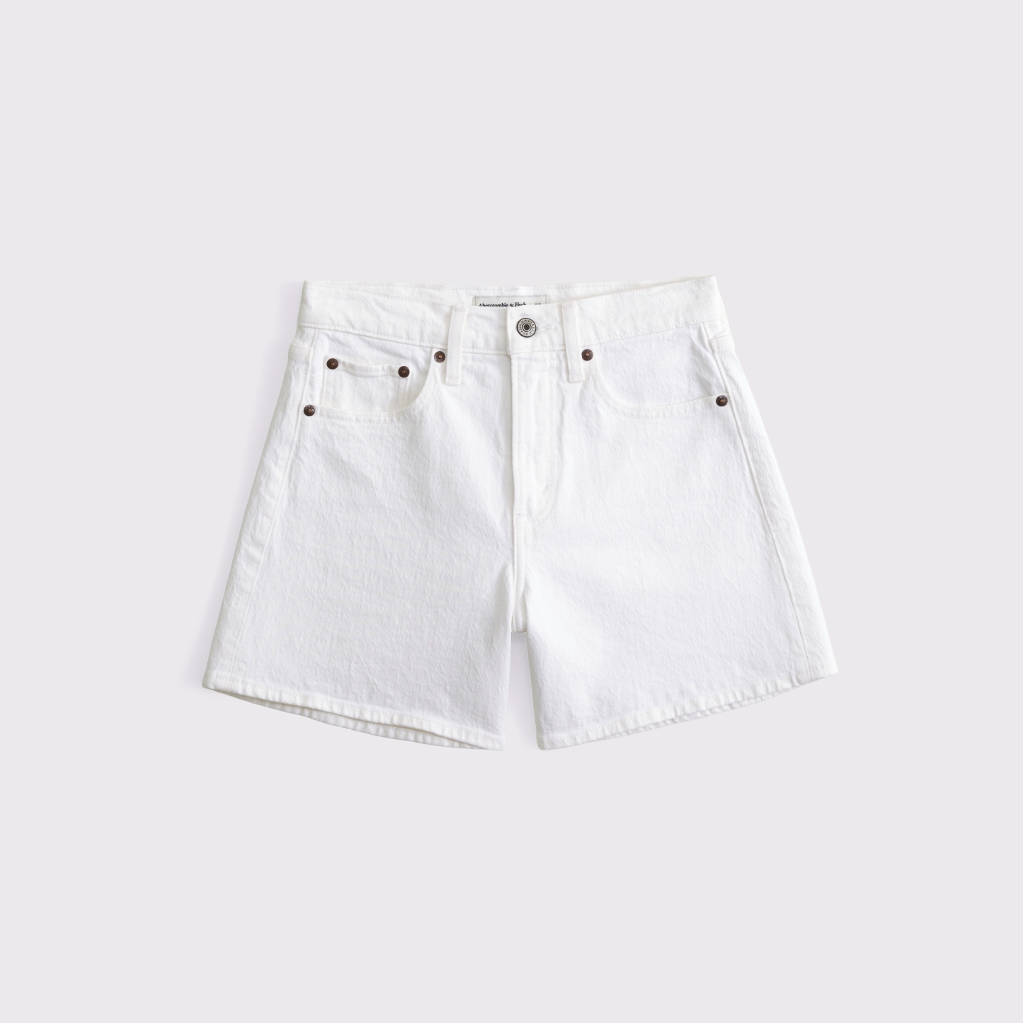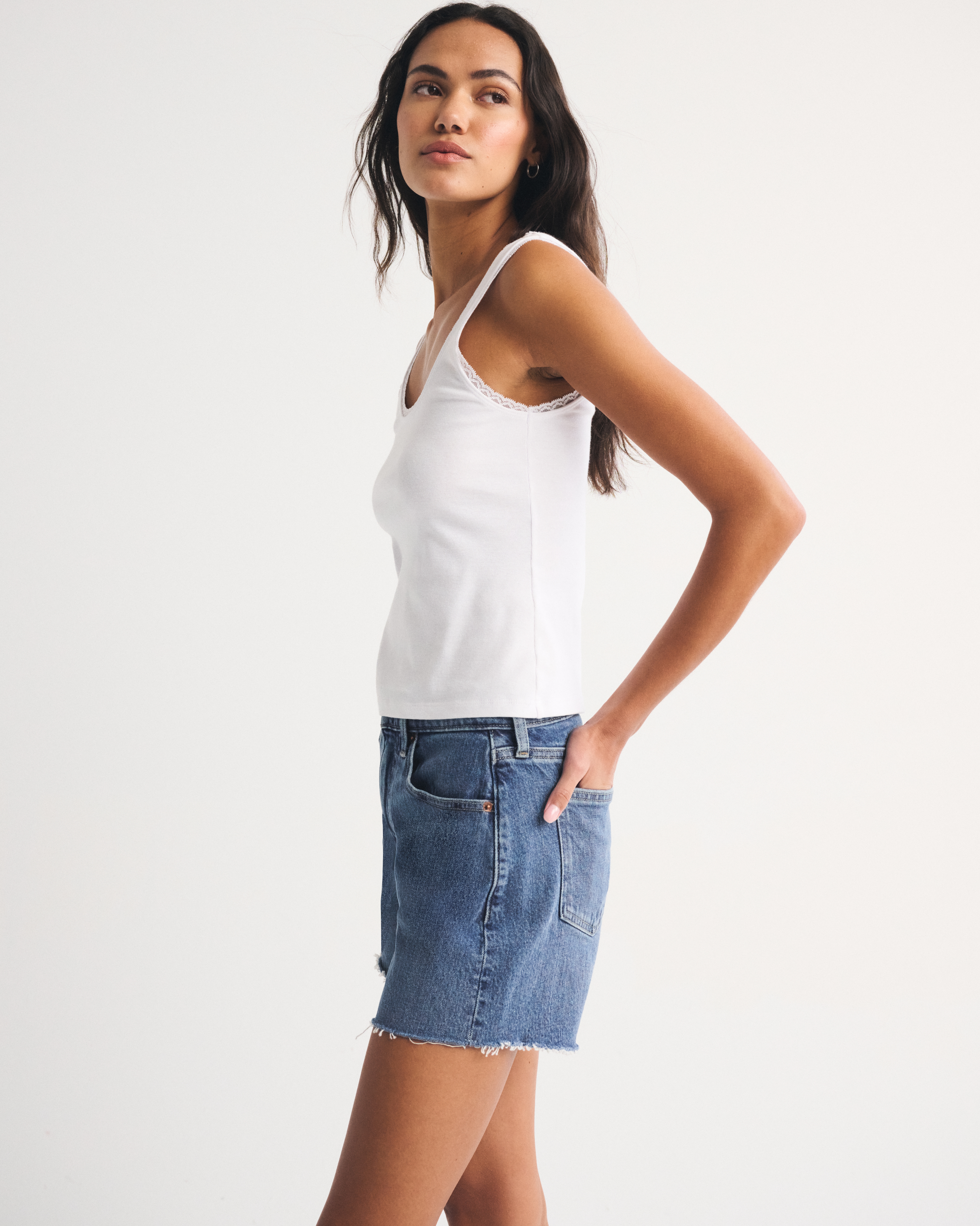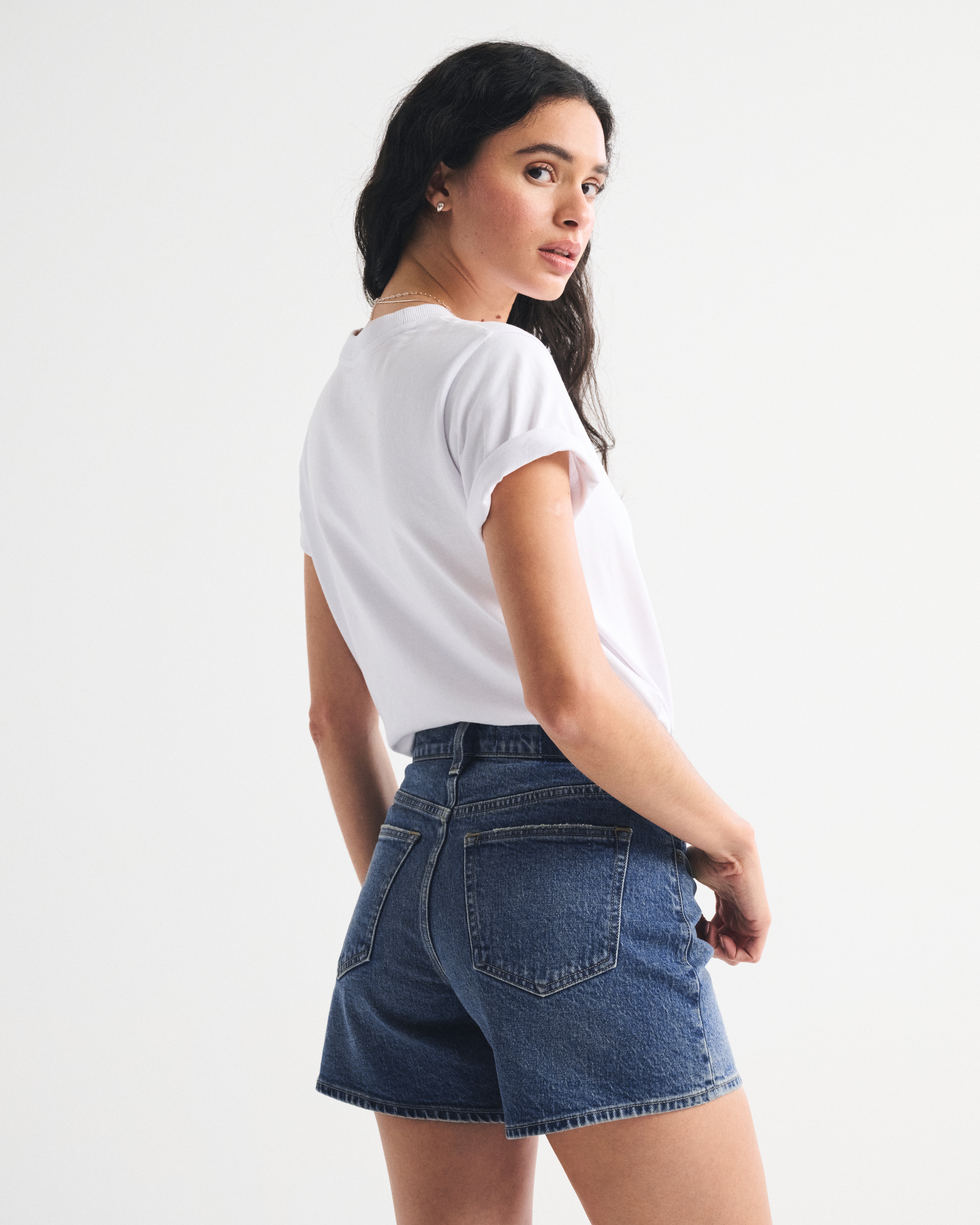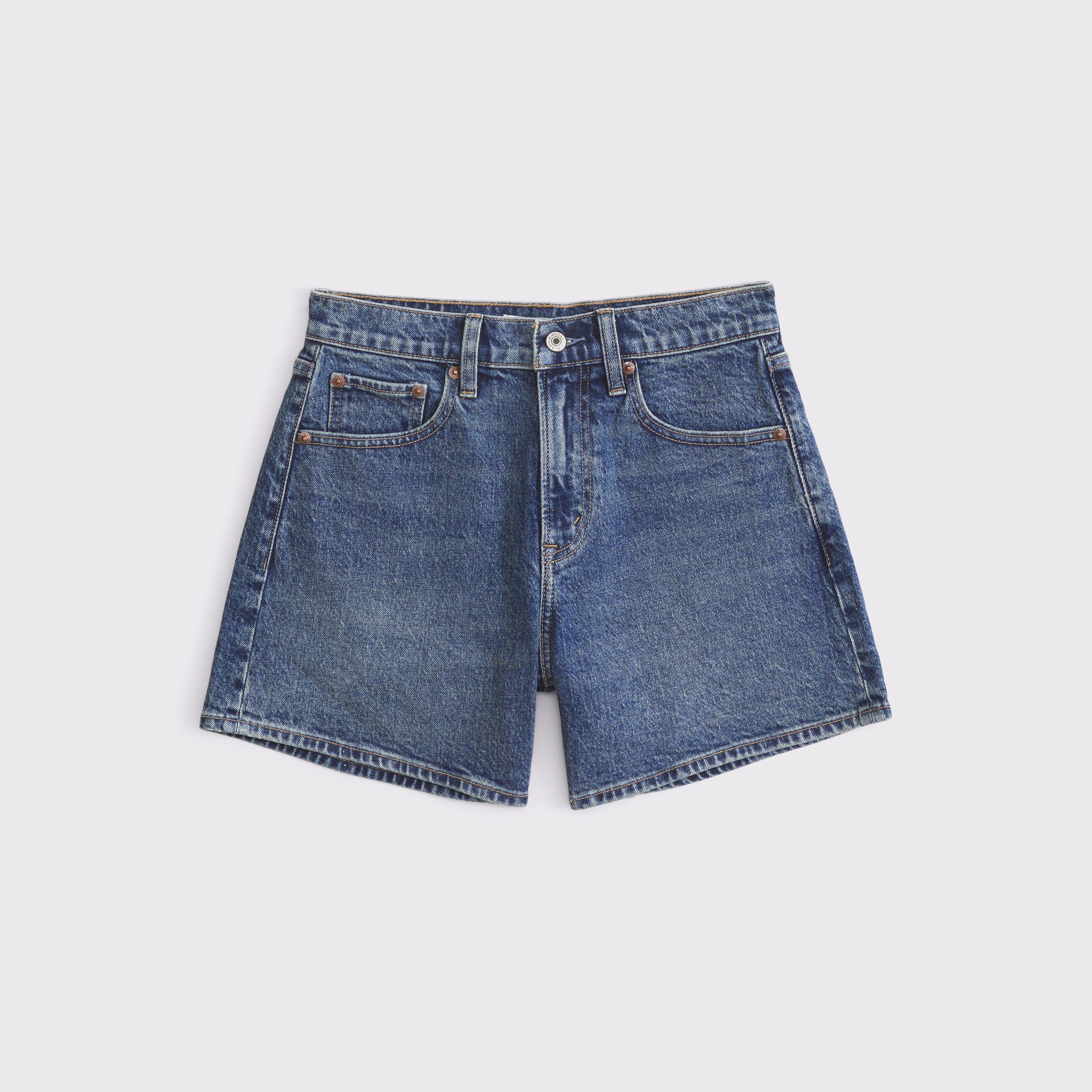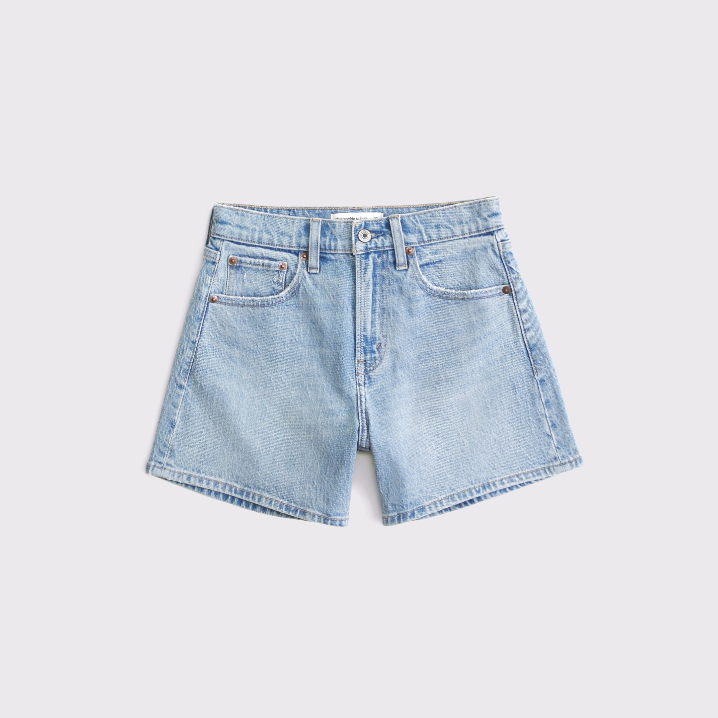 High rise with a relaxed fit throughout the hip and thigh, and a 5 inch (13 cm) inseam. Vintage stretch denim in a medium wash, with distressed details and frayed hem. Imported.