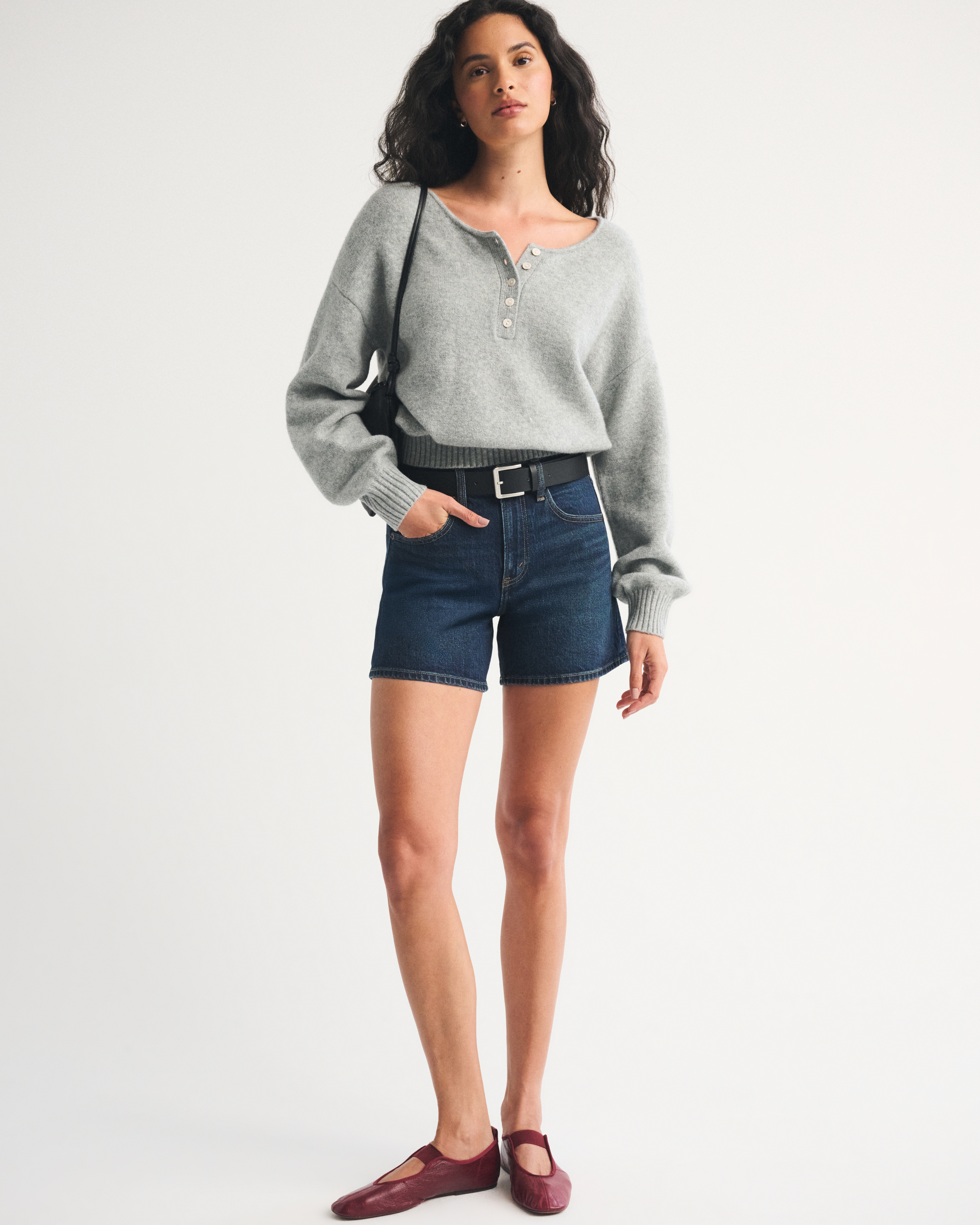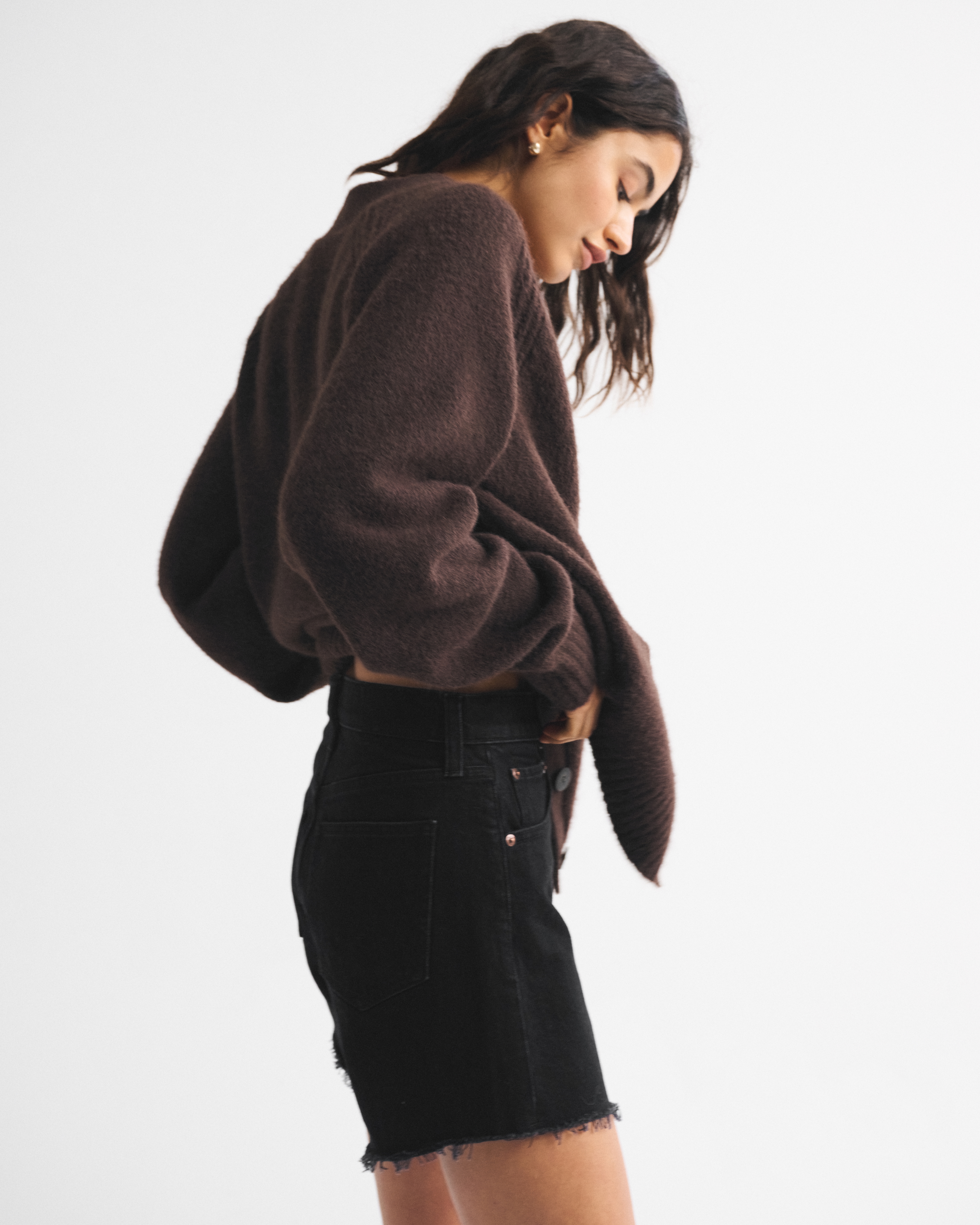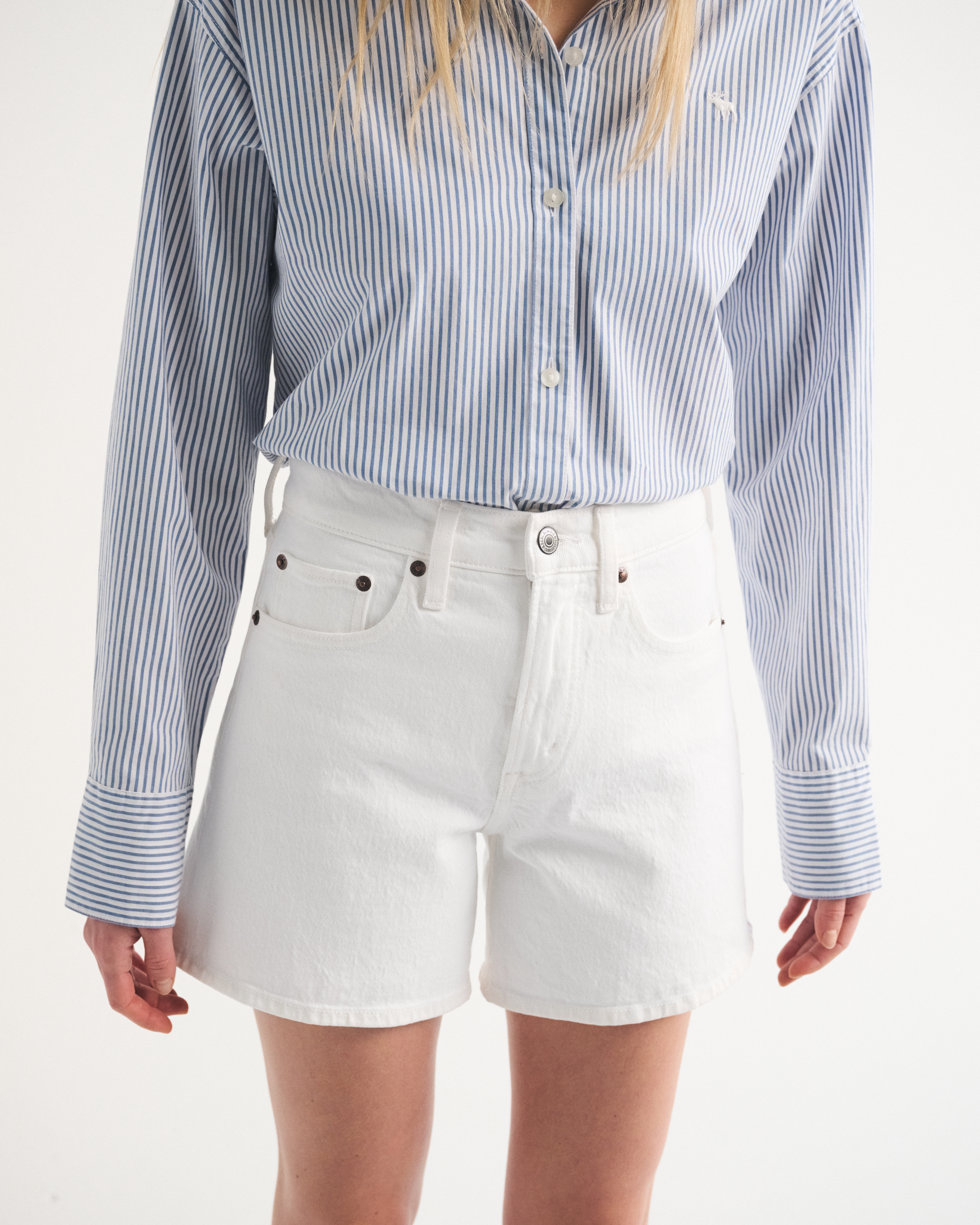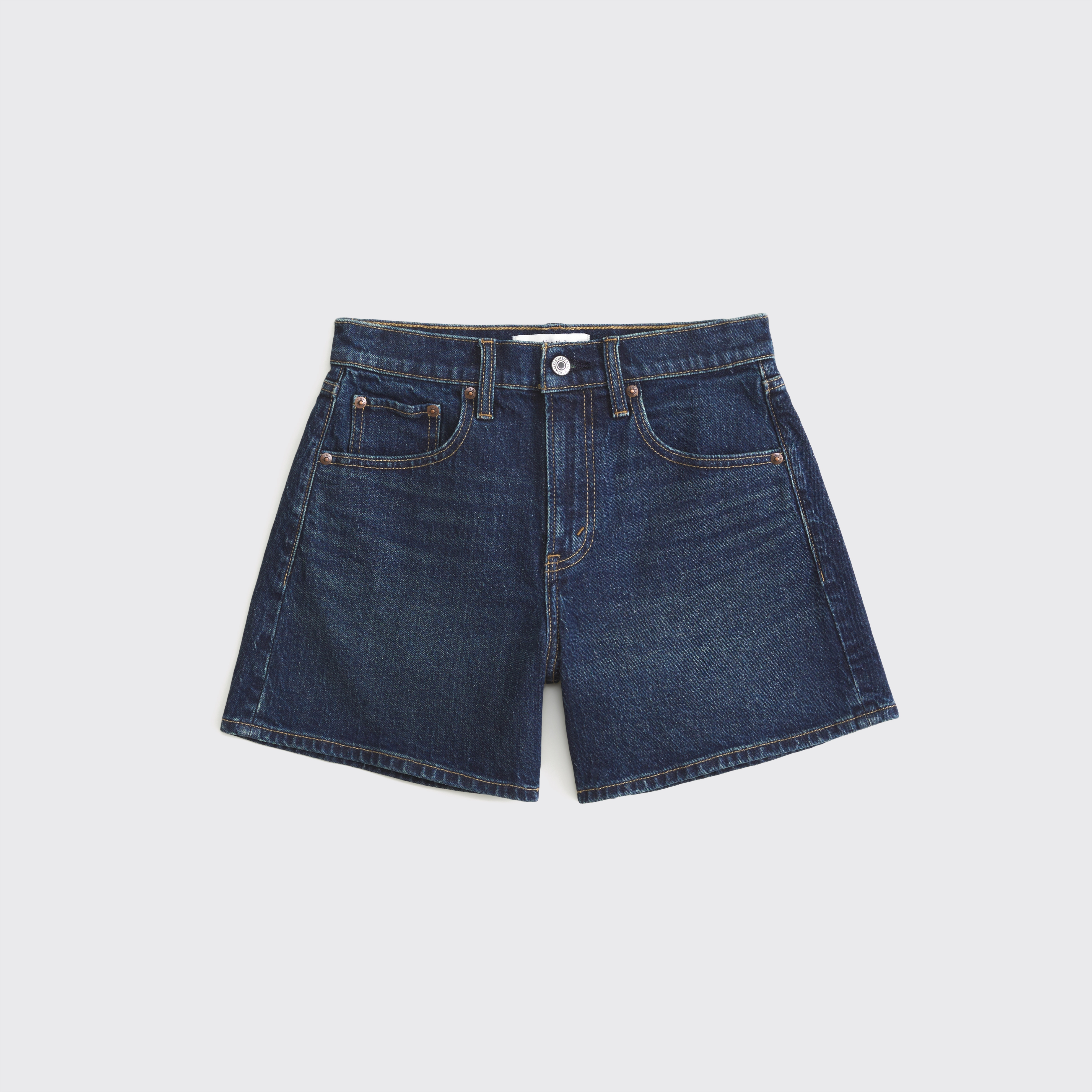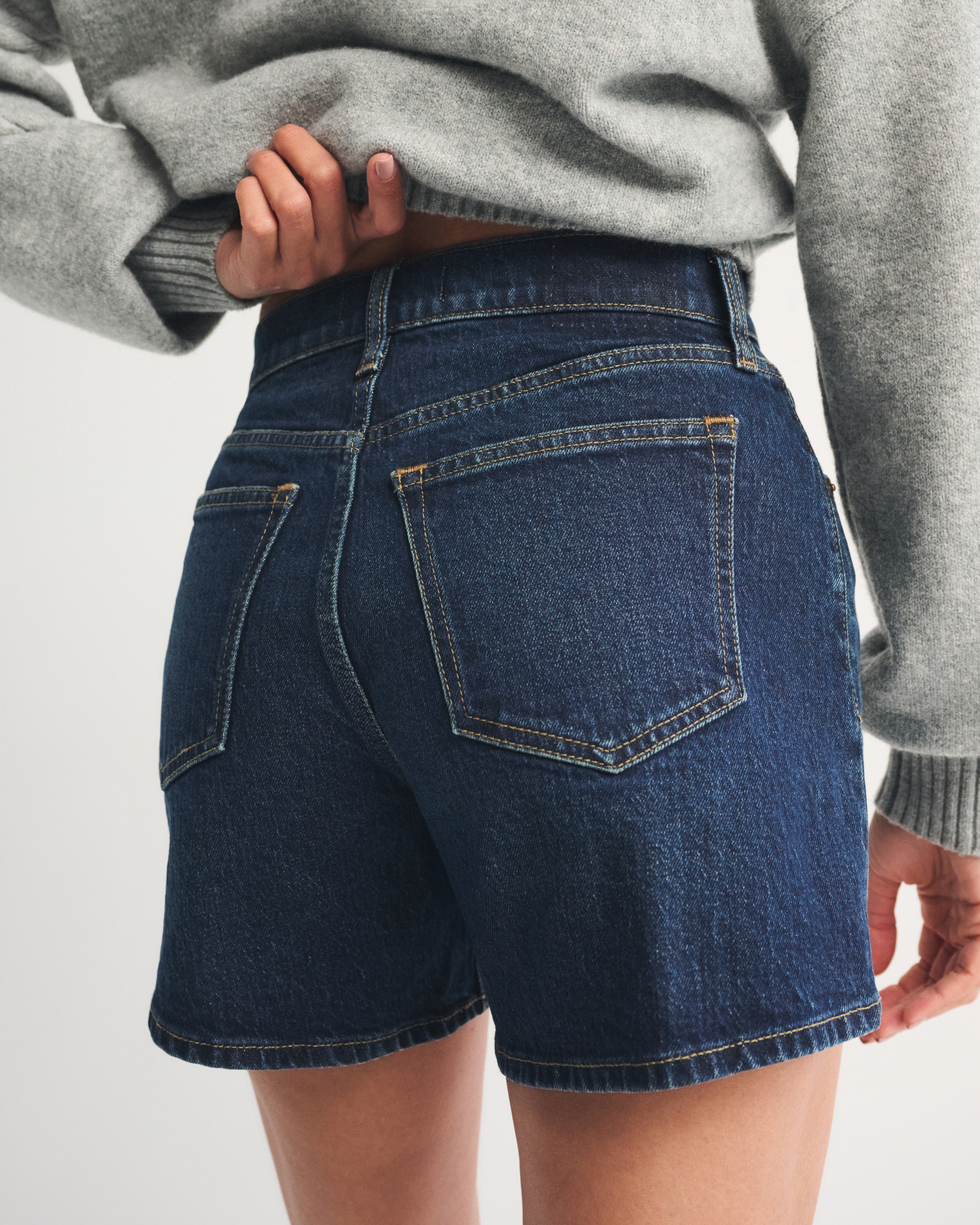High rise with a relaxed fit throughout the hip and thigh, and a 5 inch (13 cm) inseam. Vintage stretch denim in a medium wash, with distressed details and frayed hem. Imported.