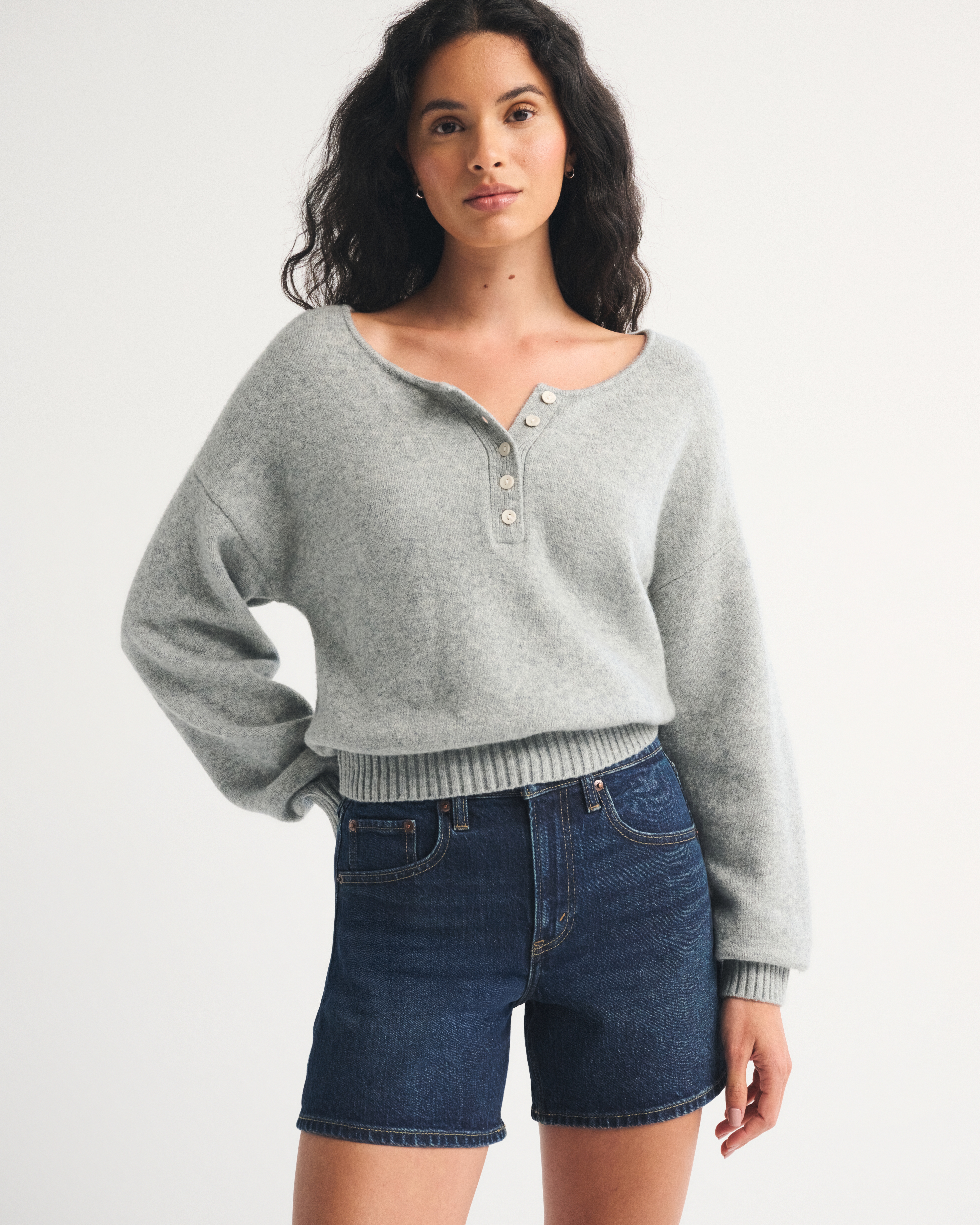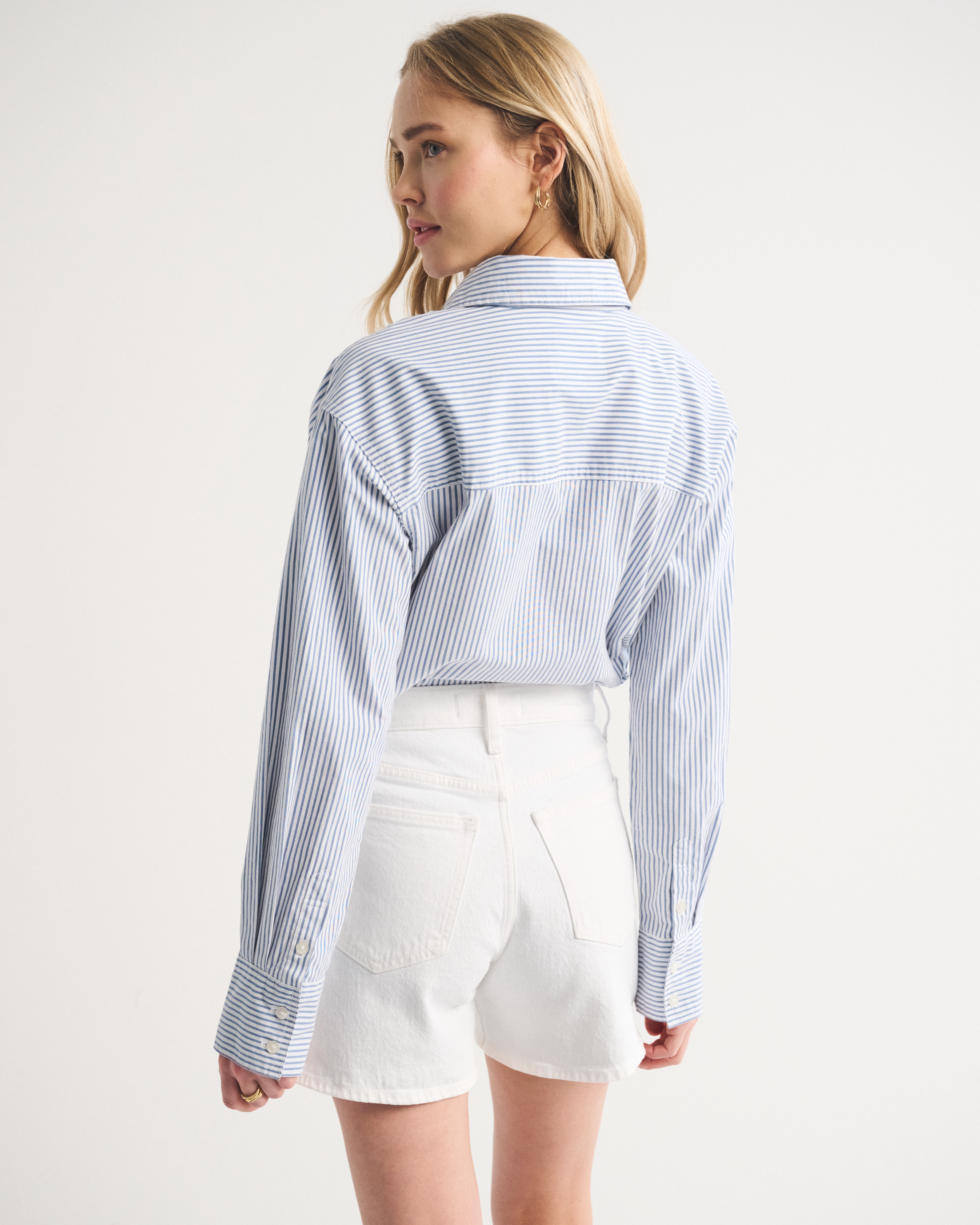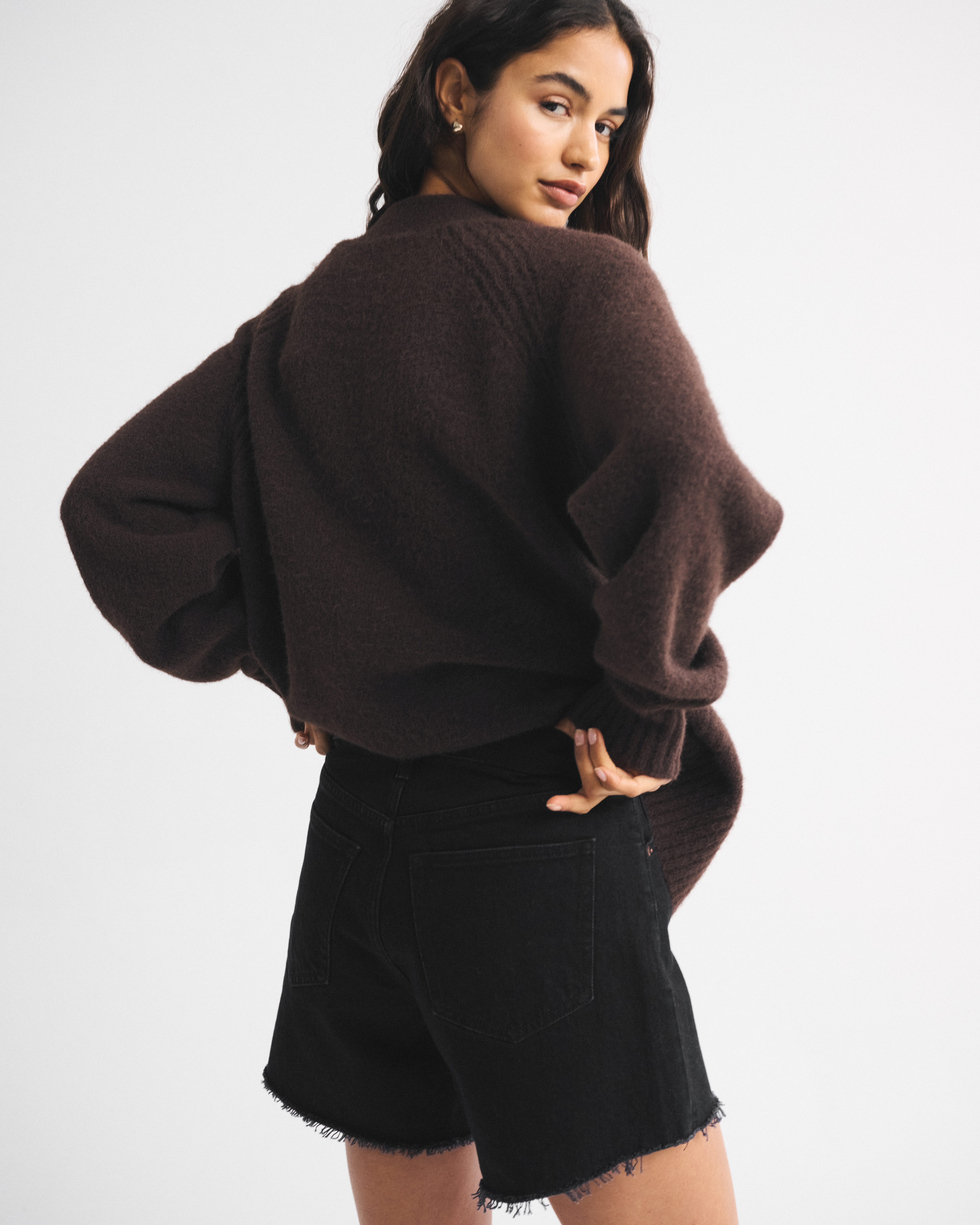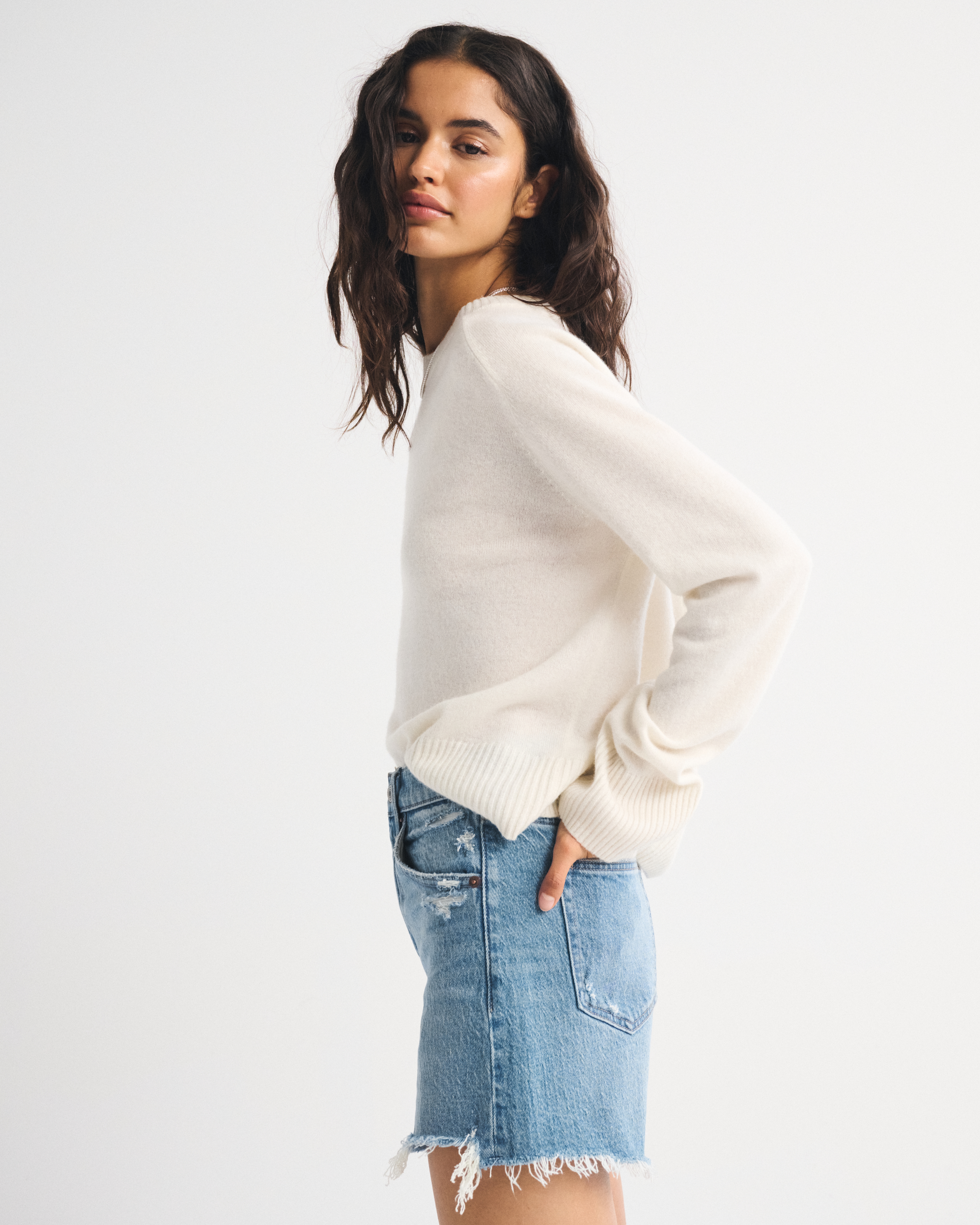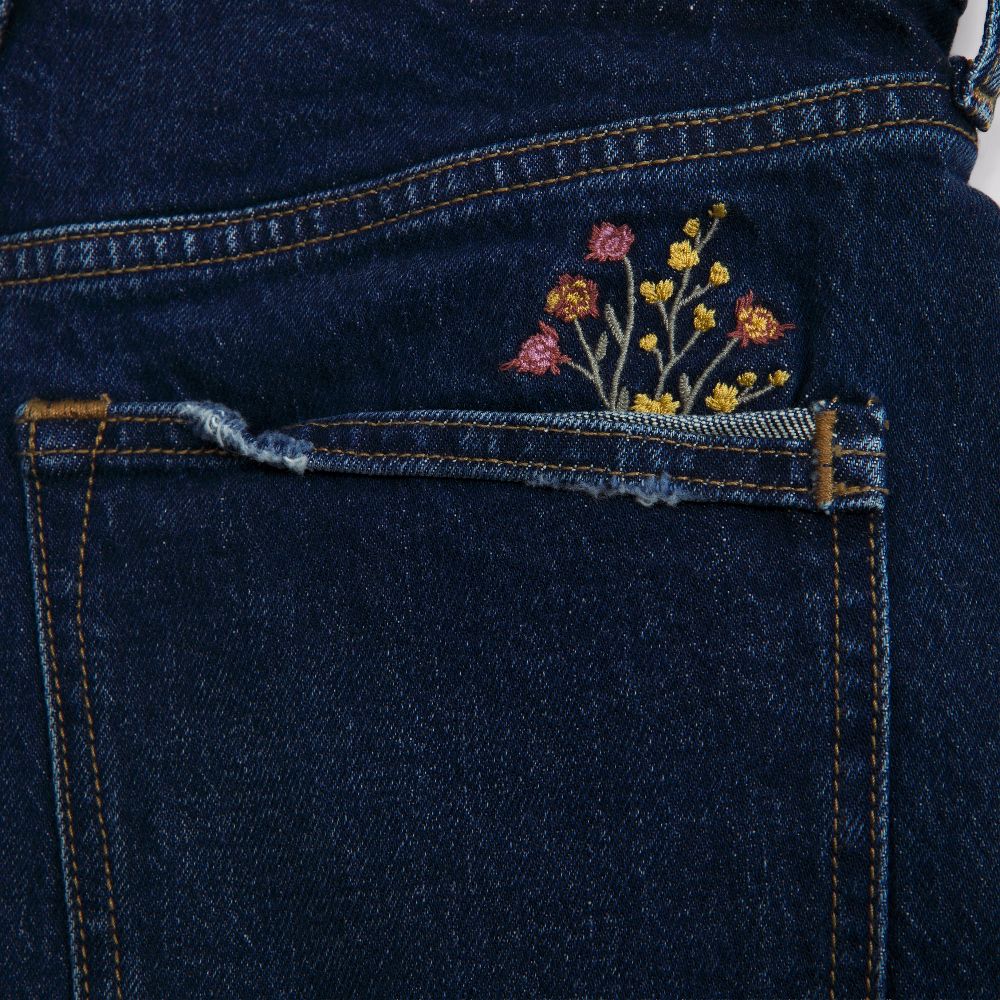 High rise with a relaxed fit throughout the hip and thigh, and a 5 inch (13 cm) inseam. Vintage stretch denim in a medium wash, with distressed details and frayed hem. Imported.
