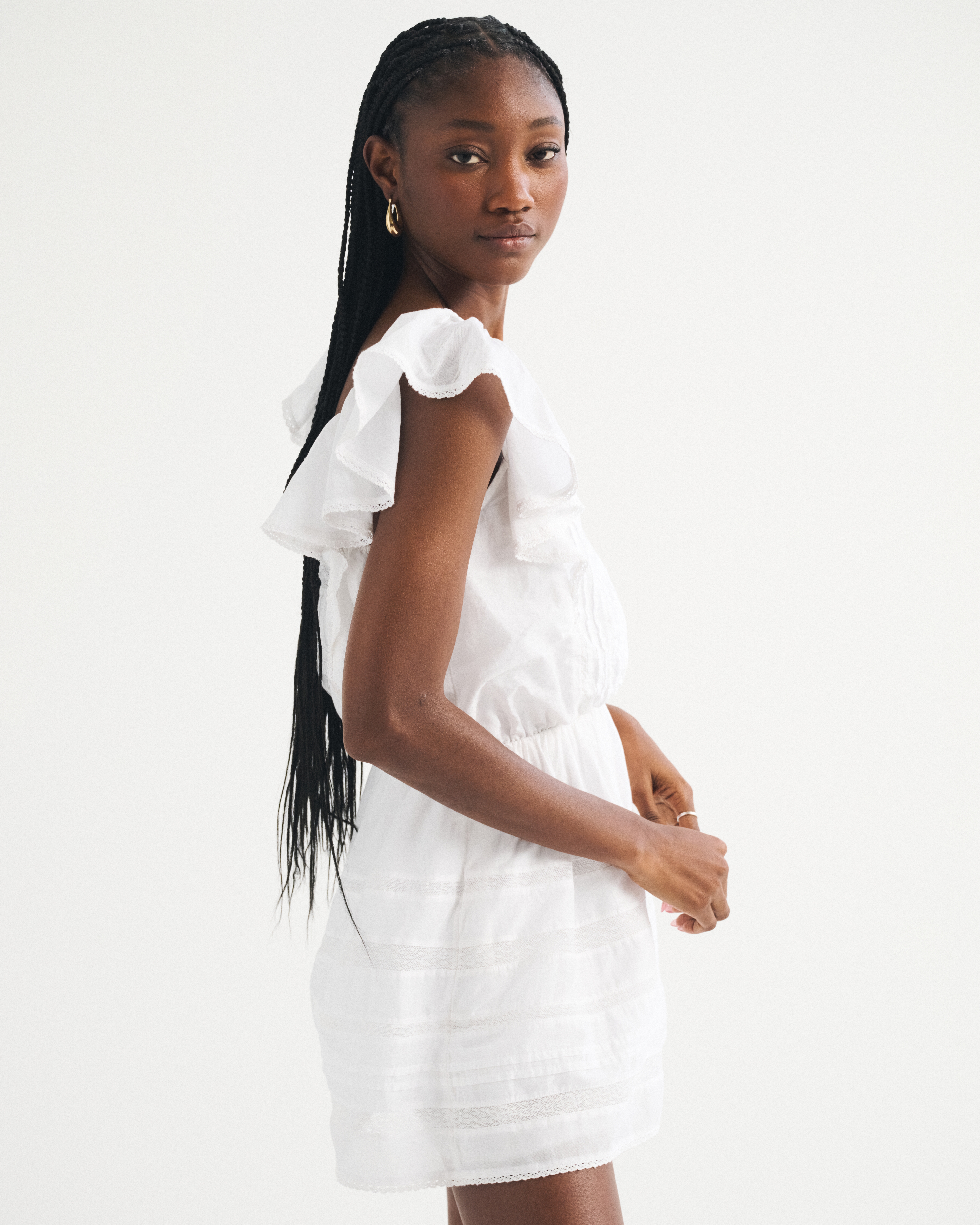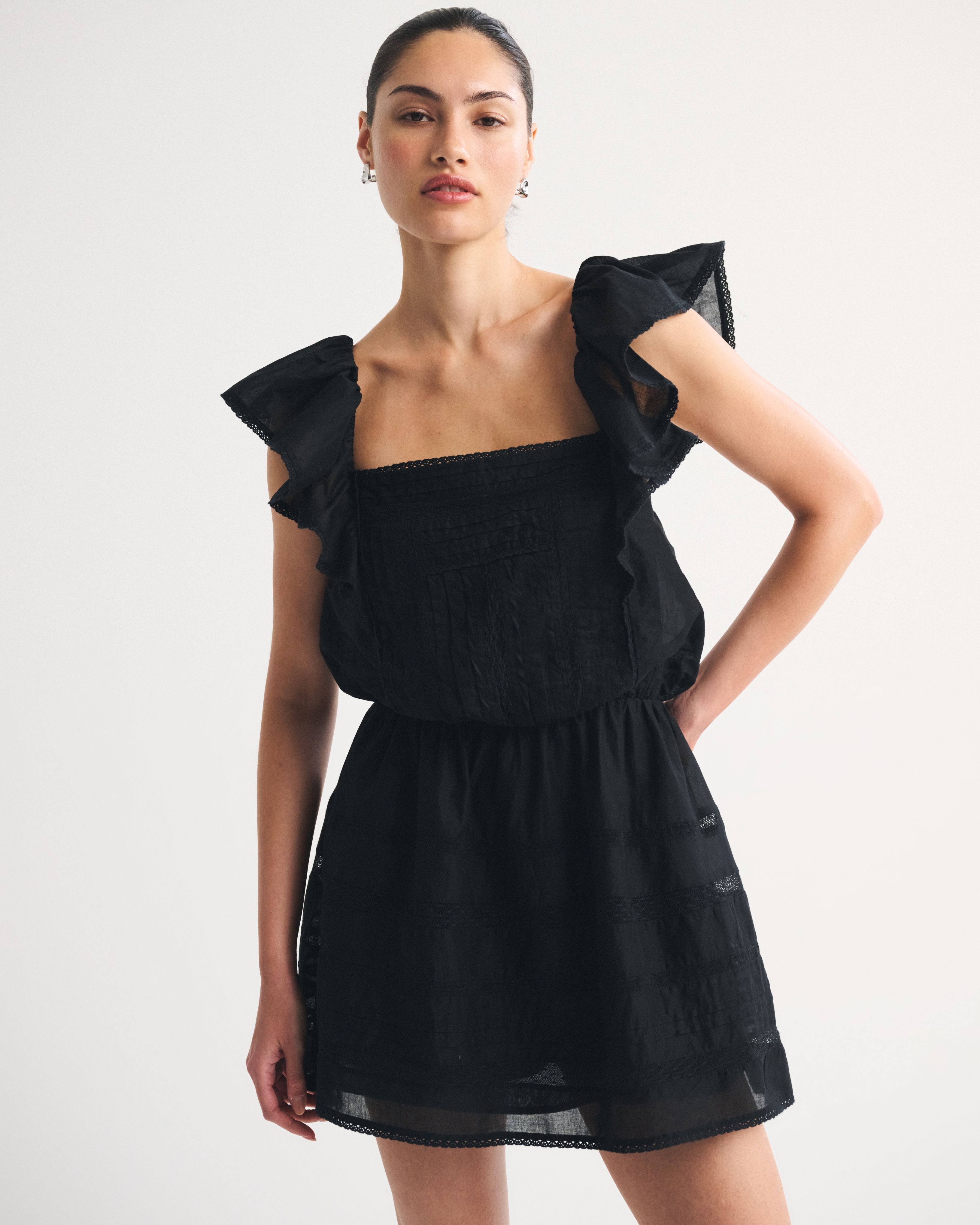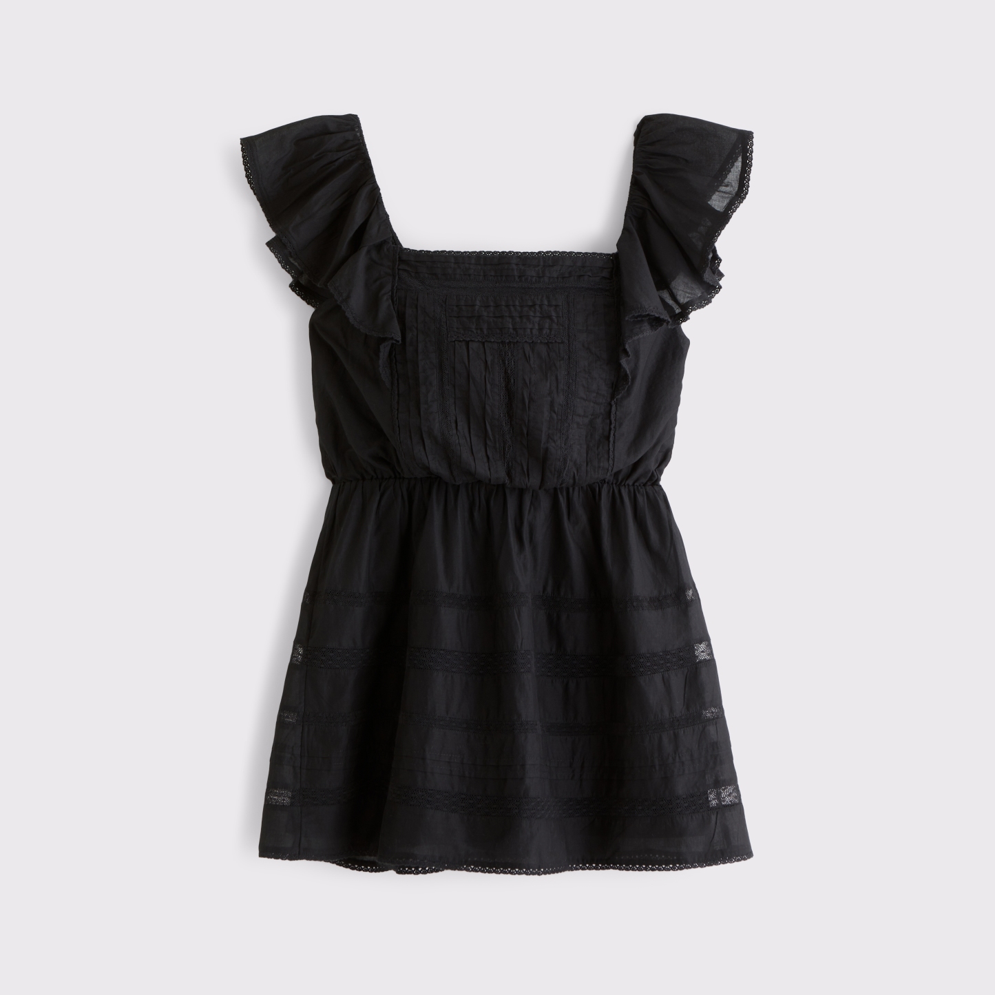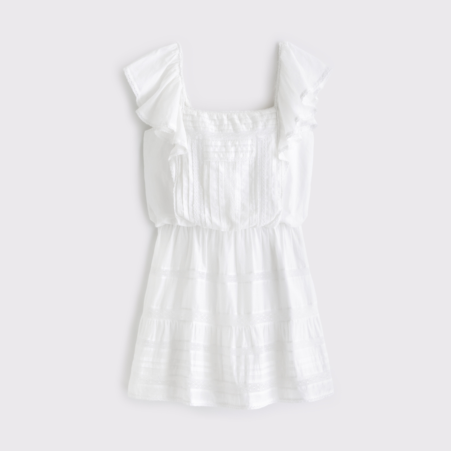 Flattering mini dress in our classic cotton-blend fabric with an easy waist silhouette. Features a square neckline, flattering ruffle angel sleeves, lace-trim and embroidered details along the bodice and built-in shorts. Imported.