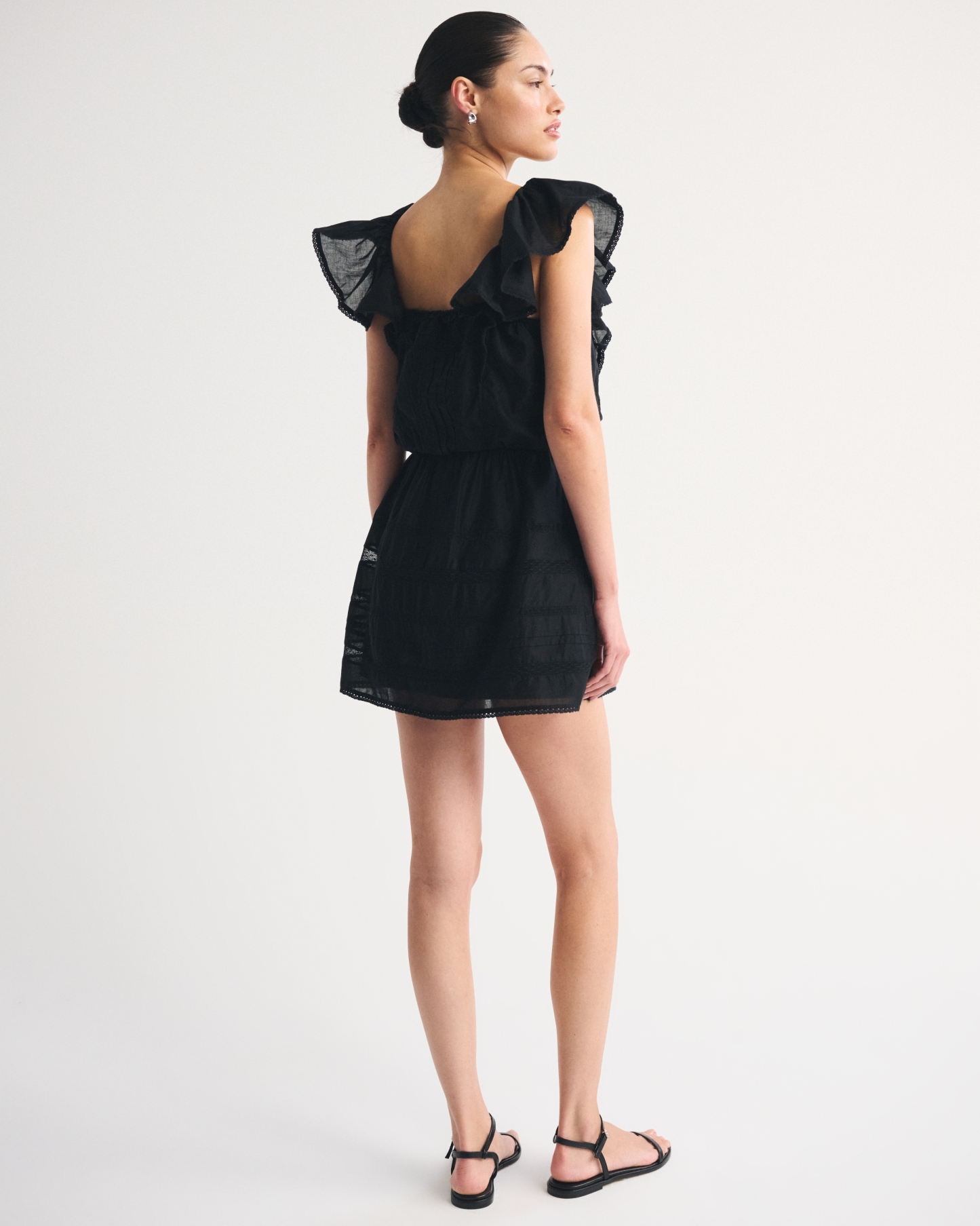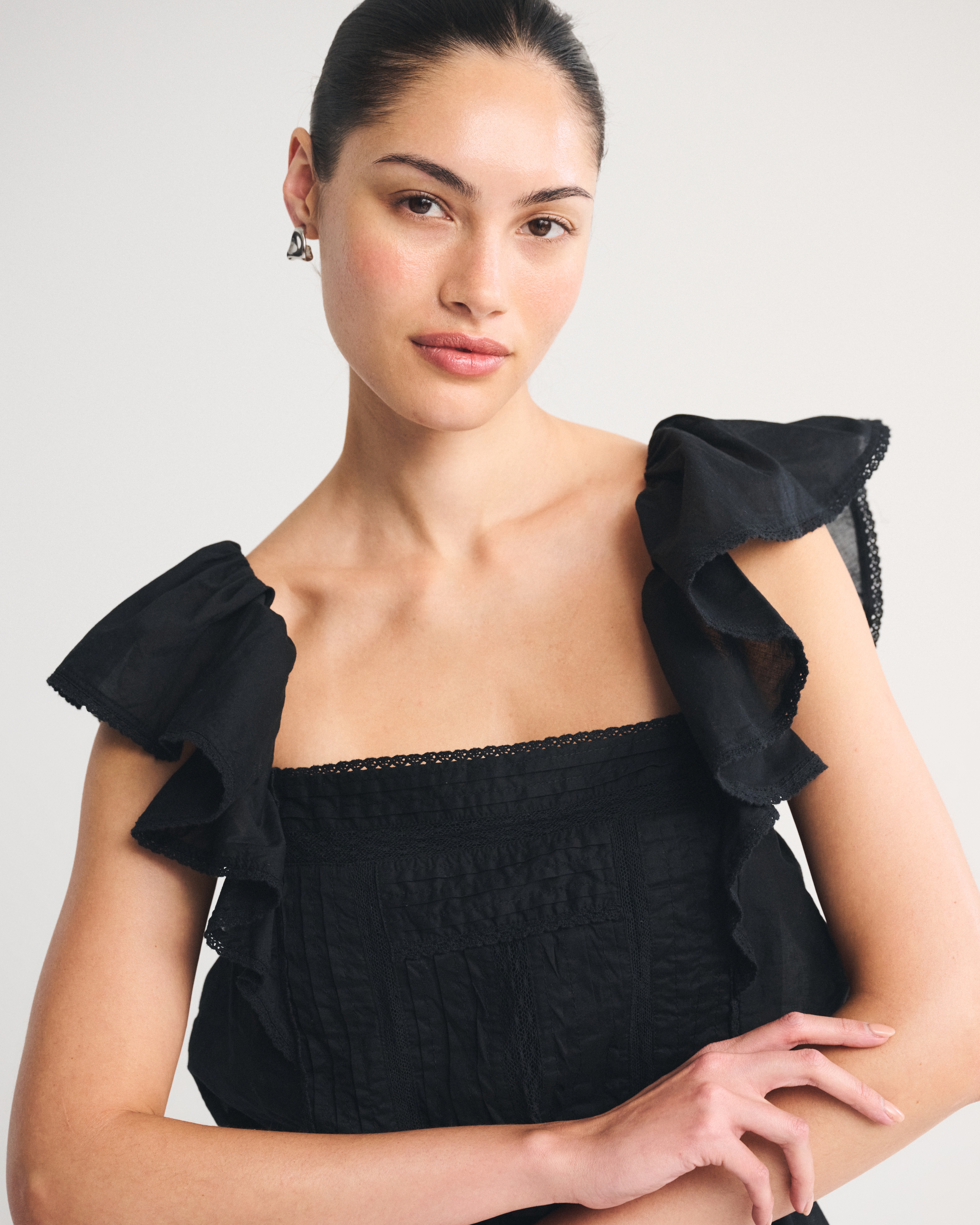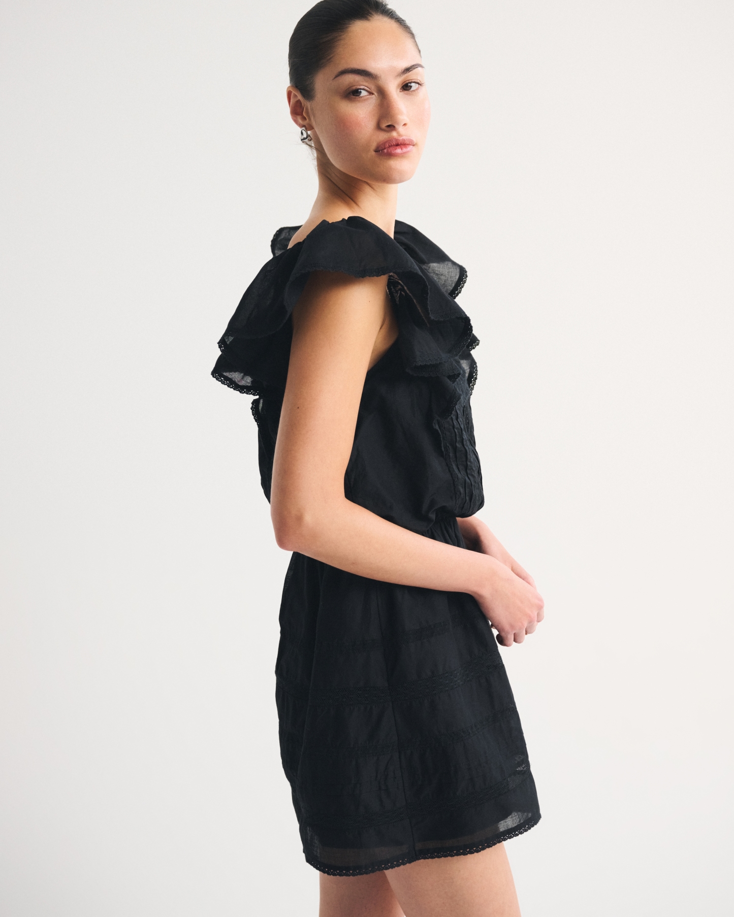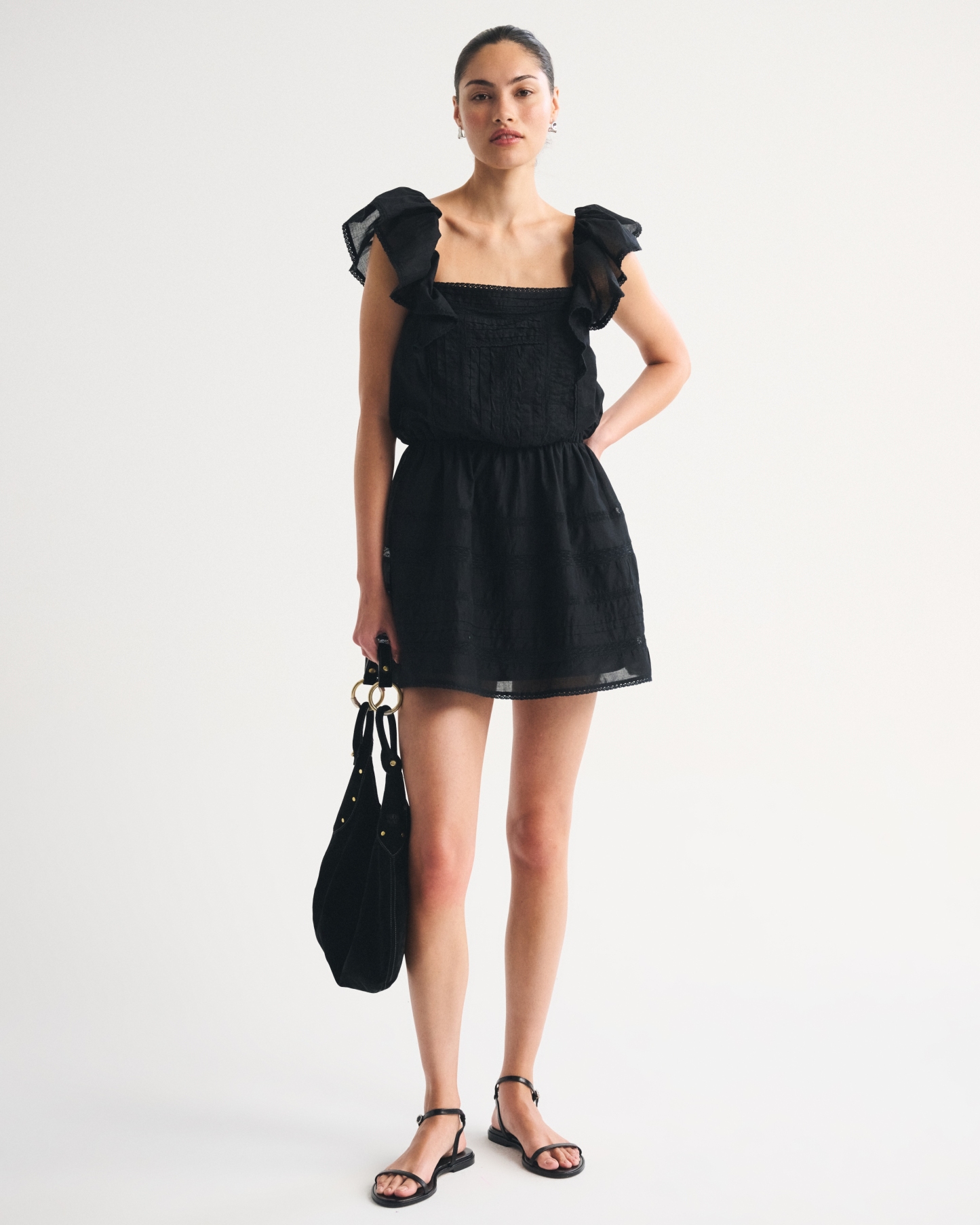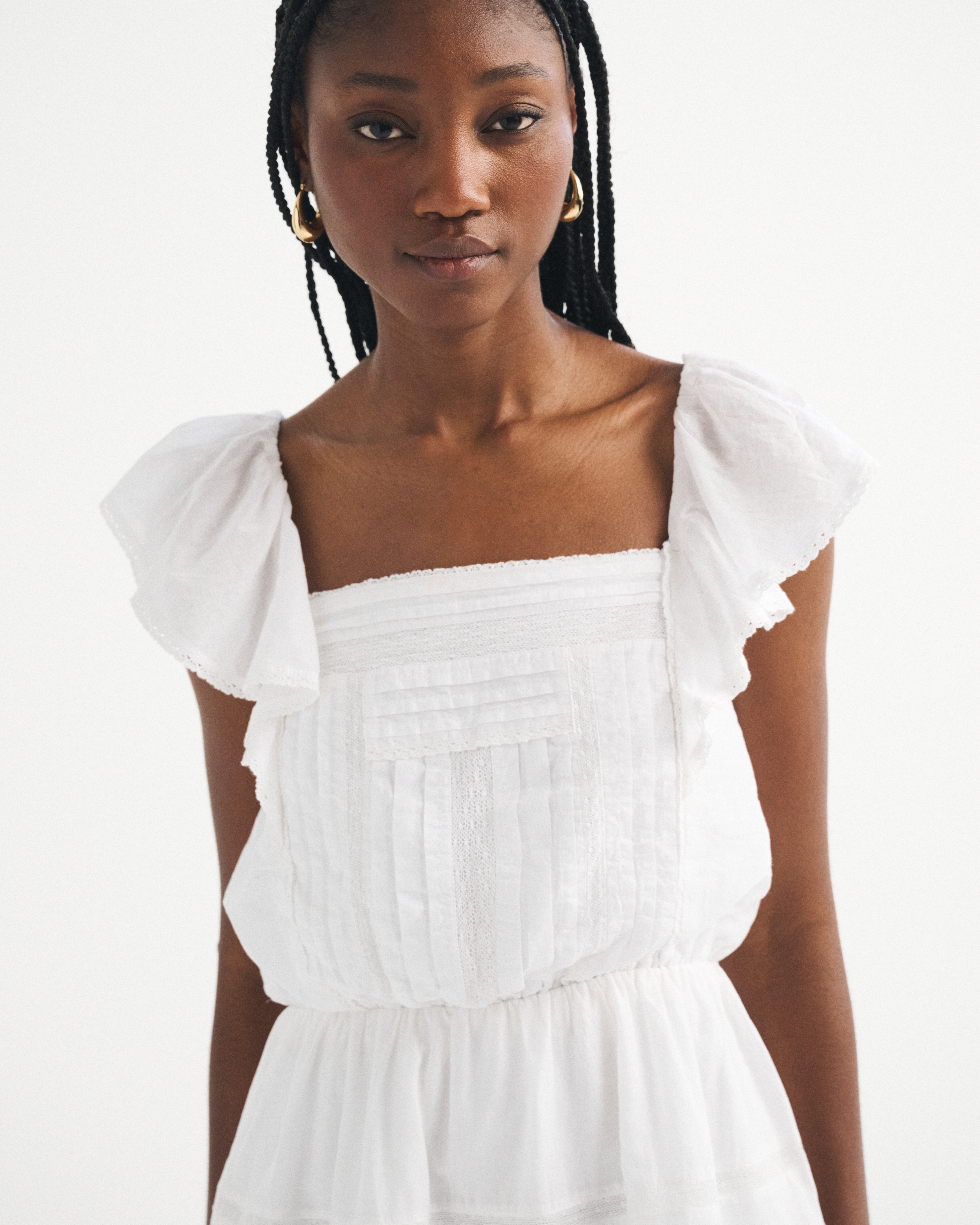 Flattering mini dress in our classic cotton-blend fabric with an easy waist silhouette. Features a square neckline, flattering ruffle angel sleeves, lace-trim and embroidered details along the bodice and built-in shorts. Imported.
