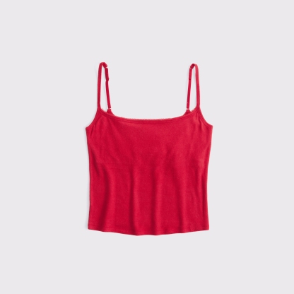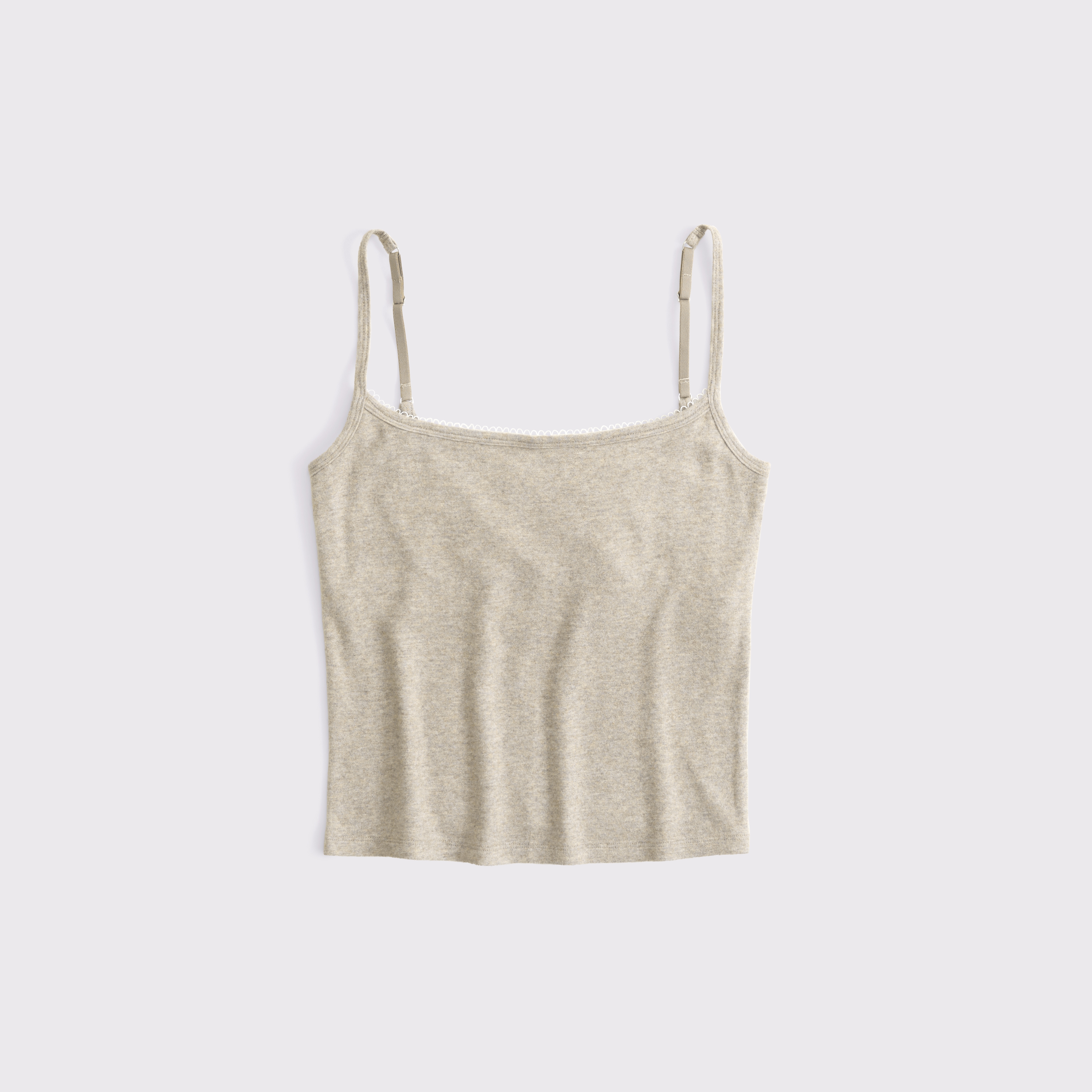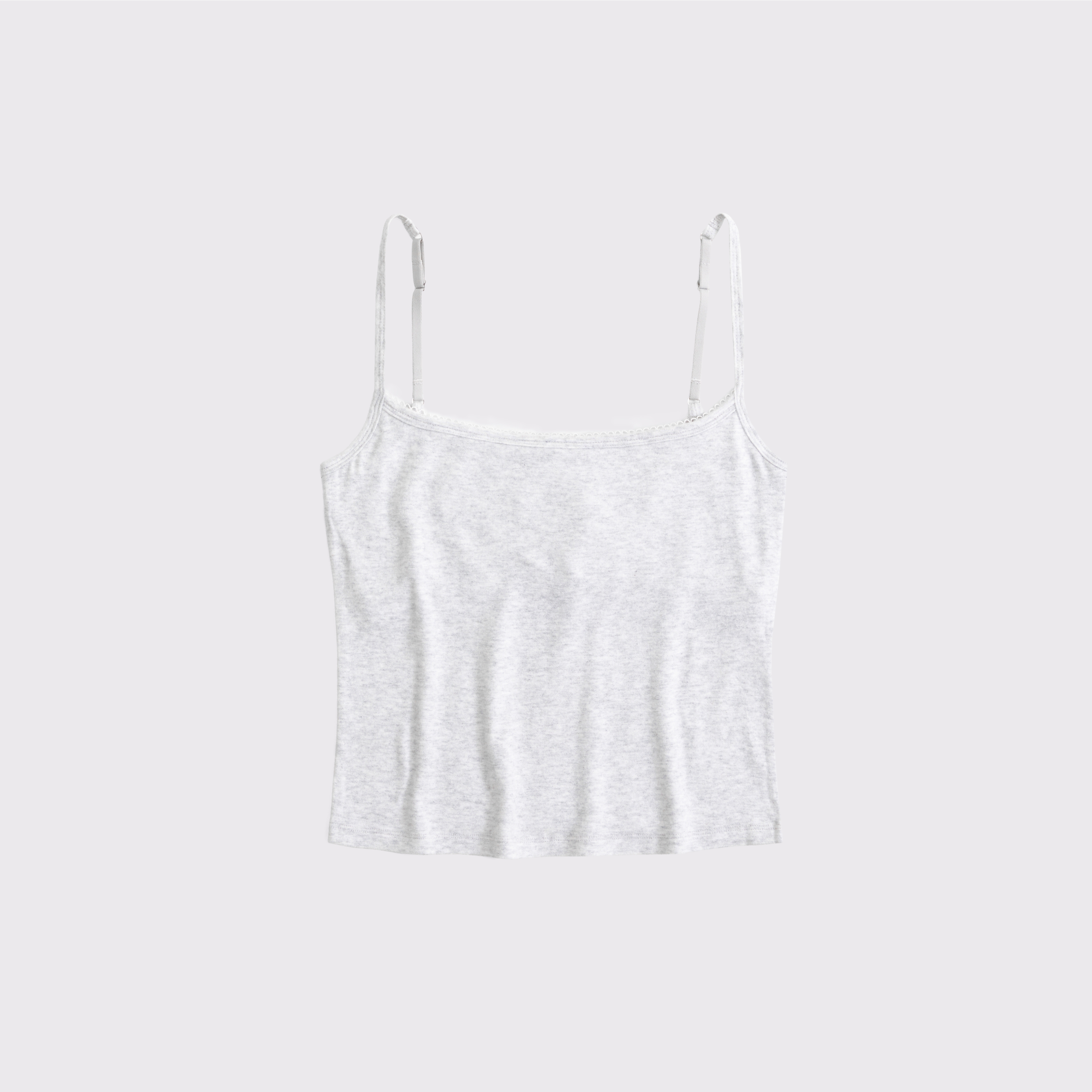 Slim-fitting 90's style top in our soft cozy lounge knit fabric. Features adjustable cami straps and picot-trim detail at the scoop neckline. Imported.
