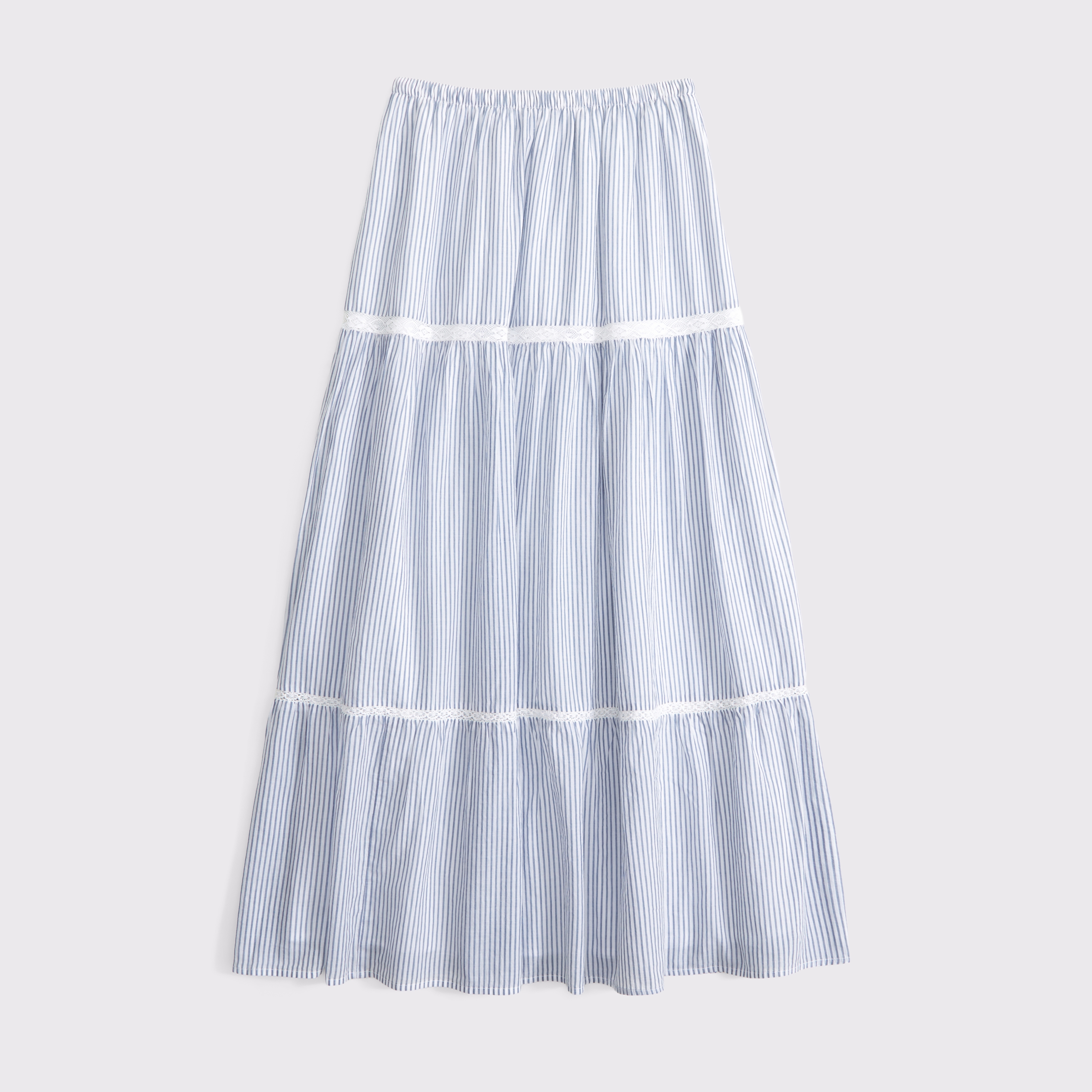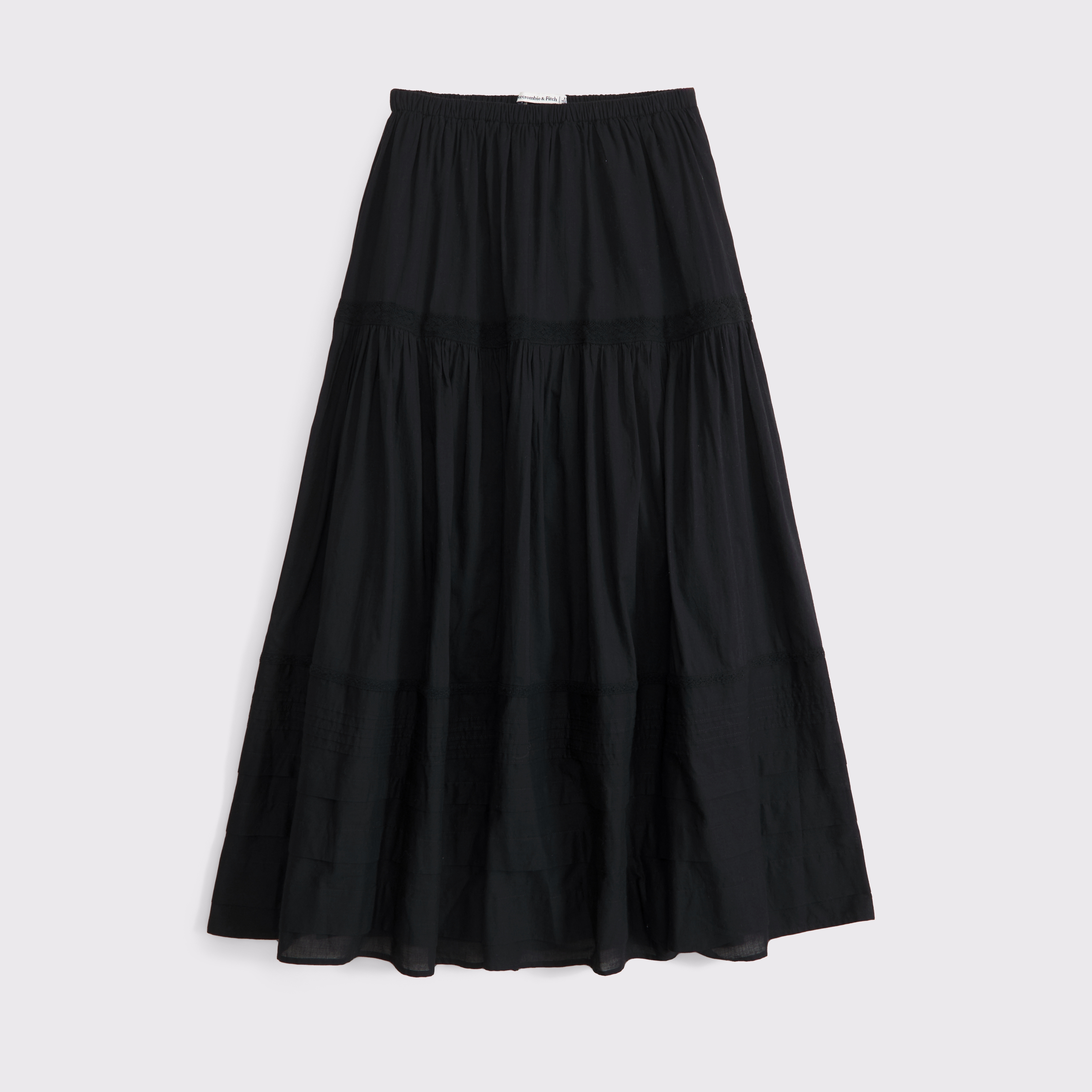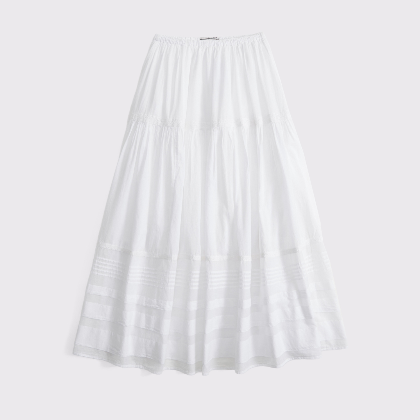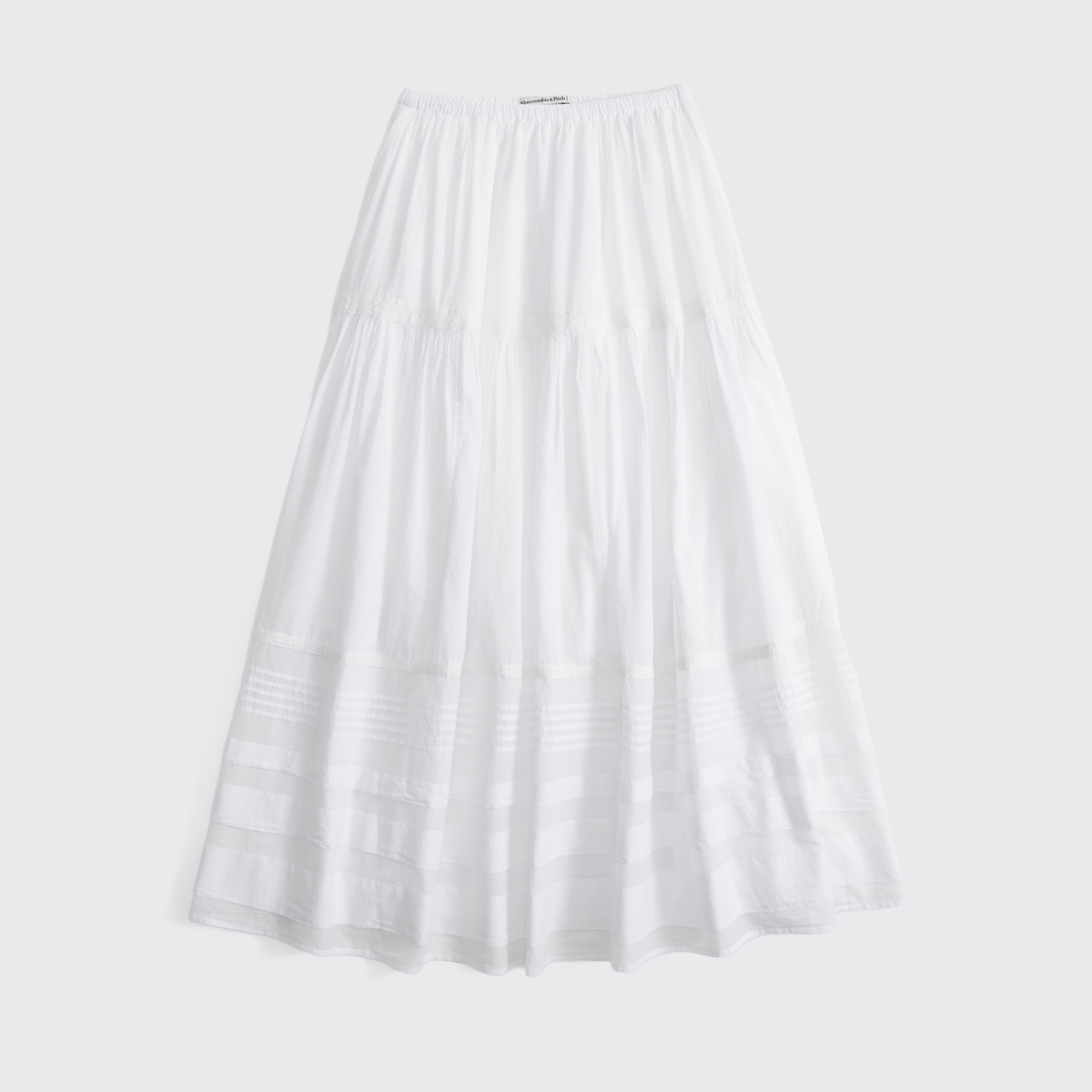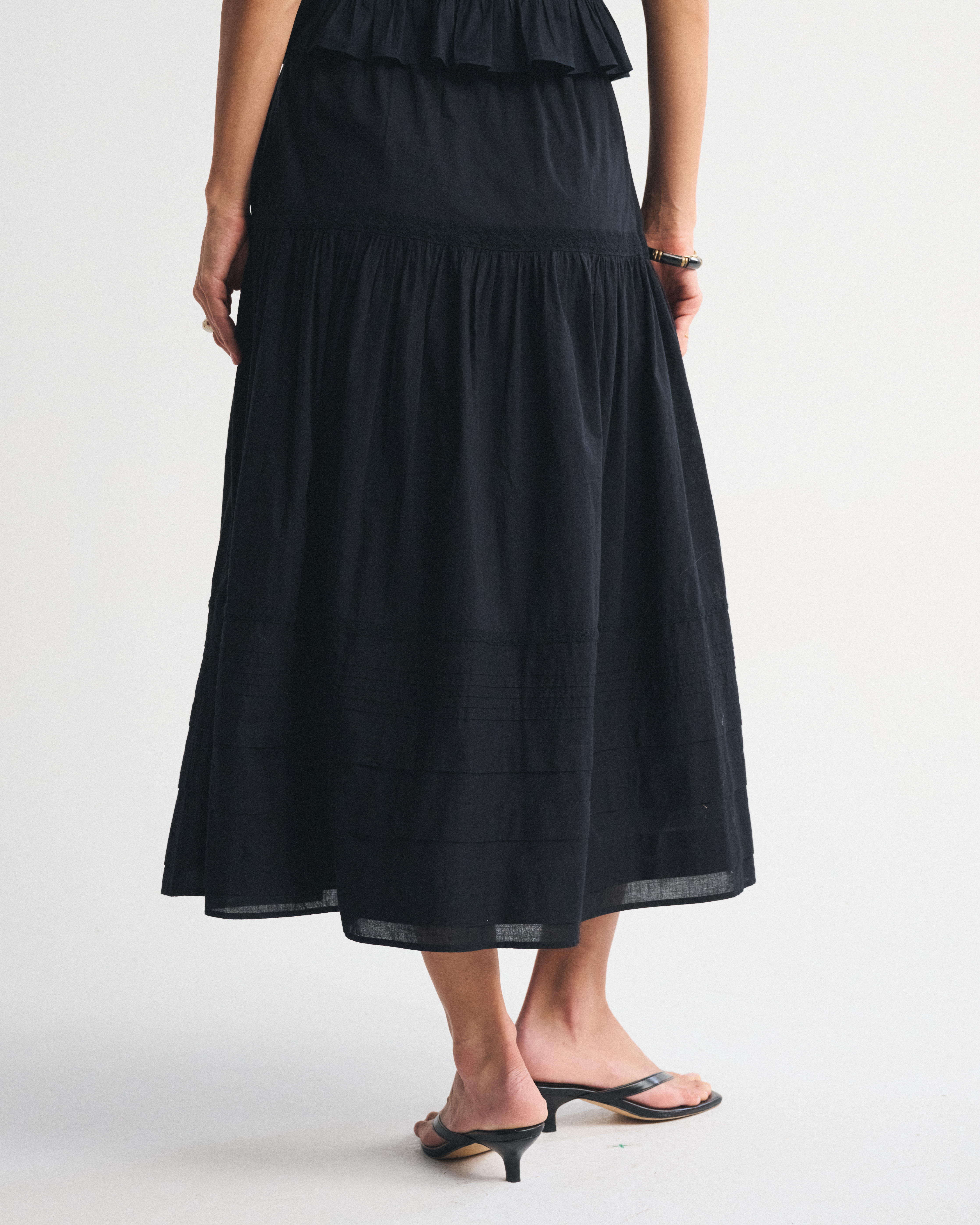 Our high rise maxi skirt in our soft cotton fabric. Features a full-length skirt, lace trim and pintuck details throughout and a pull-on style elasticated waistband. Imported.