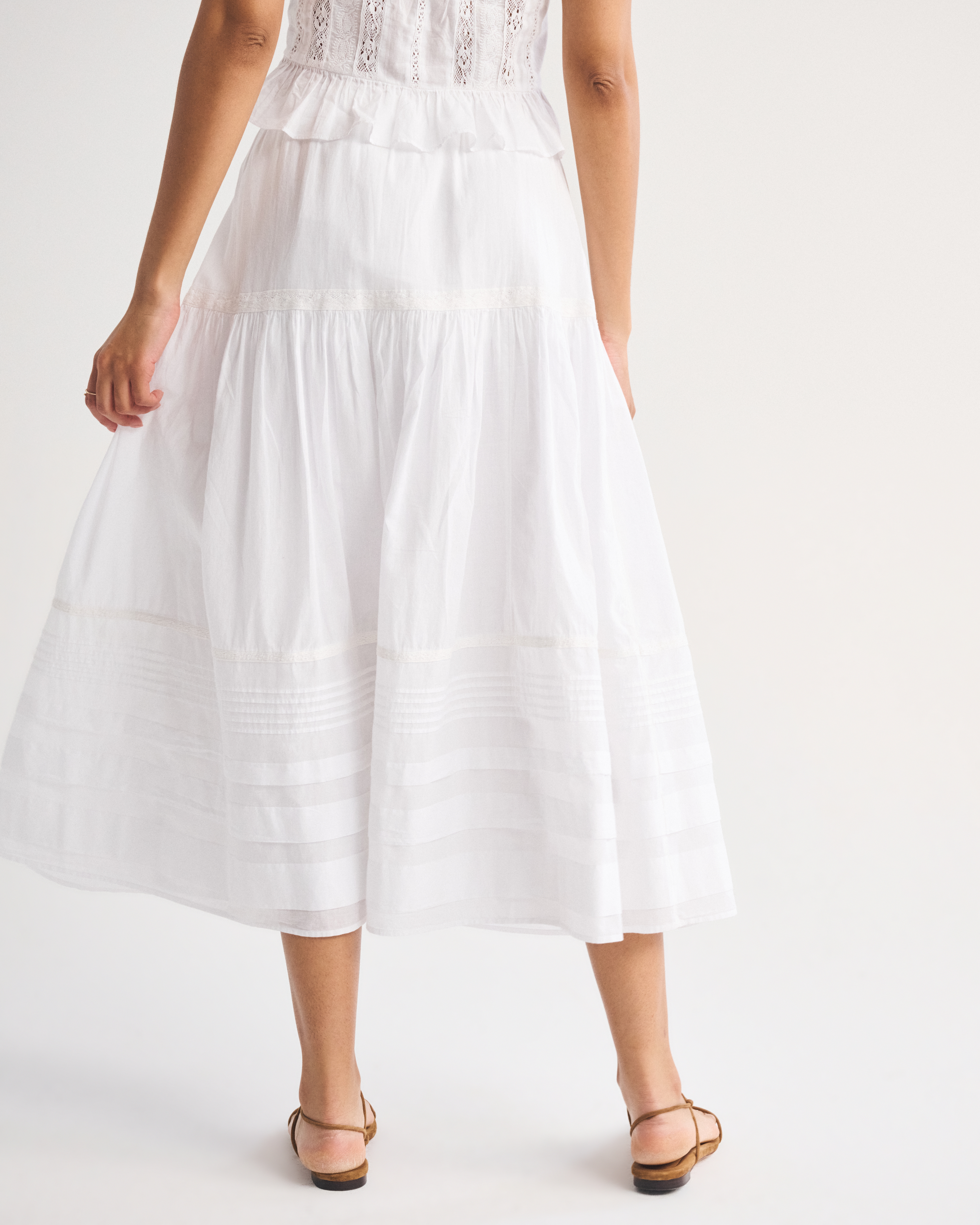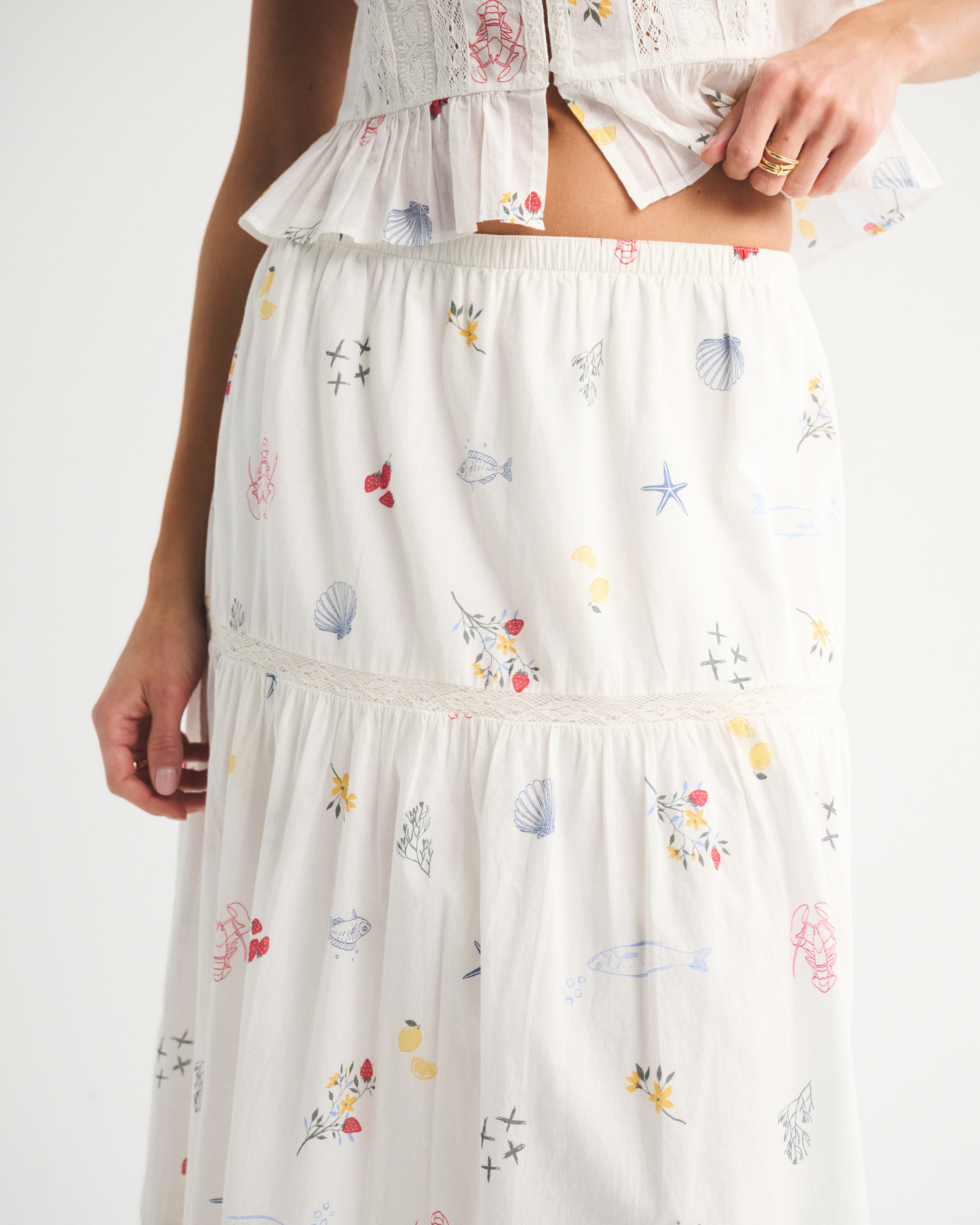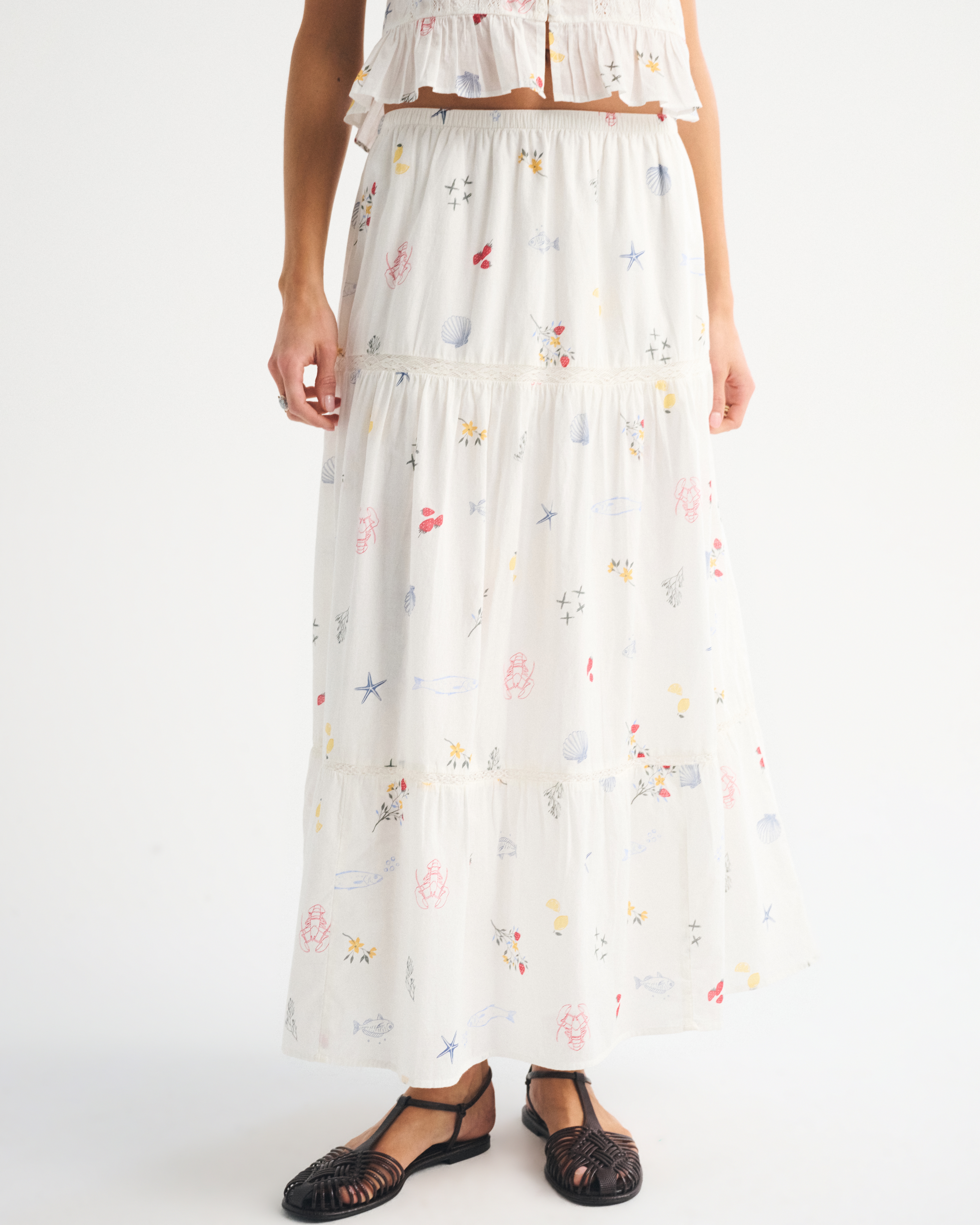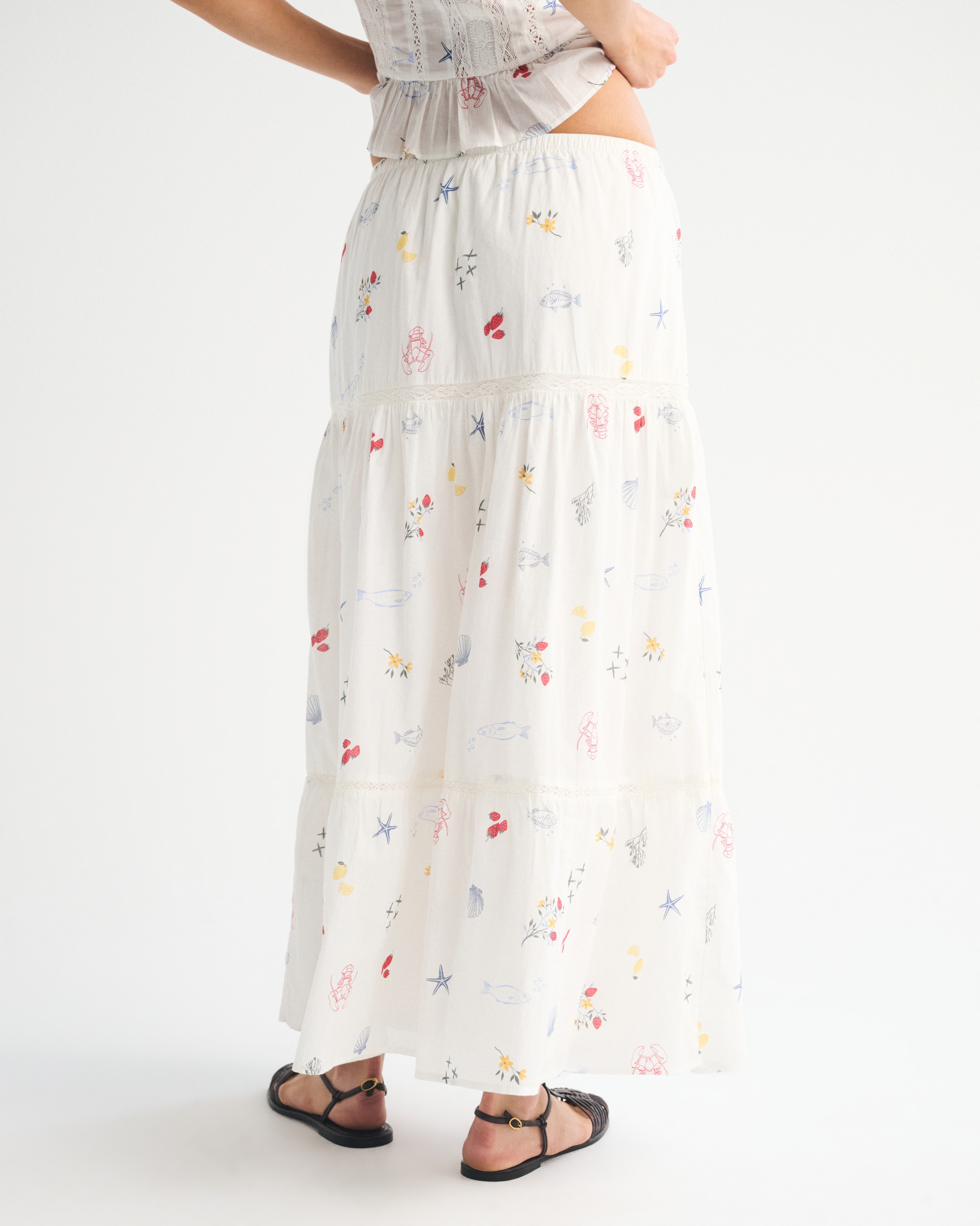 Our high rise maxi skirt in our soft cotton fabric. Features a full-length skirt, lace trim and pintuck details throughout and a pull-on style elasticated waistband. Imported.