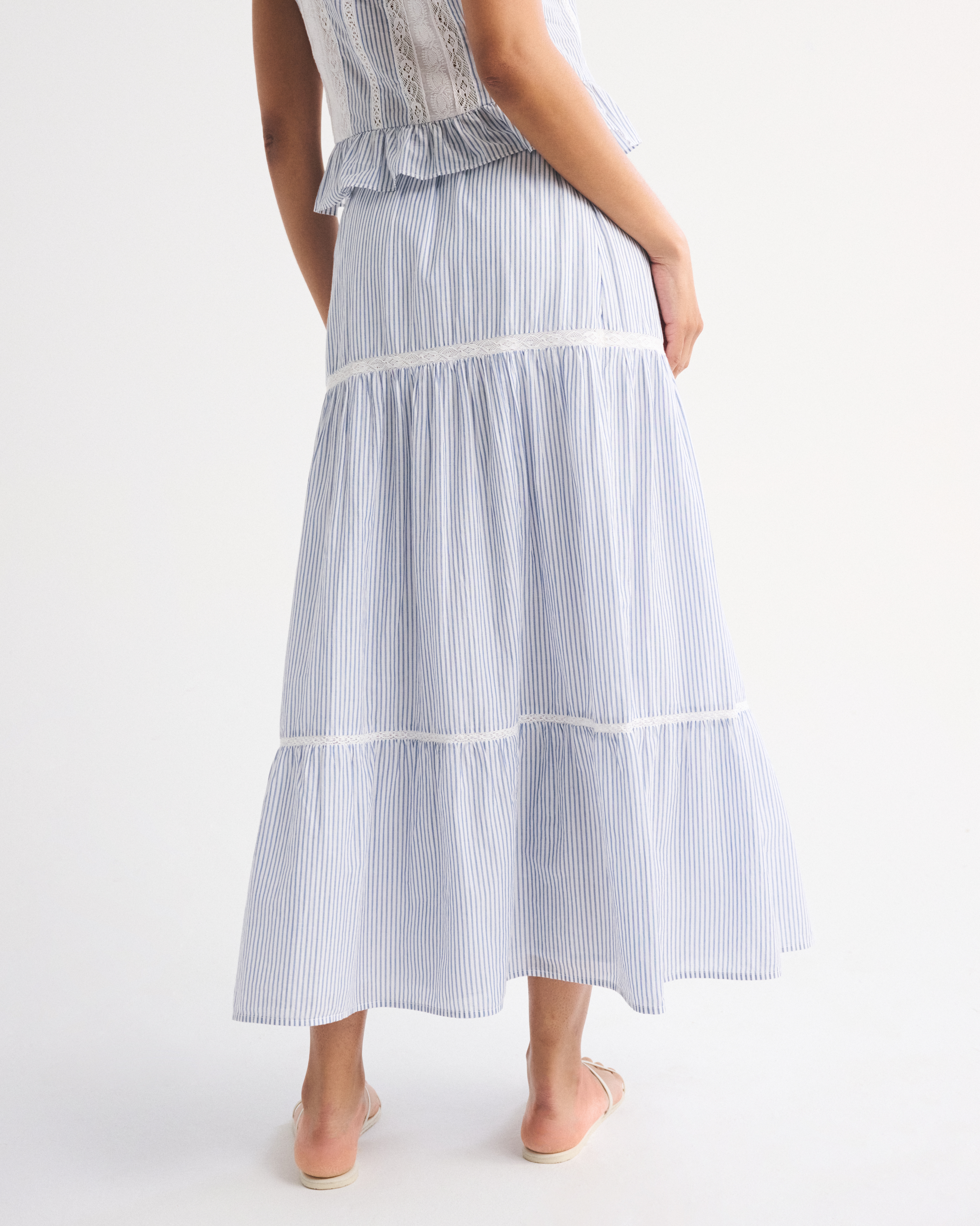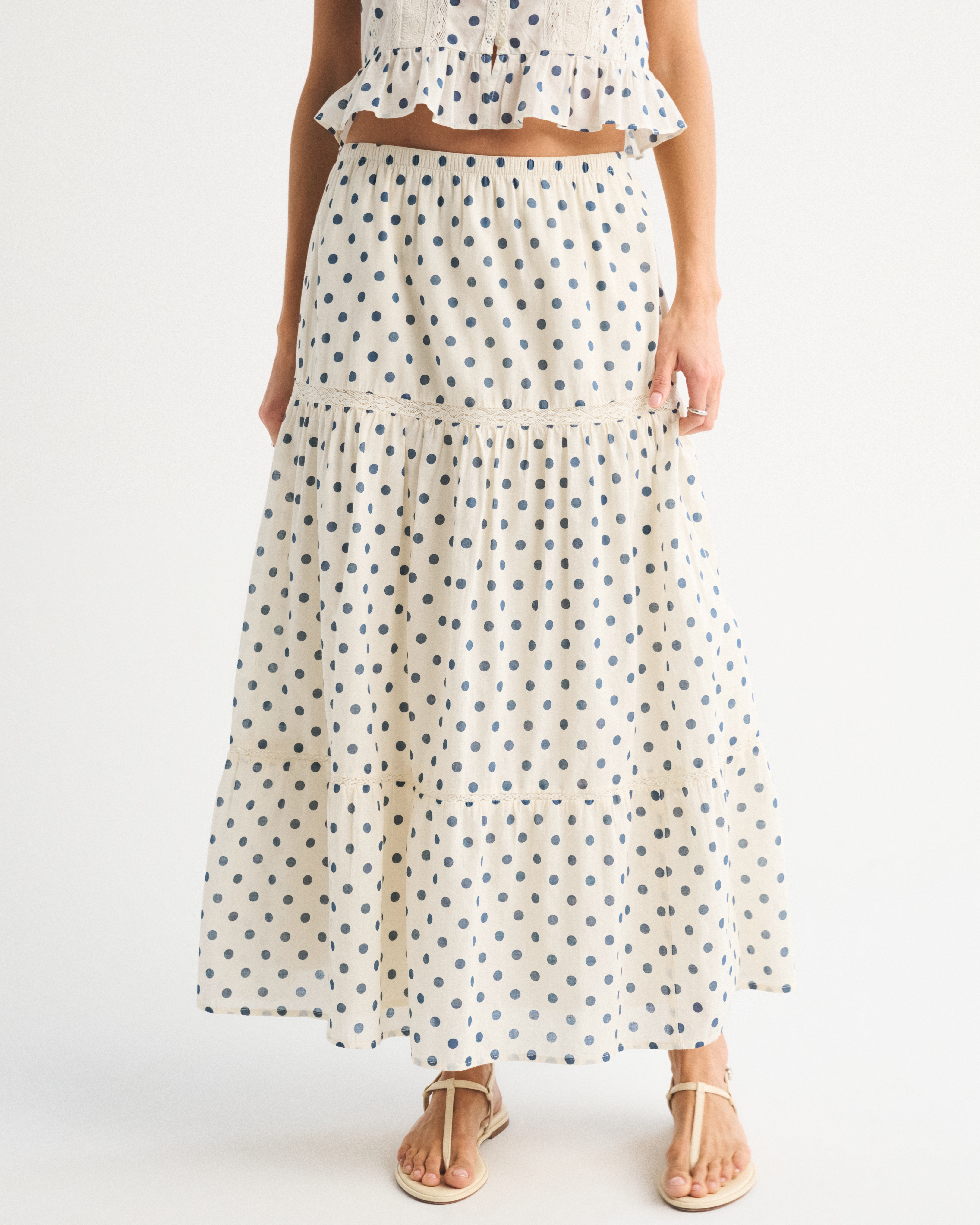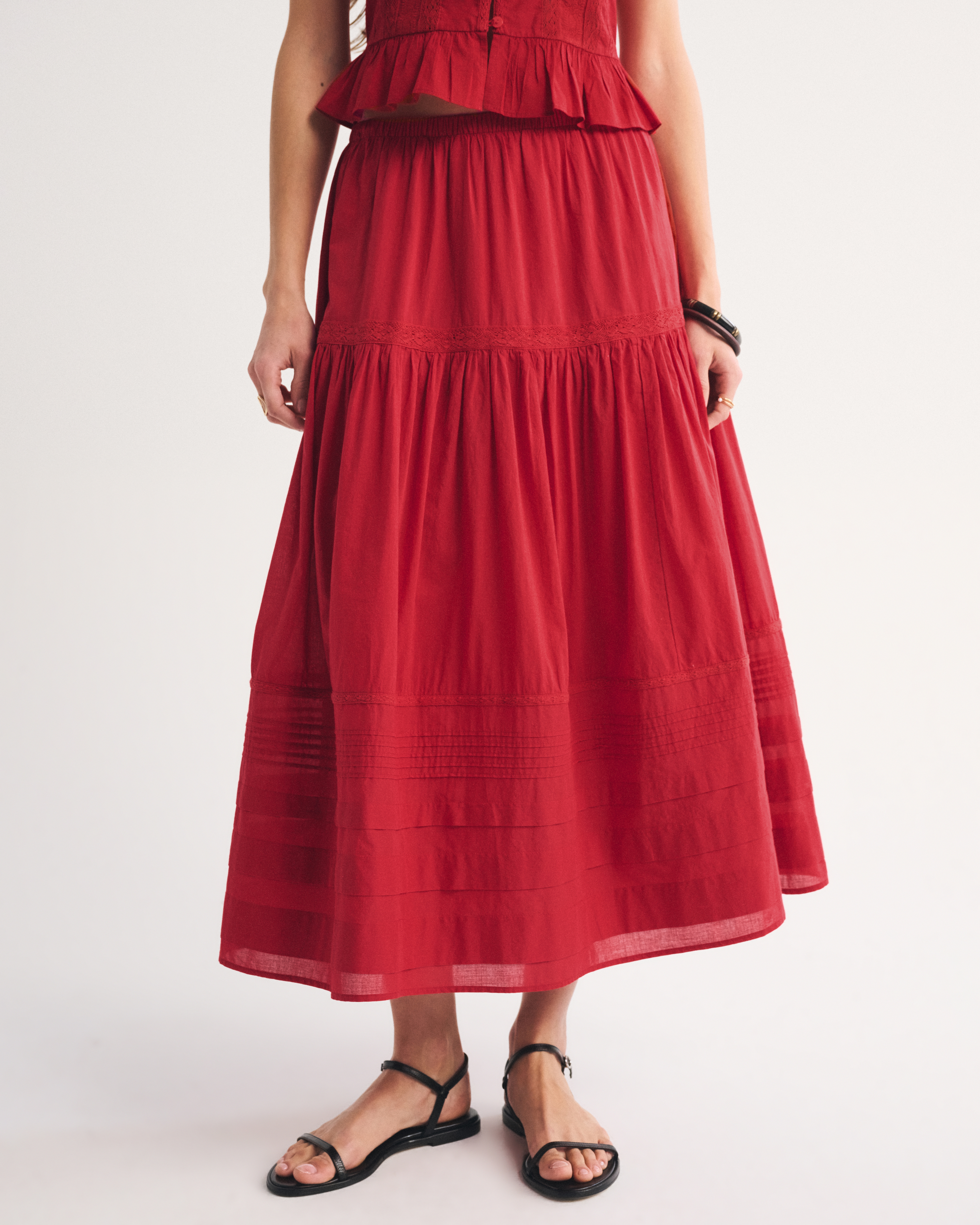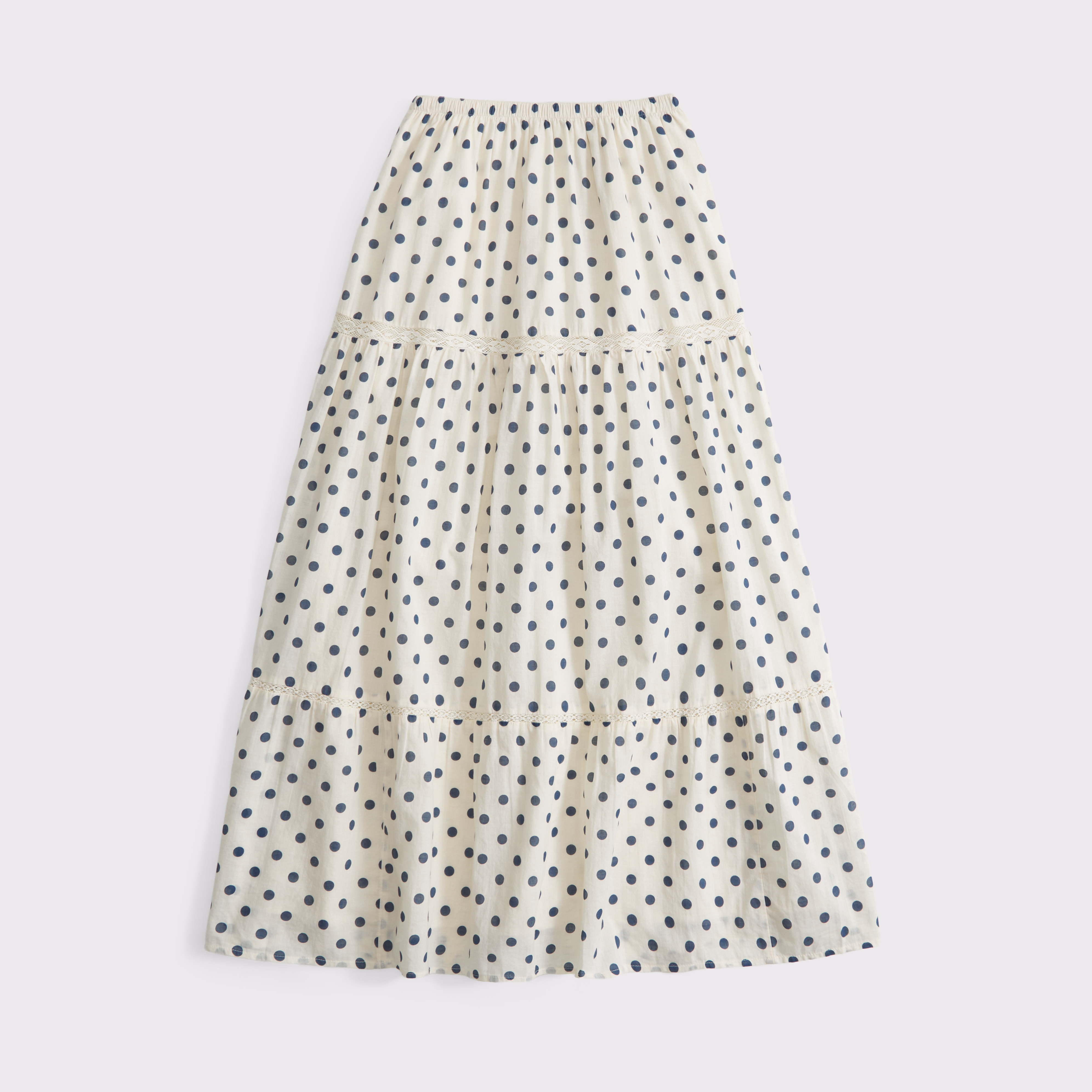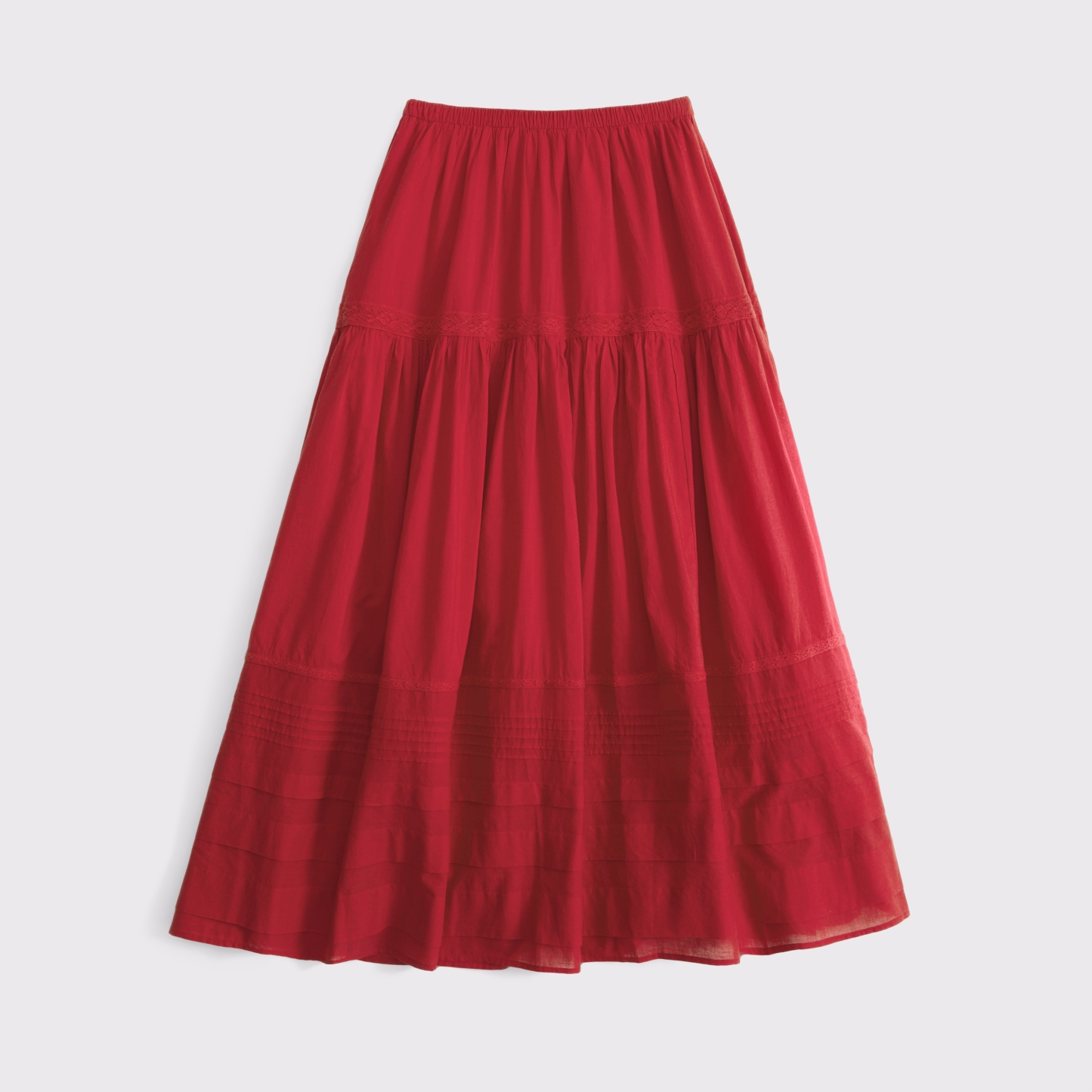 Our high rise maxi skirt in our soft cotton fabric. Features a full-length skirt, lace trim and pintuck details throughout and a pull-on style elasticated waistband. Imported.