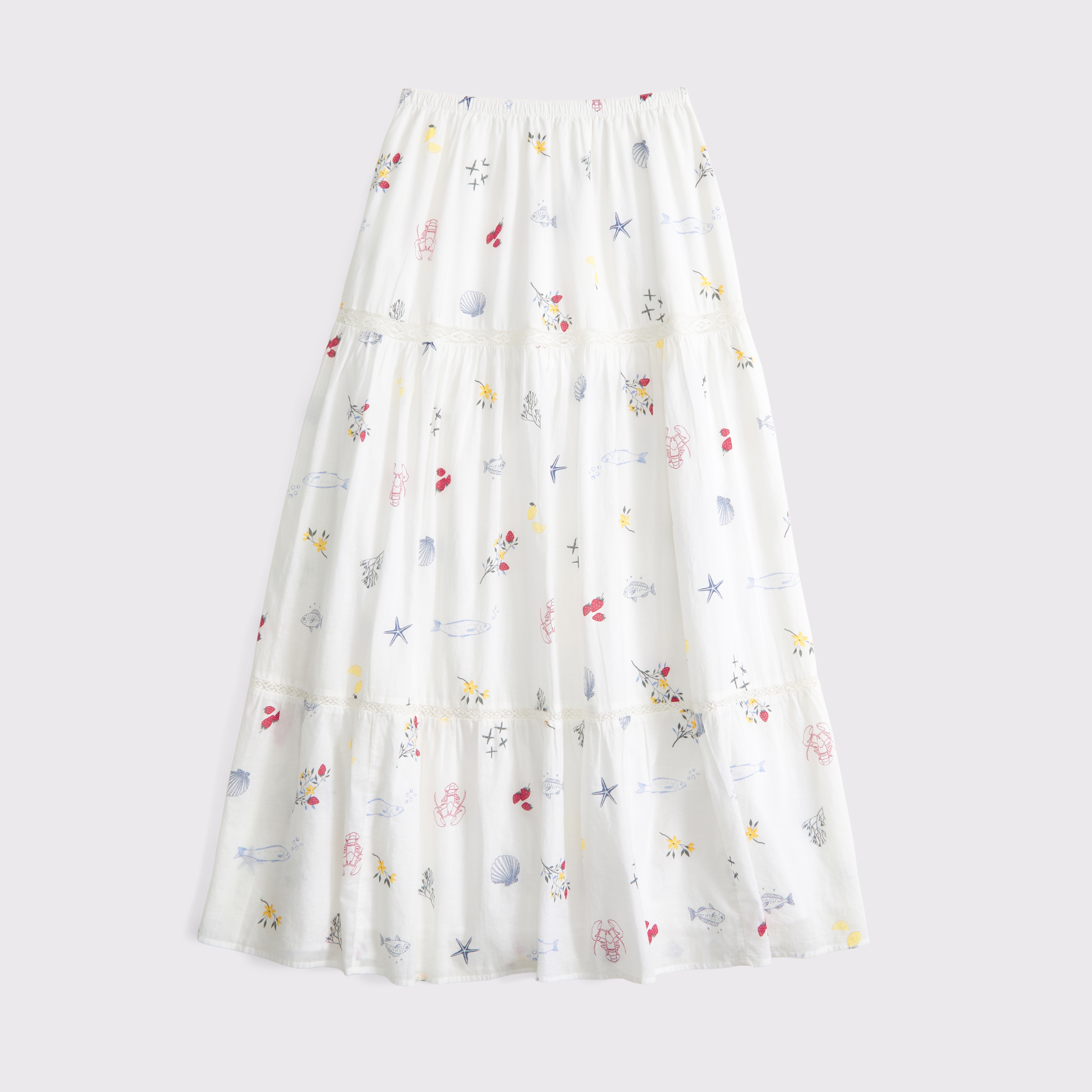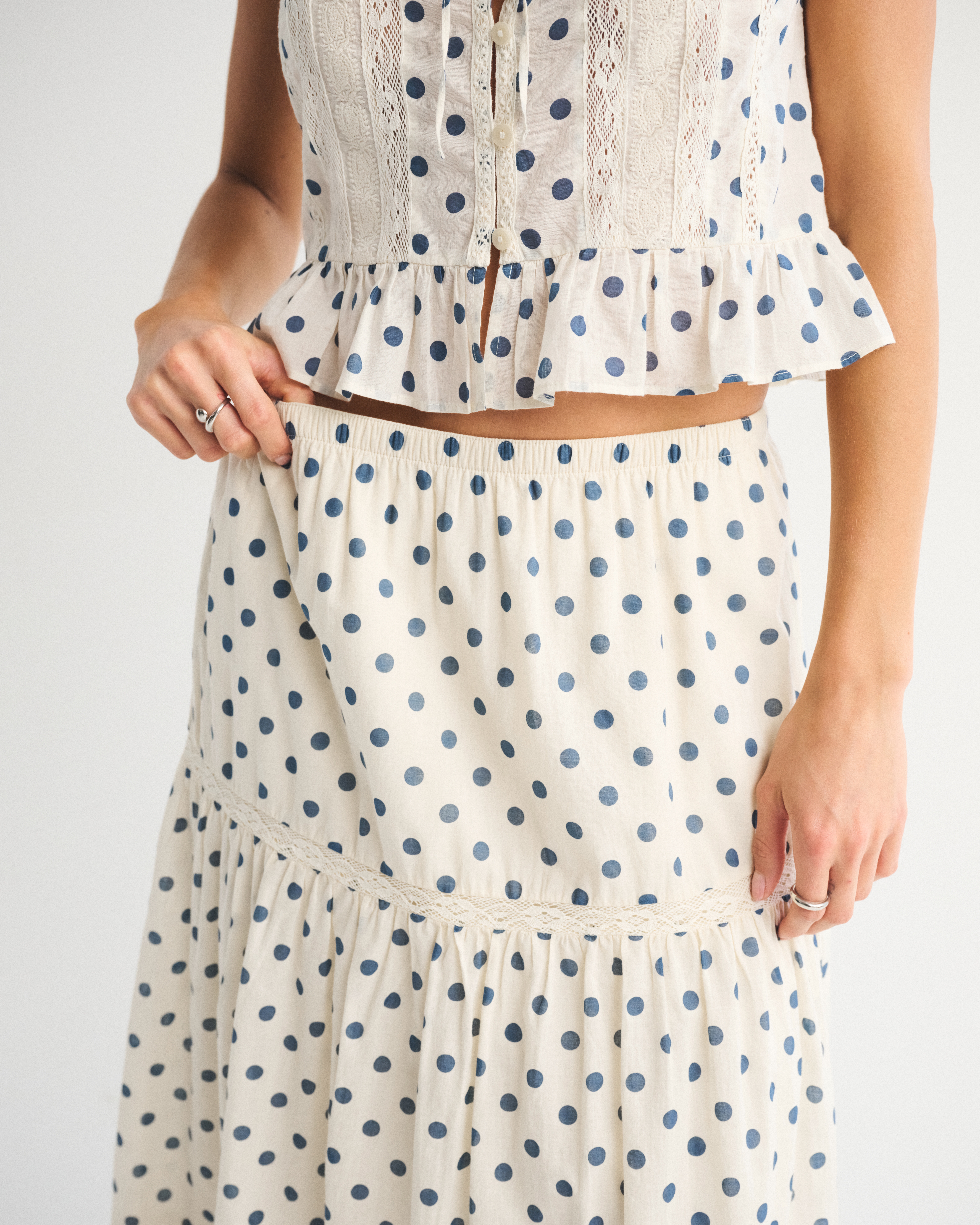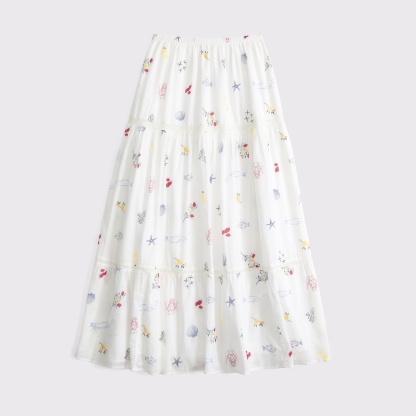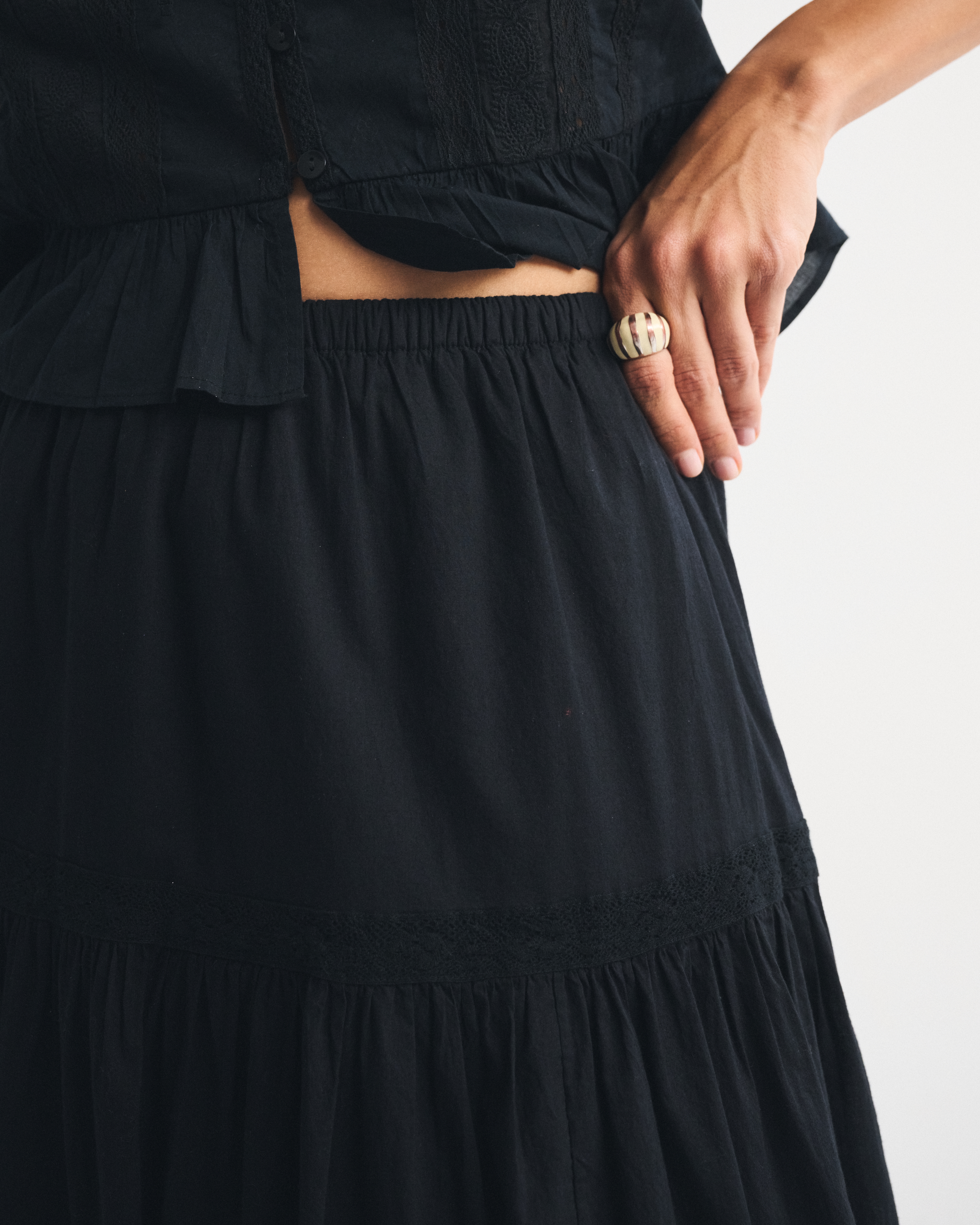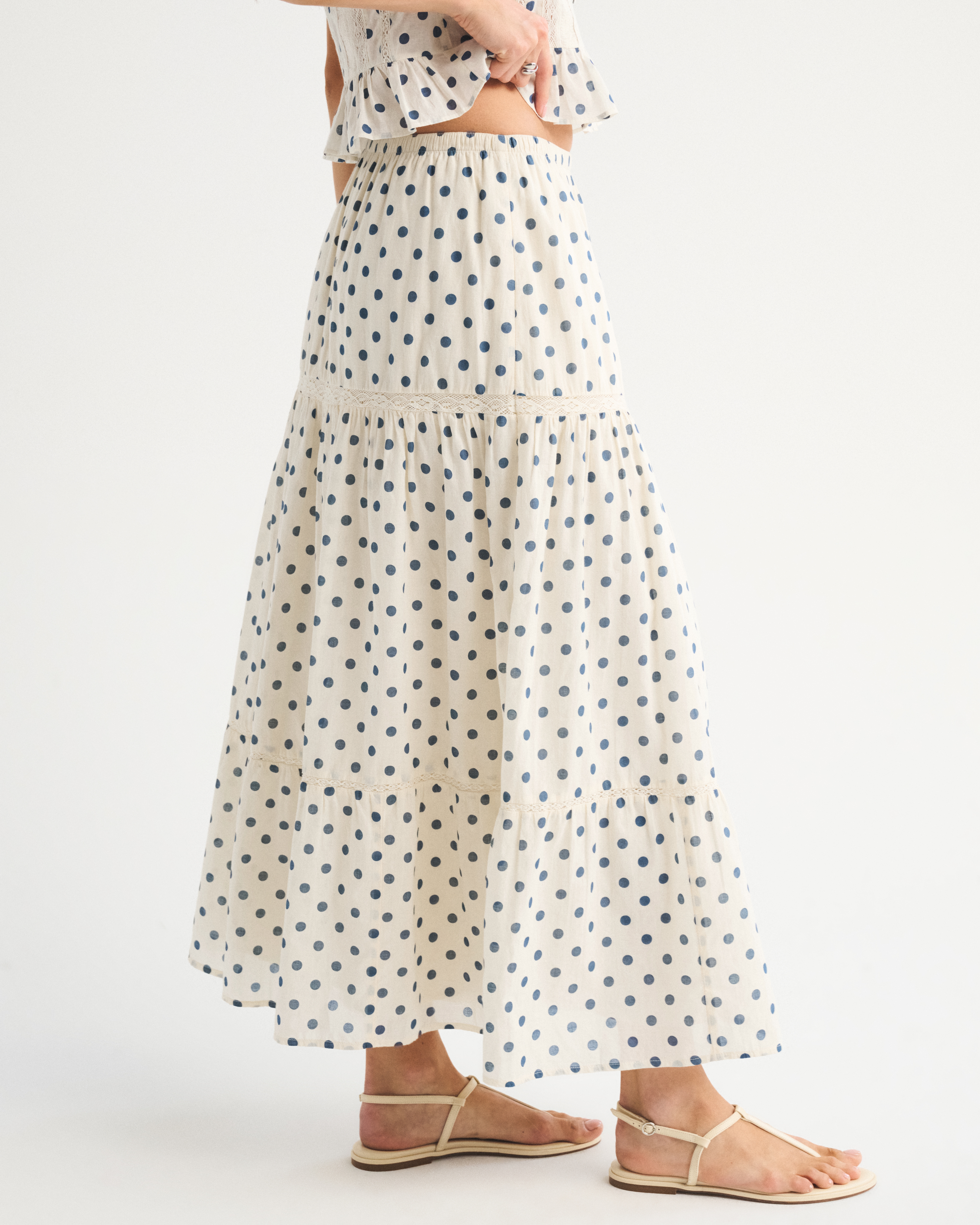 Our high rise maxi skirt in our soft cotton fabric. Features a full-length skirt, lace trim and pintuck details throughout and a pull-on style elasticated waistband. Imported.