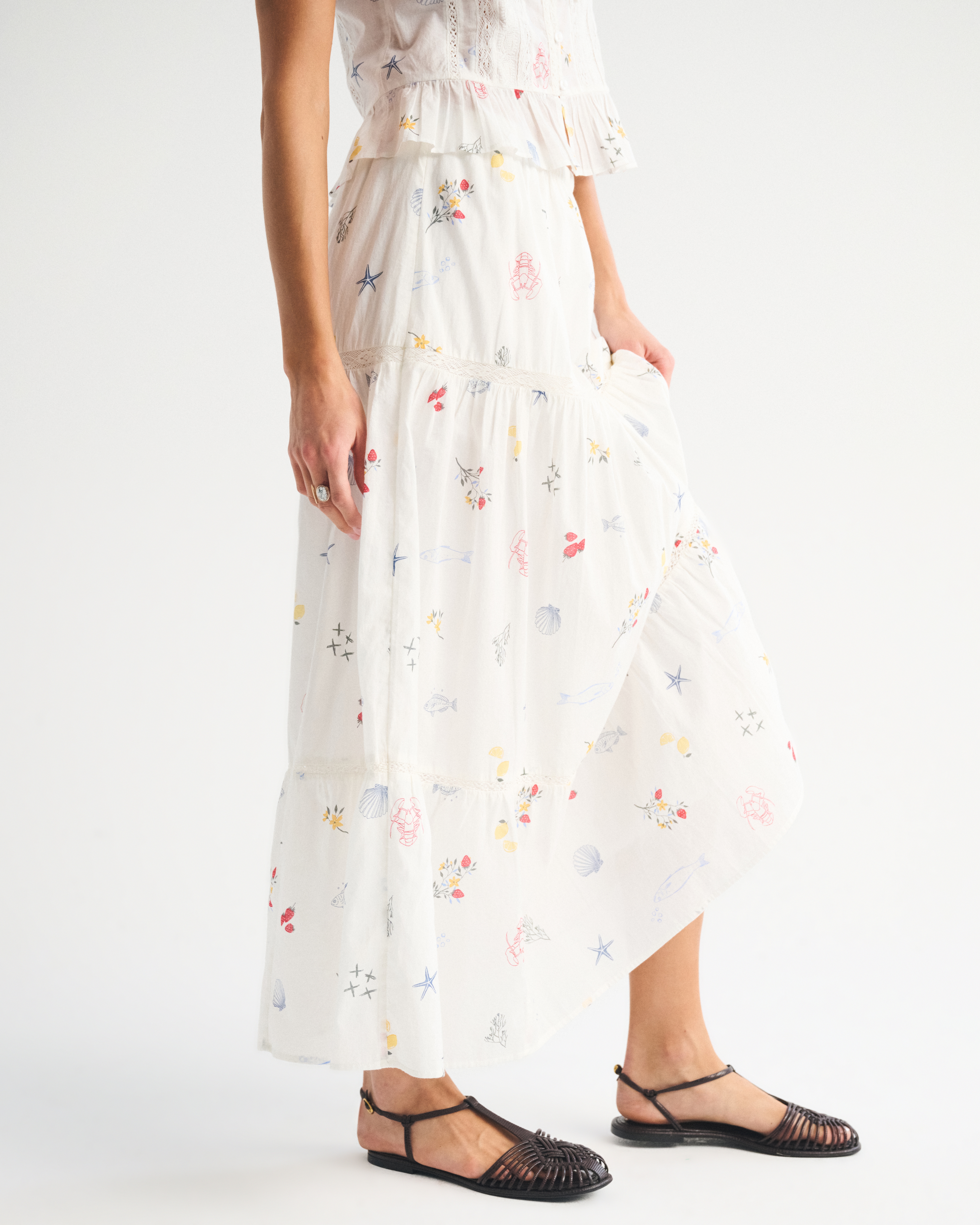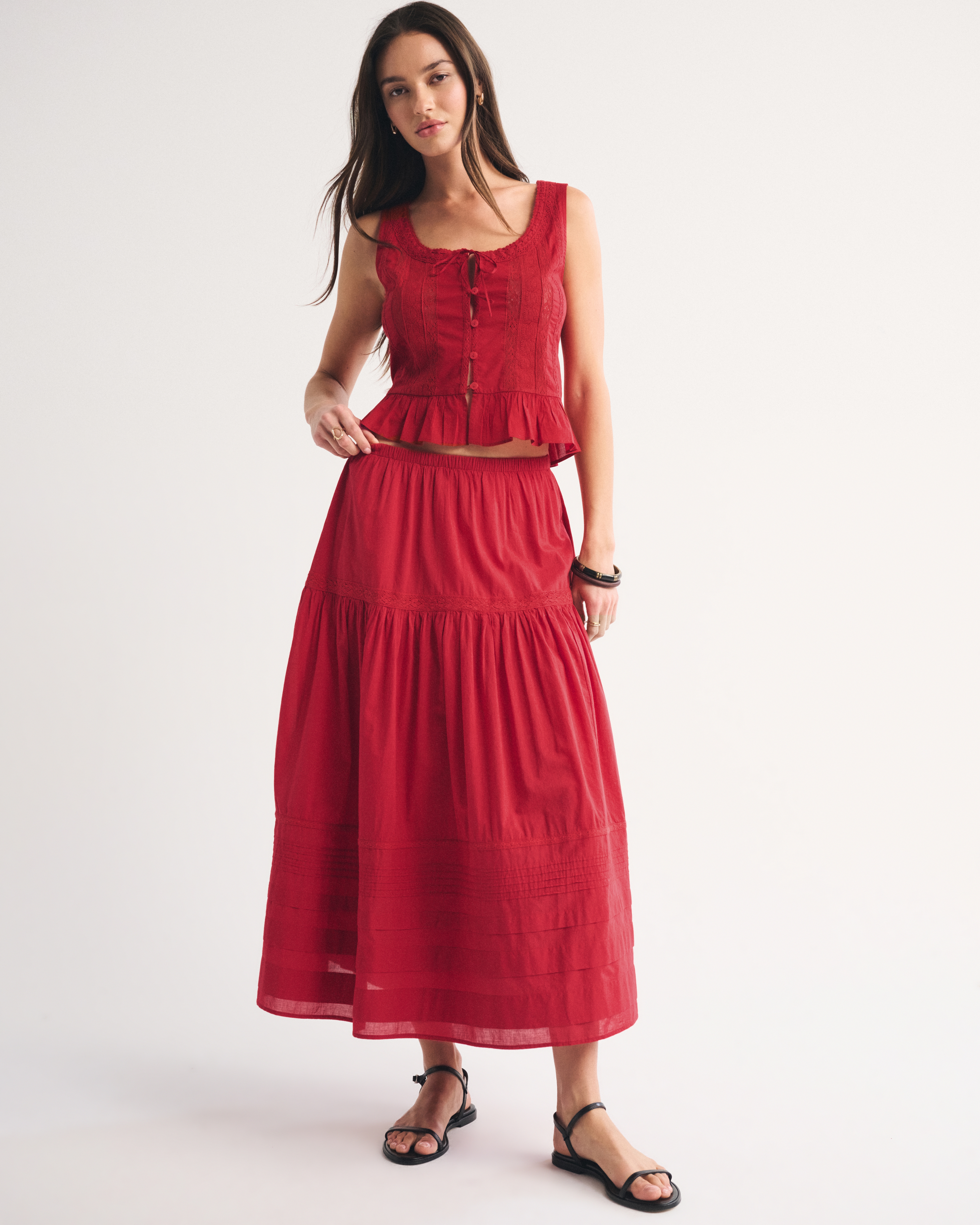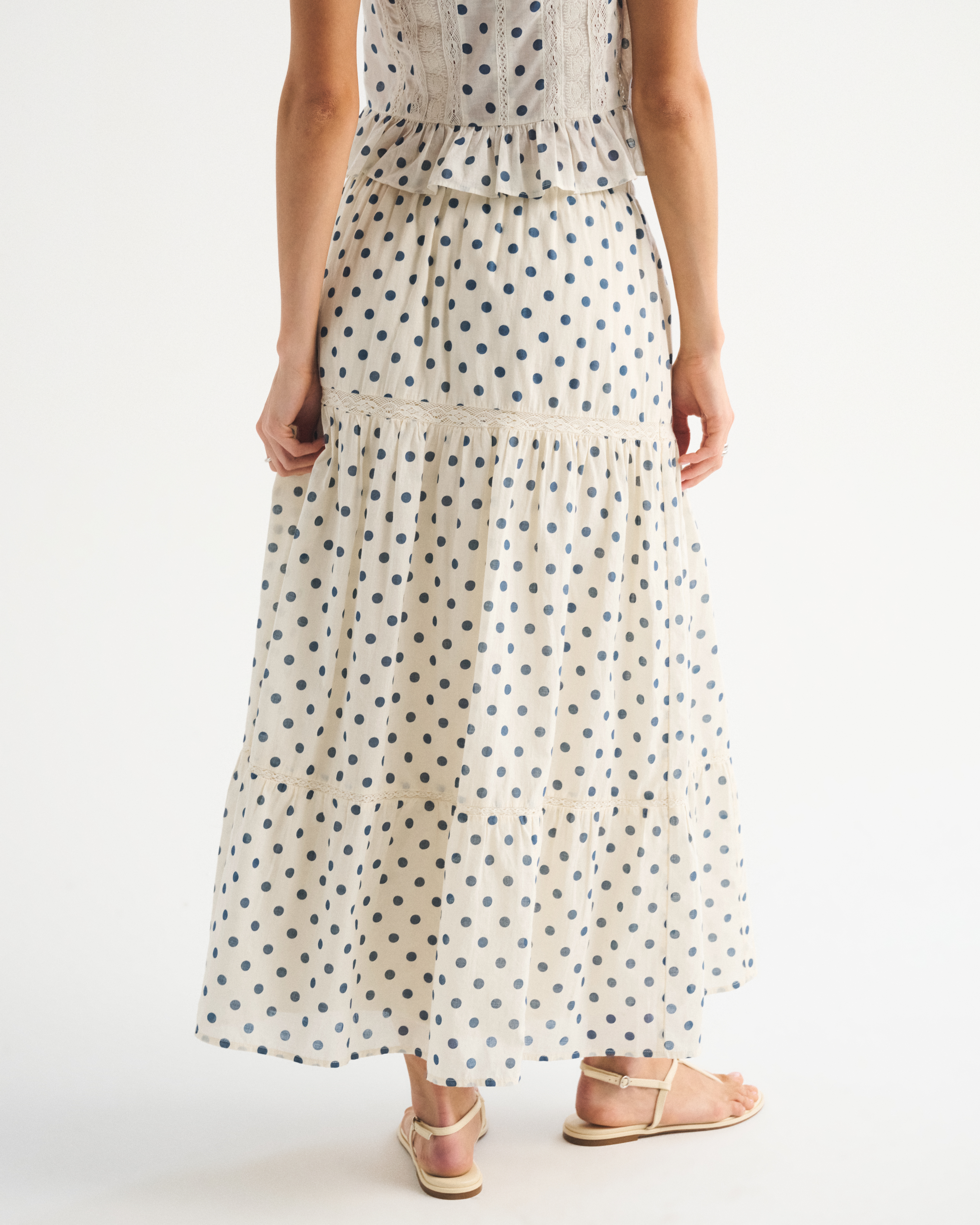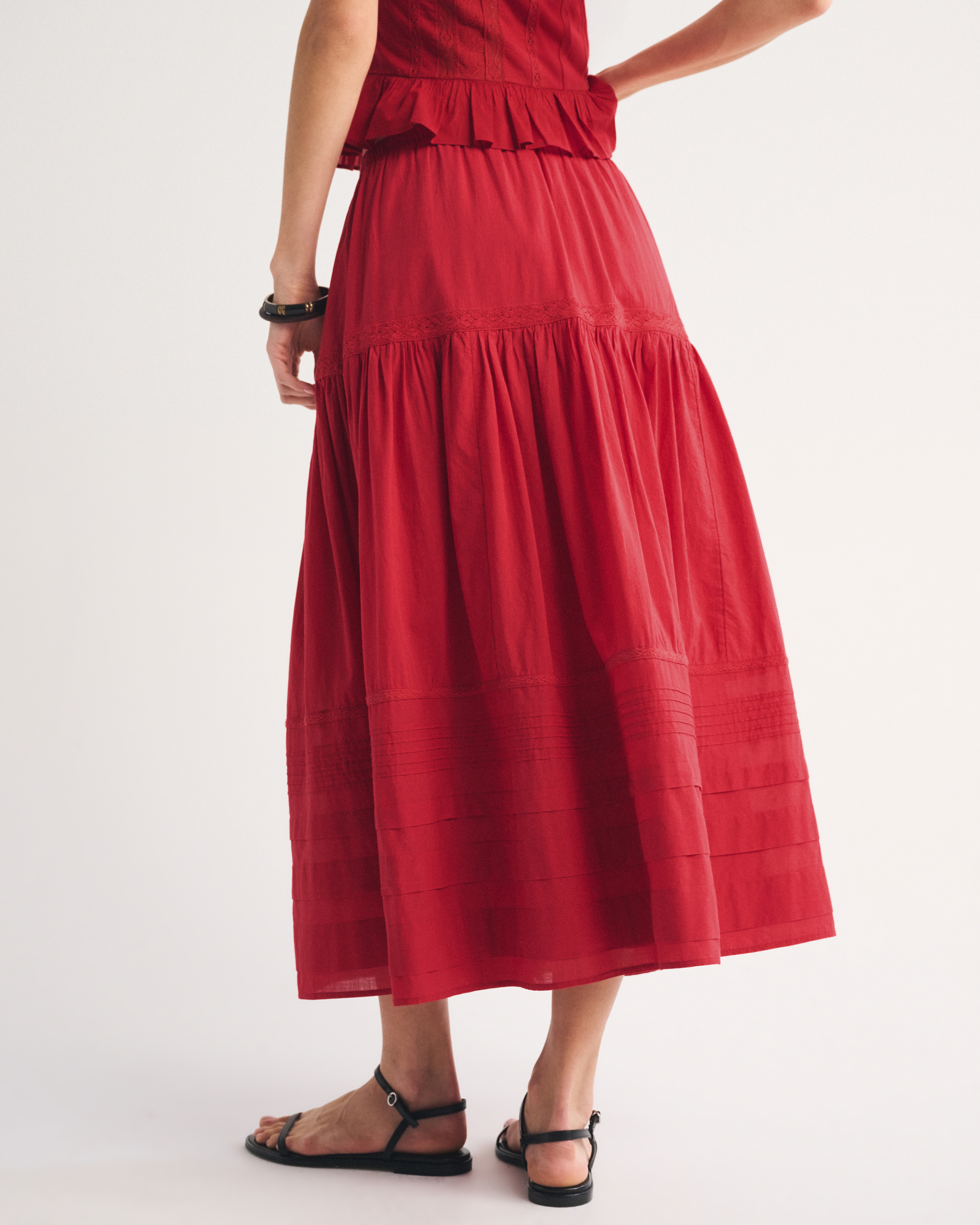 Our high rise maxi skirt in our soft cotton fabric. Features a full-length skirt, lace trim and pintuck details throughout and a pull-on style elasticated waistband. Imported.