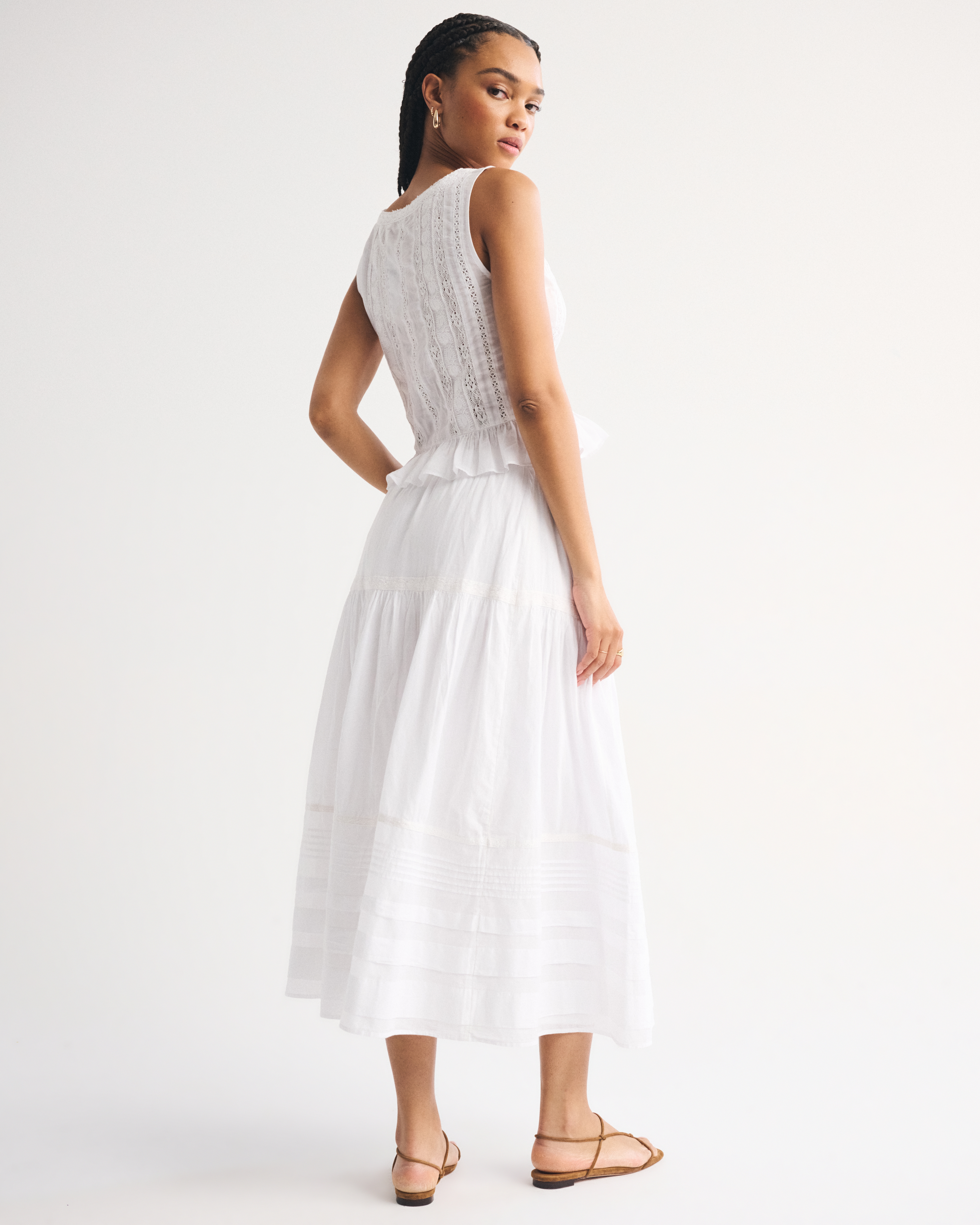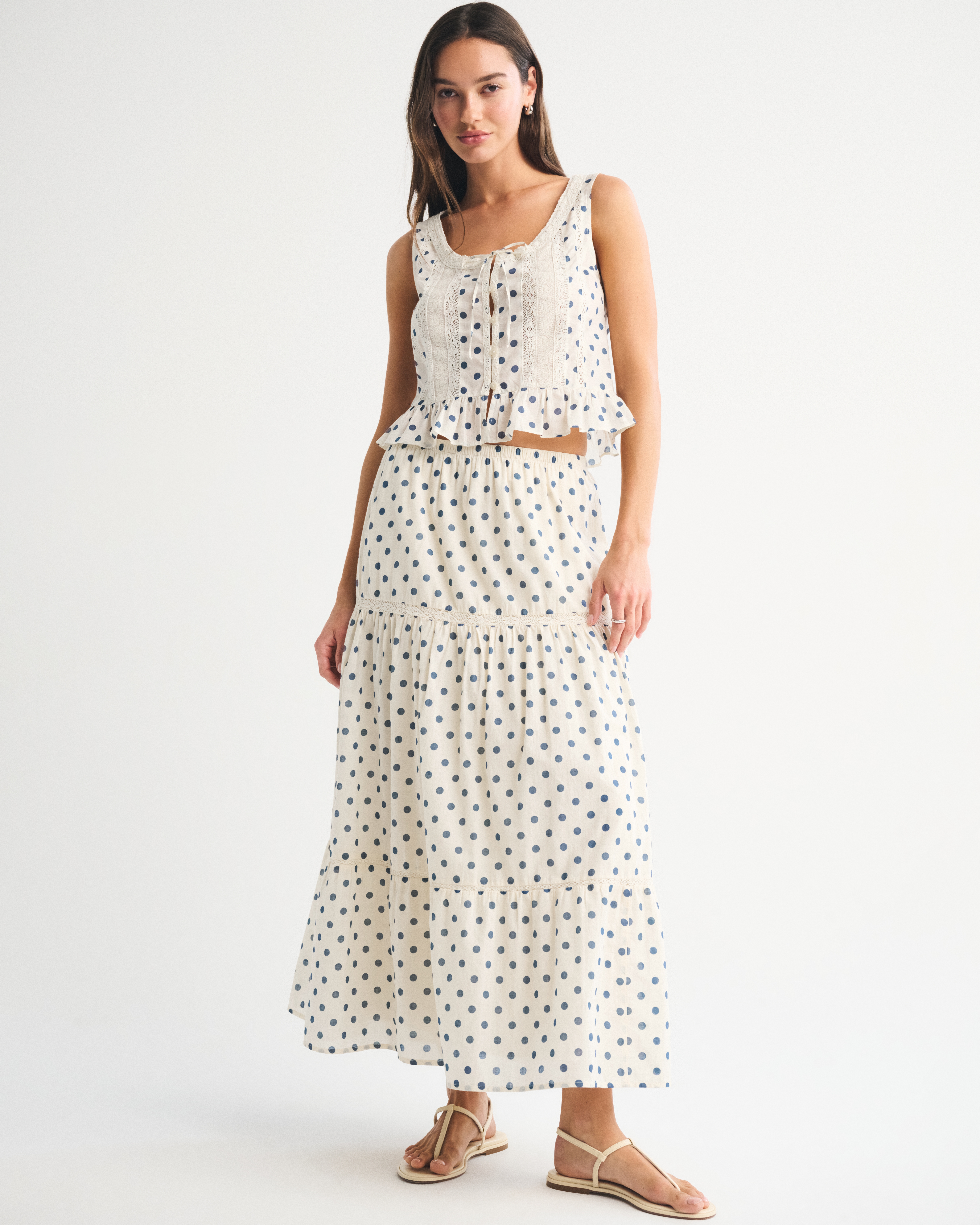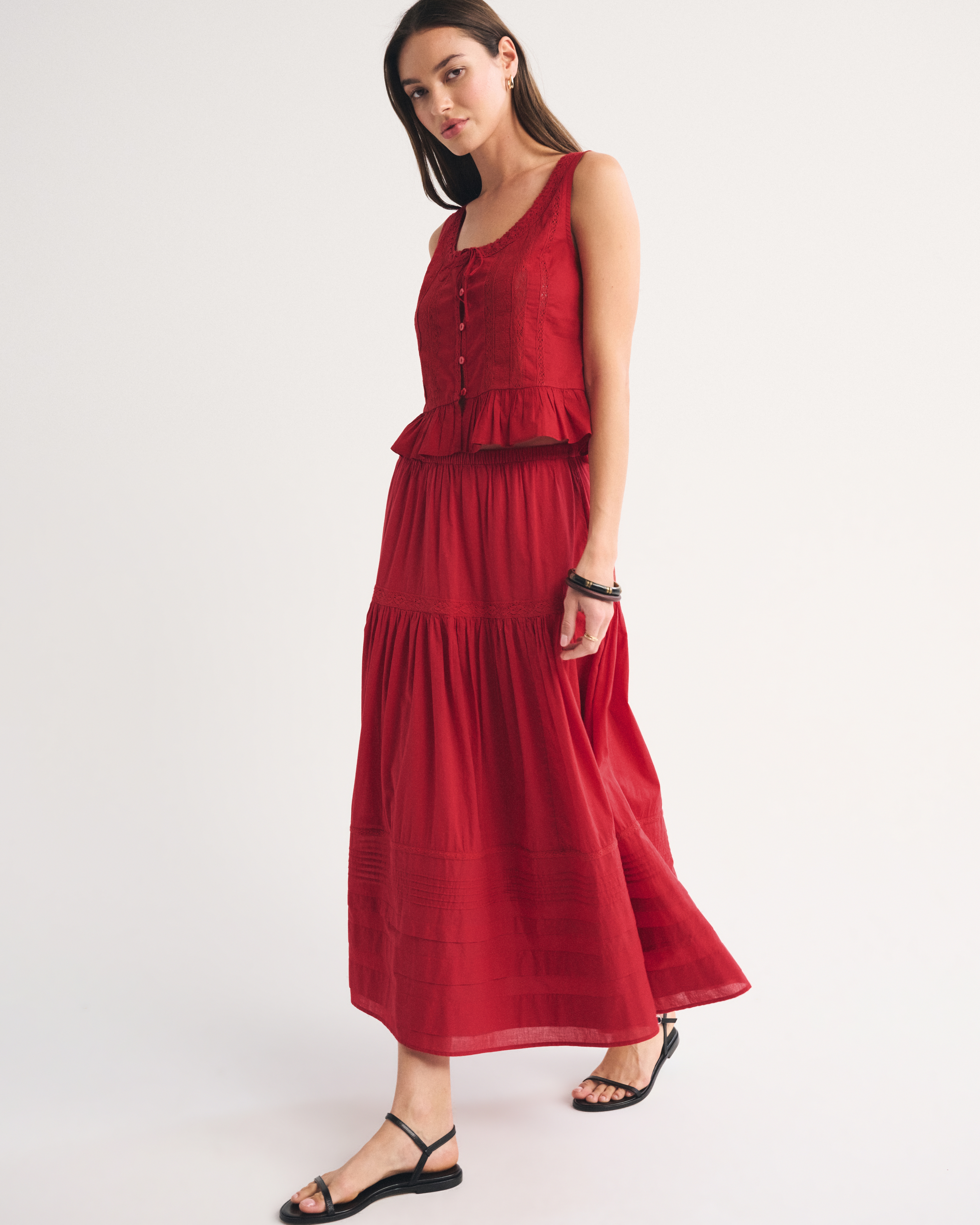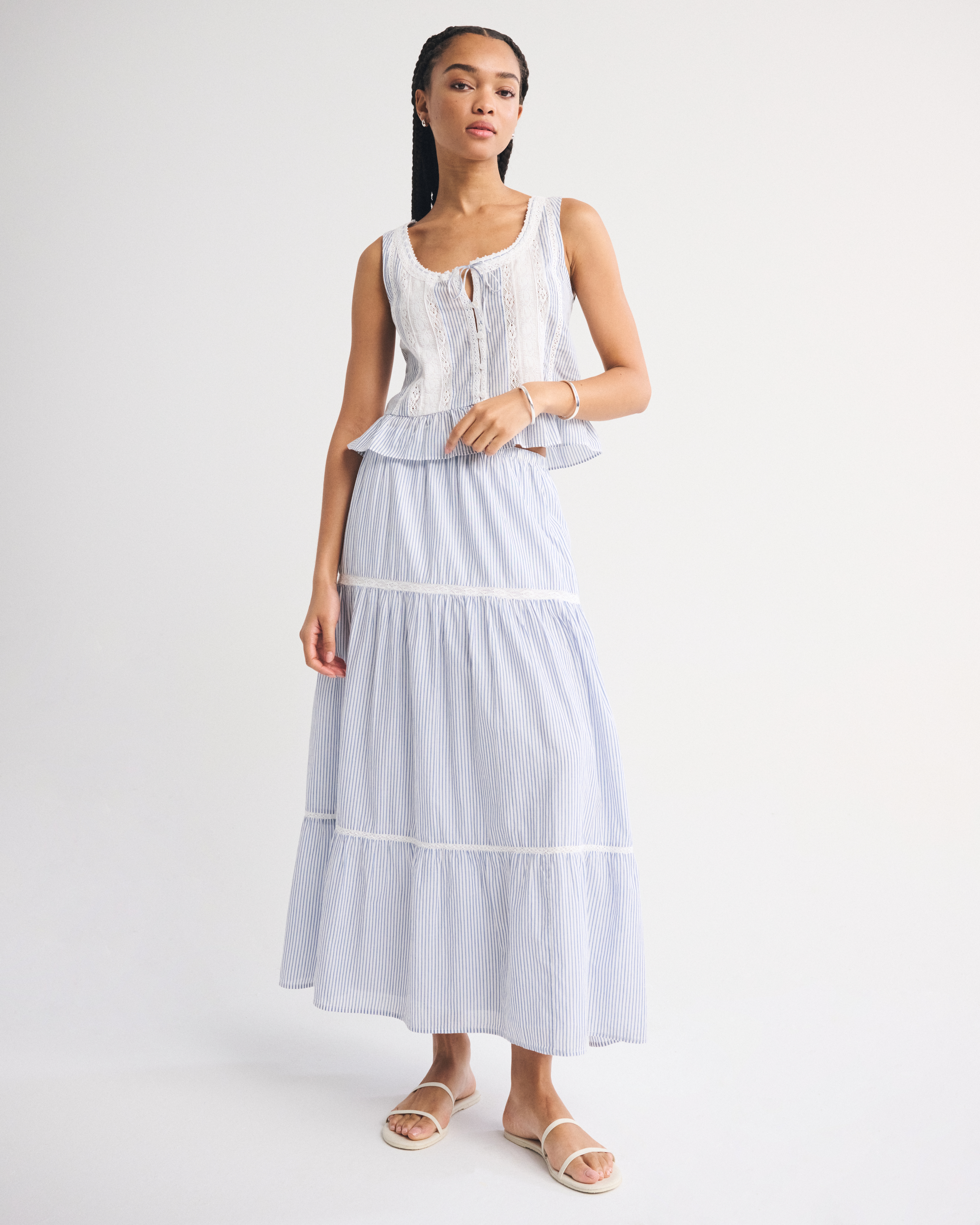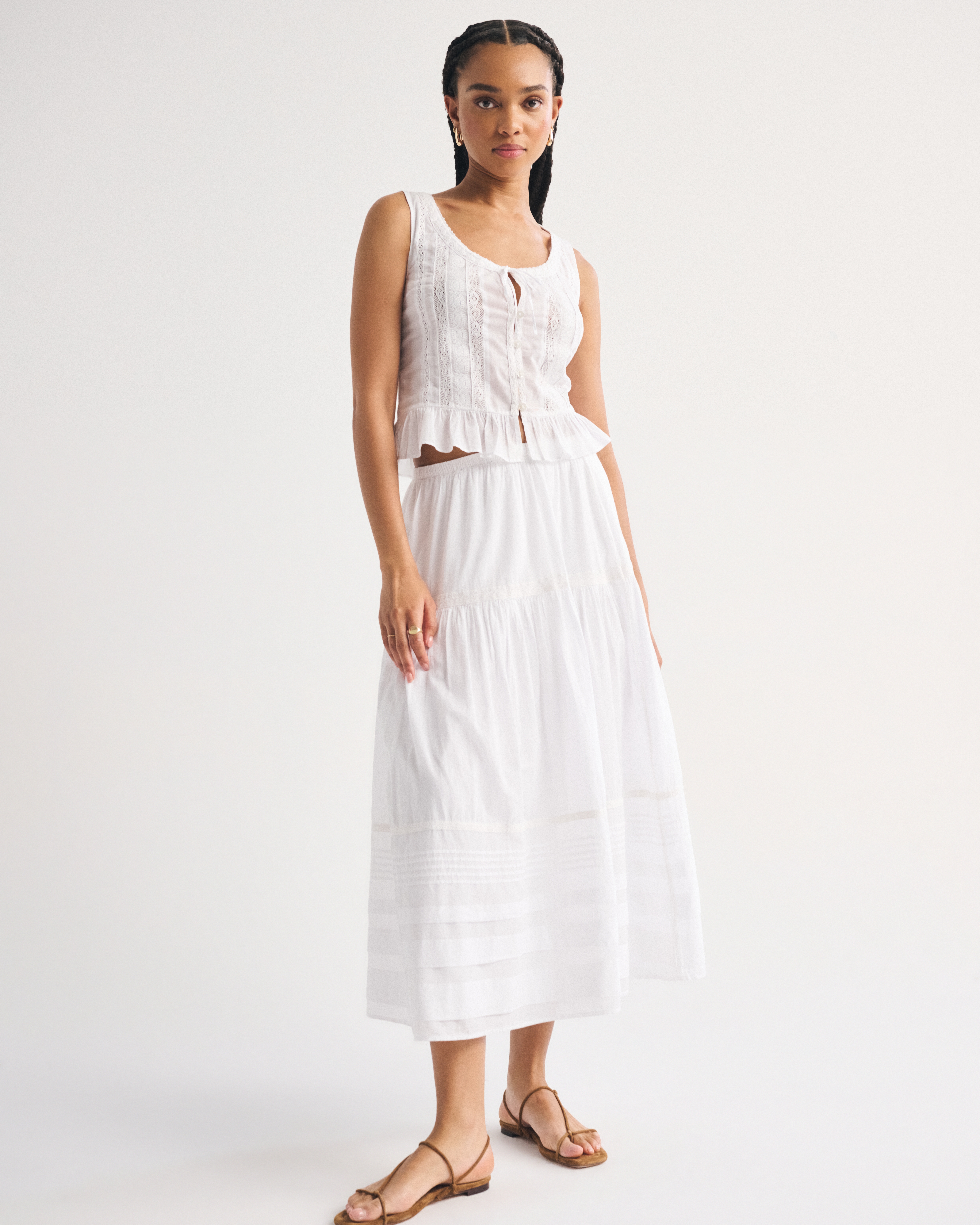 Our high rise maxi skirt in our soft cotton fabric. Features a full-length skirt, lace trim and pintuck details throughout and a pull-on style elasticated waistband. Imported.