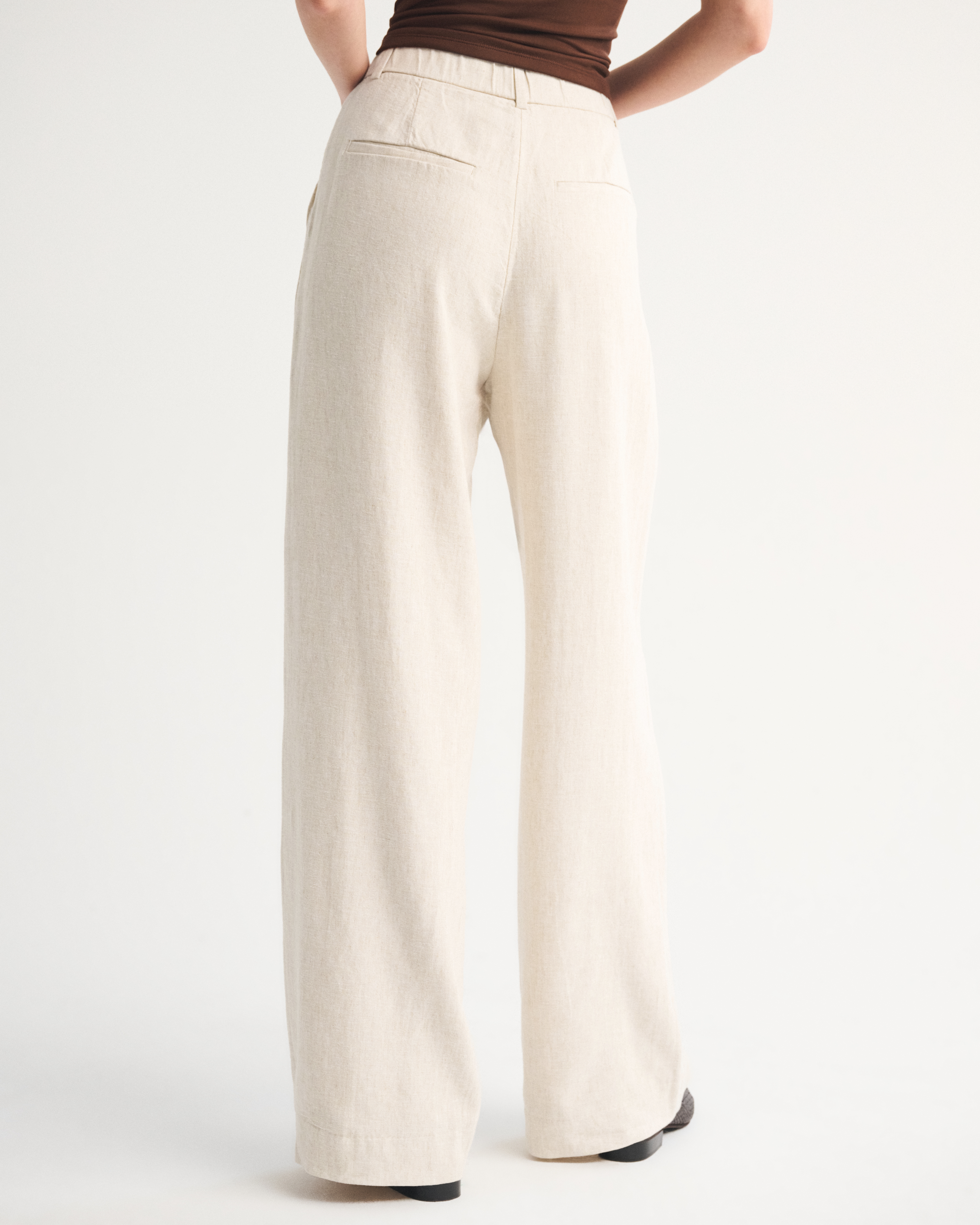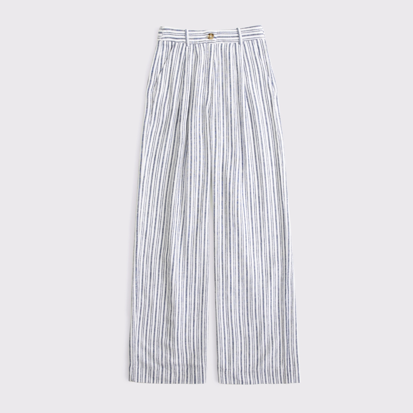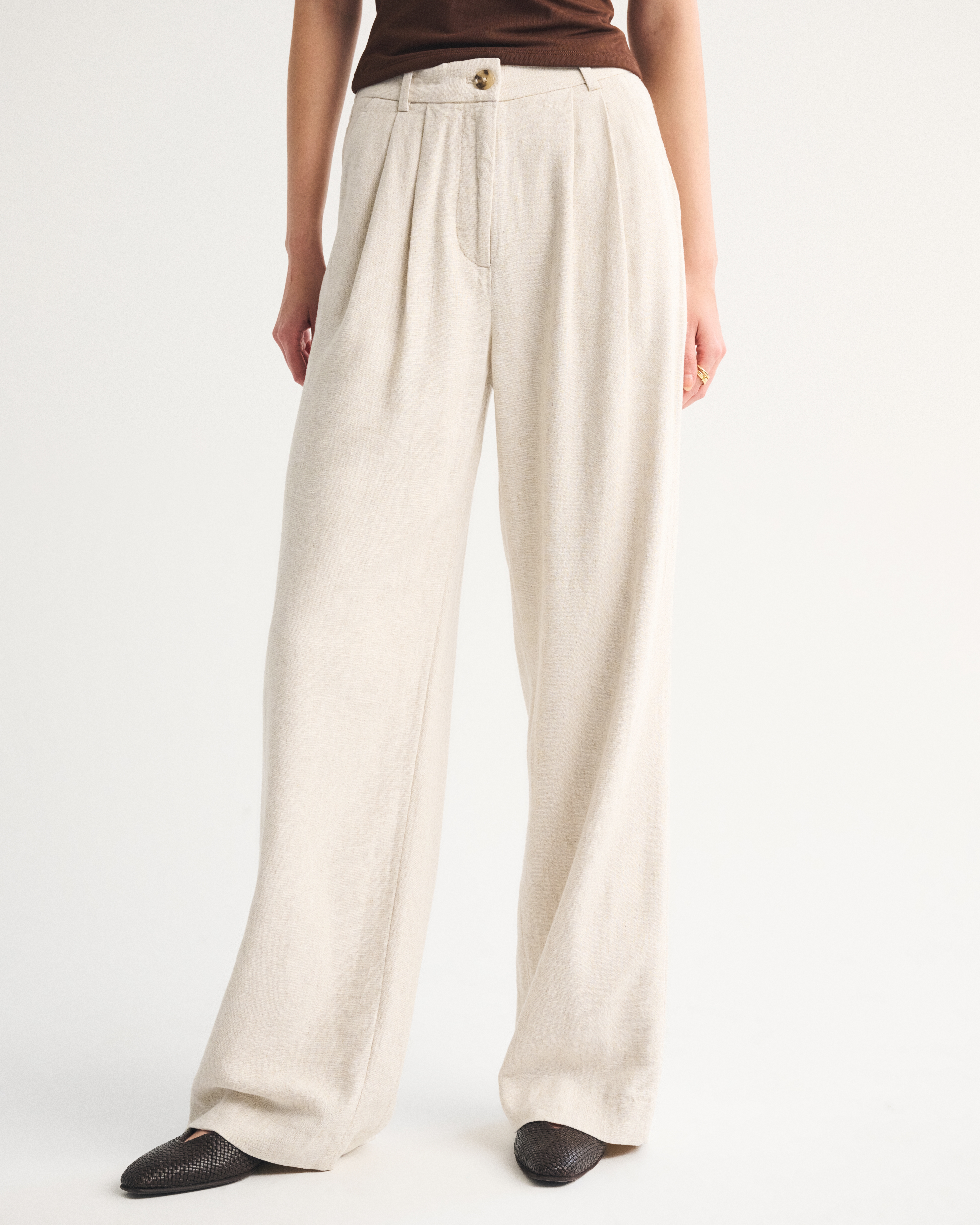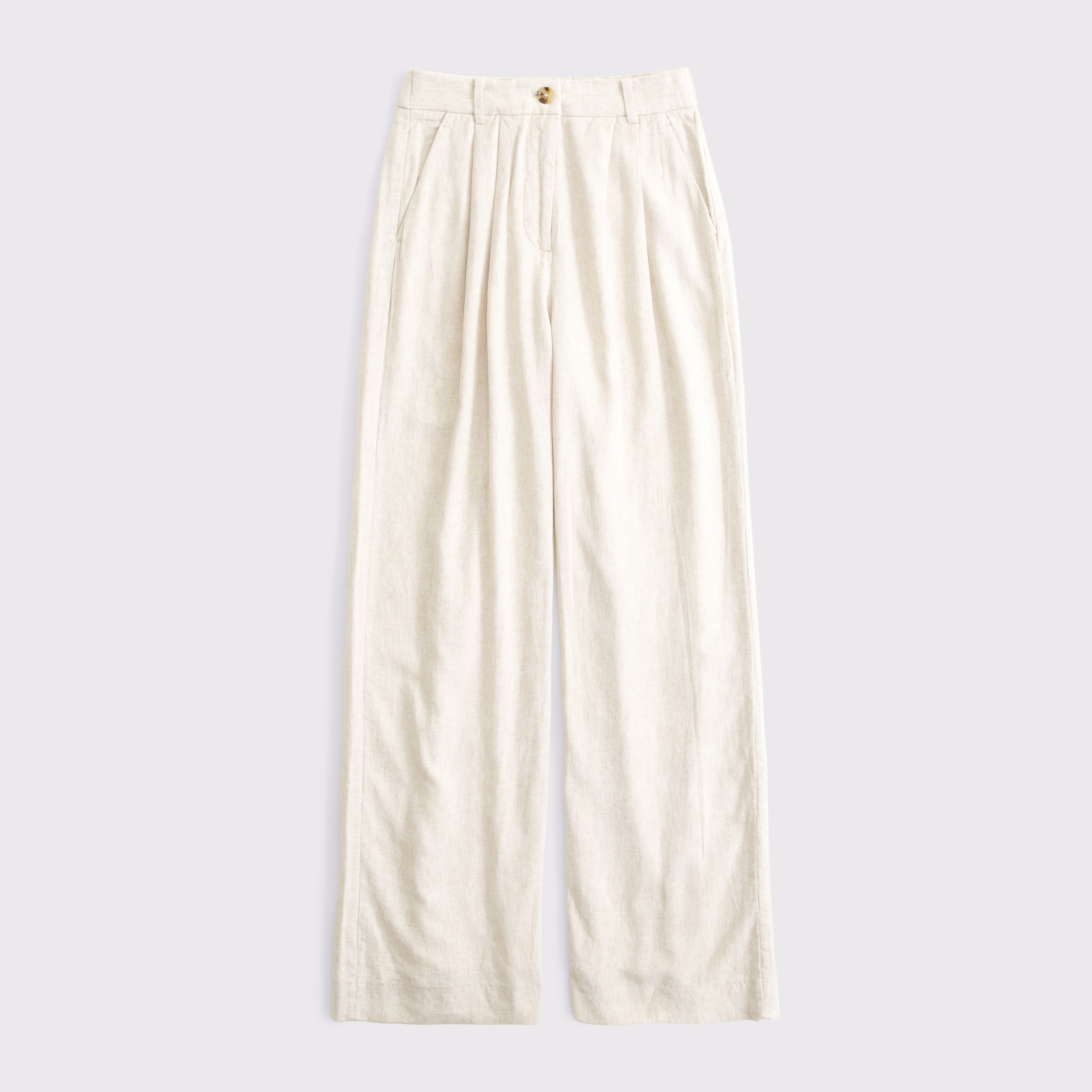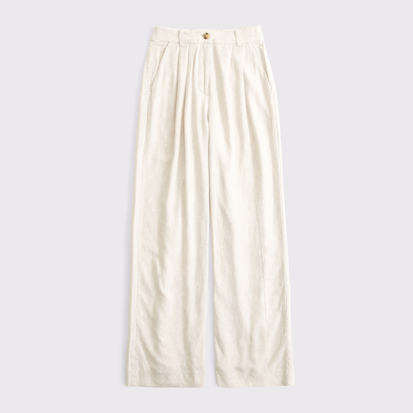 Our signature A&F Sloane tailored pant in our breezy linen-blend fabric. The A&F Sloane Tailored Pant is an ultra high rise tailored wide leg pant with figure-flattering pleat details, a functional fly and a partially elasticated waistband for ultimate adjustability. This fit is relaxed through the hips, and eases into a wide, full-length leg shape. Imported.