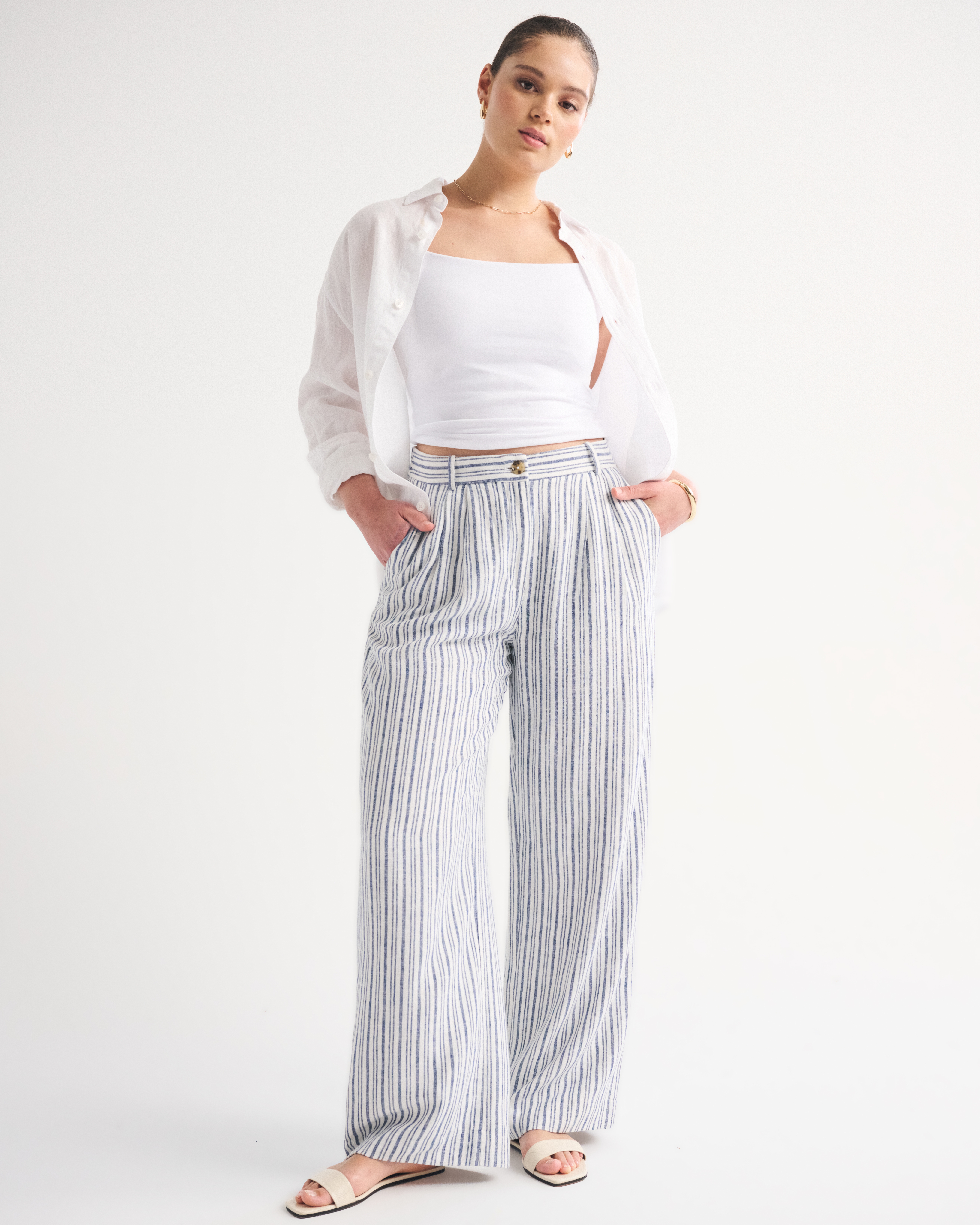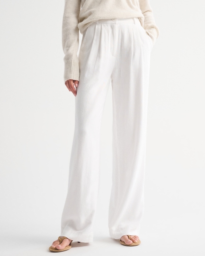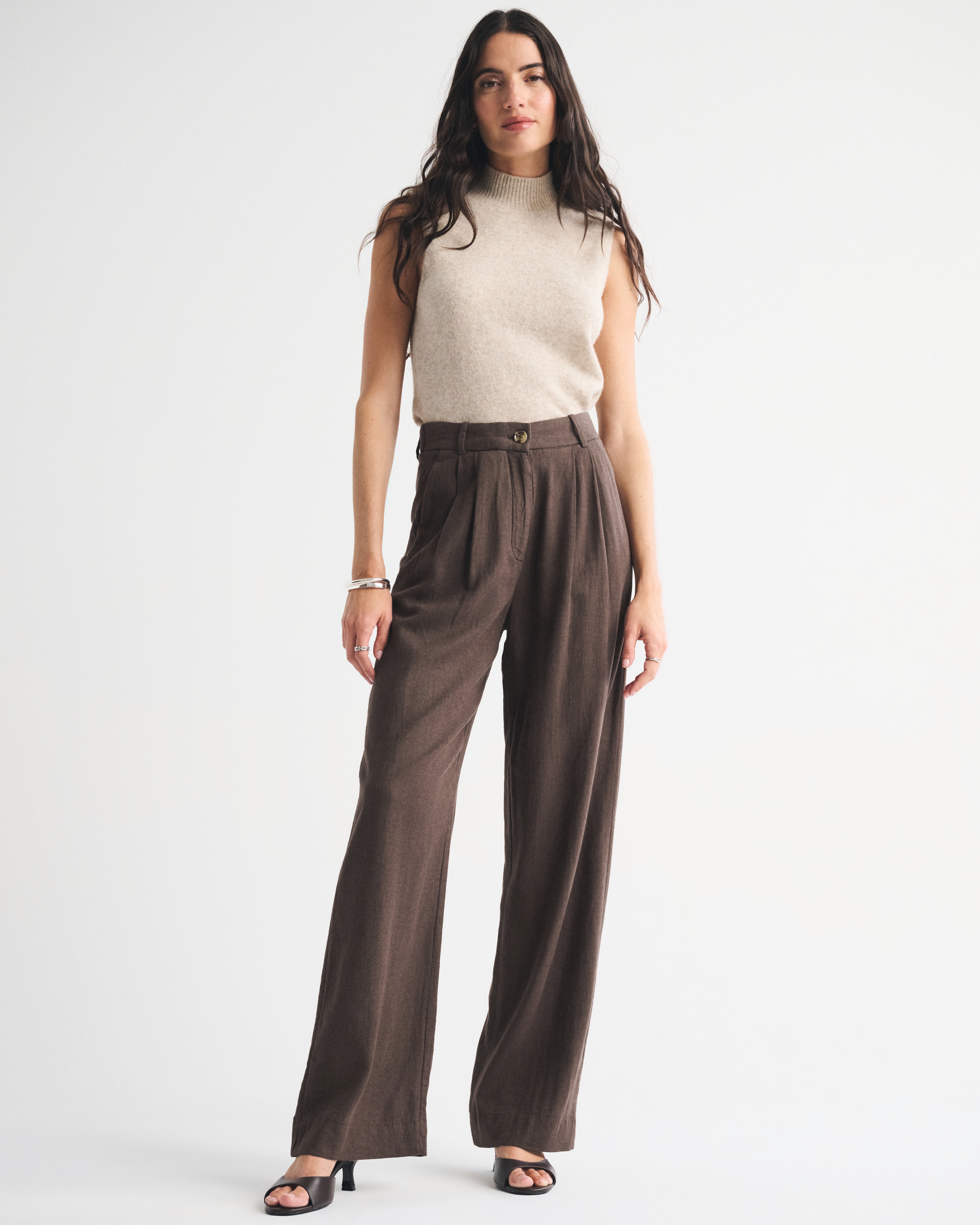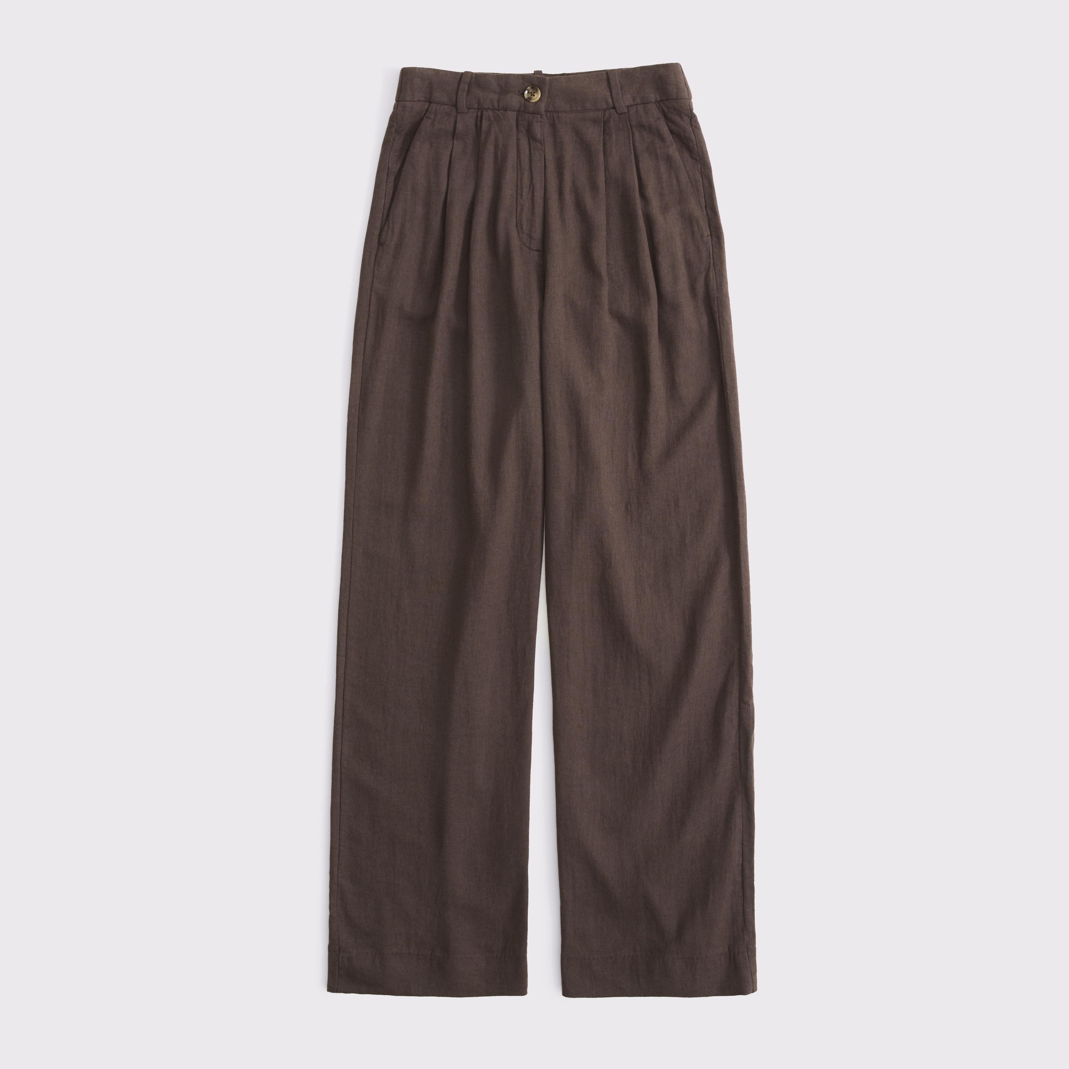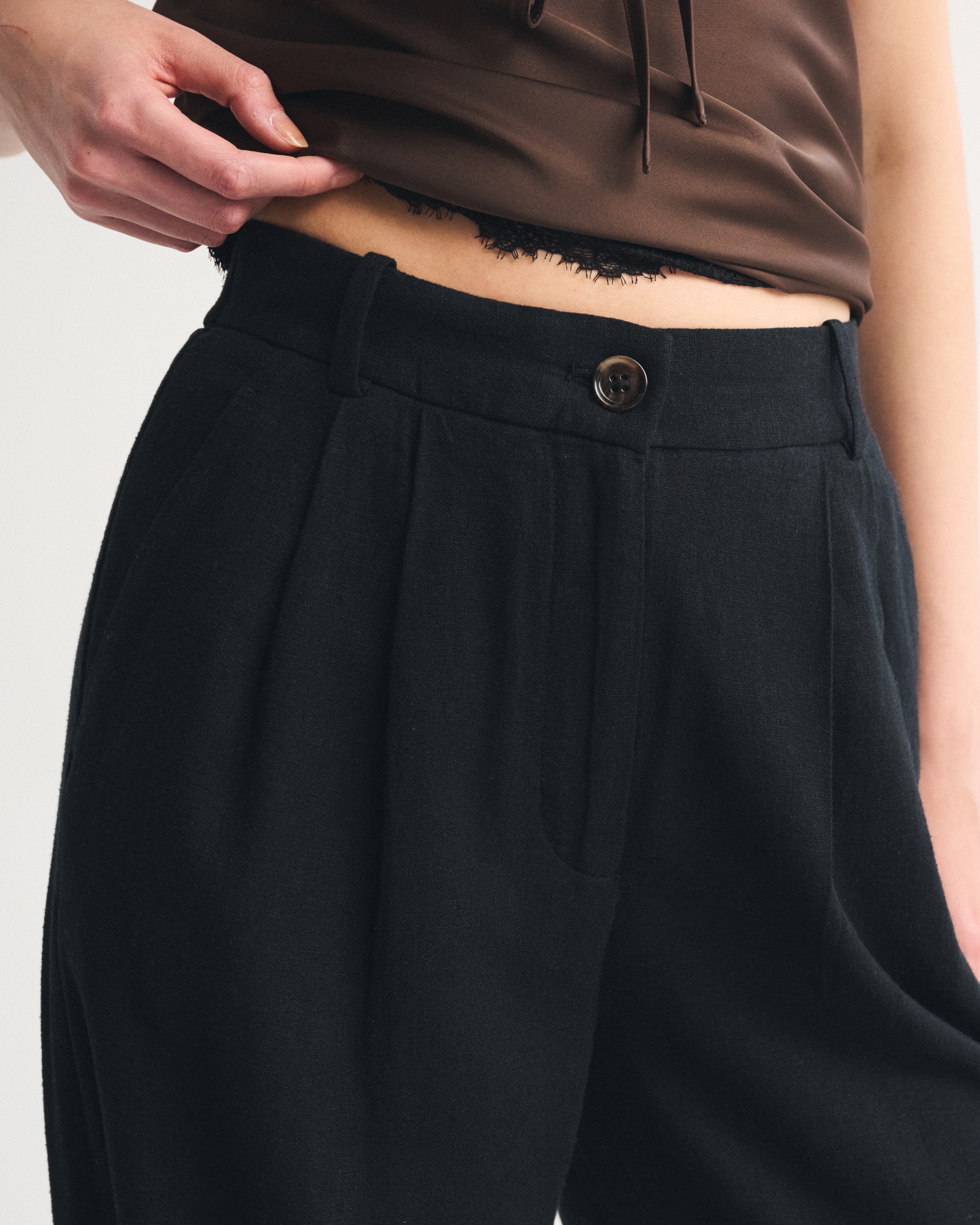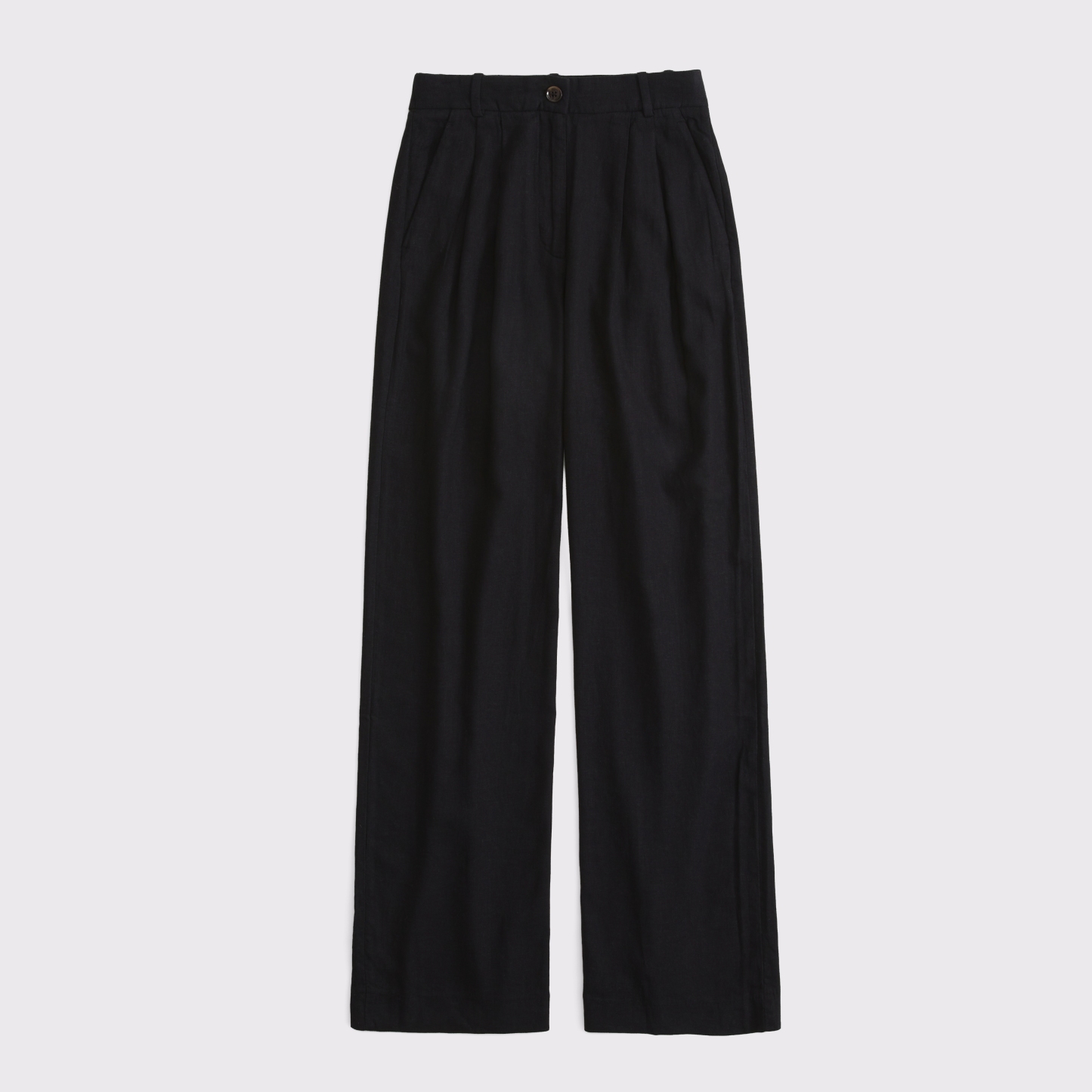 Our signature A&F Sloane tailored pant in our breezy linen-blend fabric. The A&F Sloane Tailored Pant is an ultra high rise tailored wide leg pant with figure-flattering pleat details, a functional fly and a partially elasticated waistband for ultimate adjustability. This fit is relaxed through the hips, and eases into a wide, full-length leg shape. Imported.