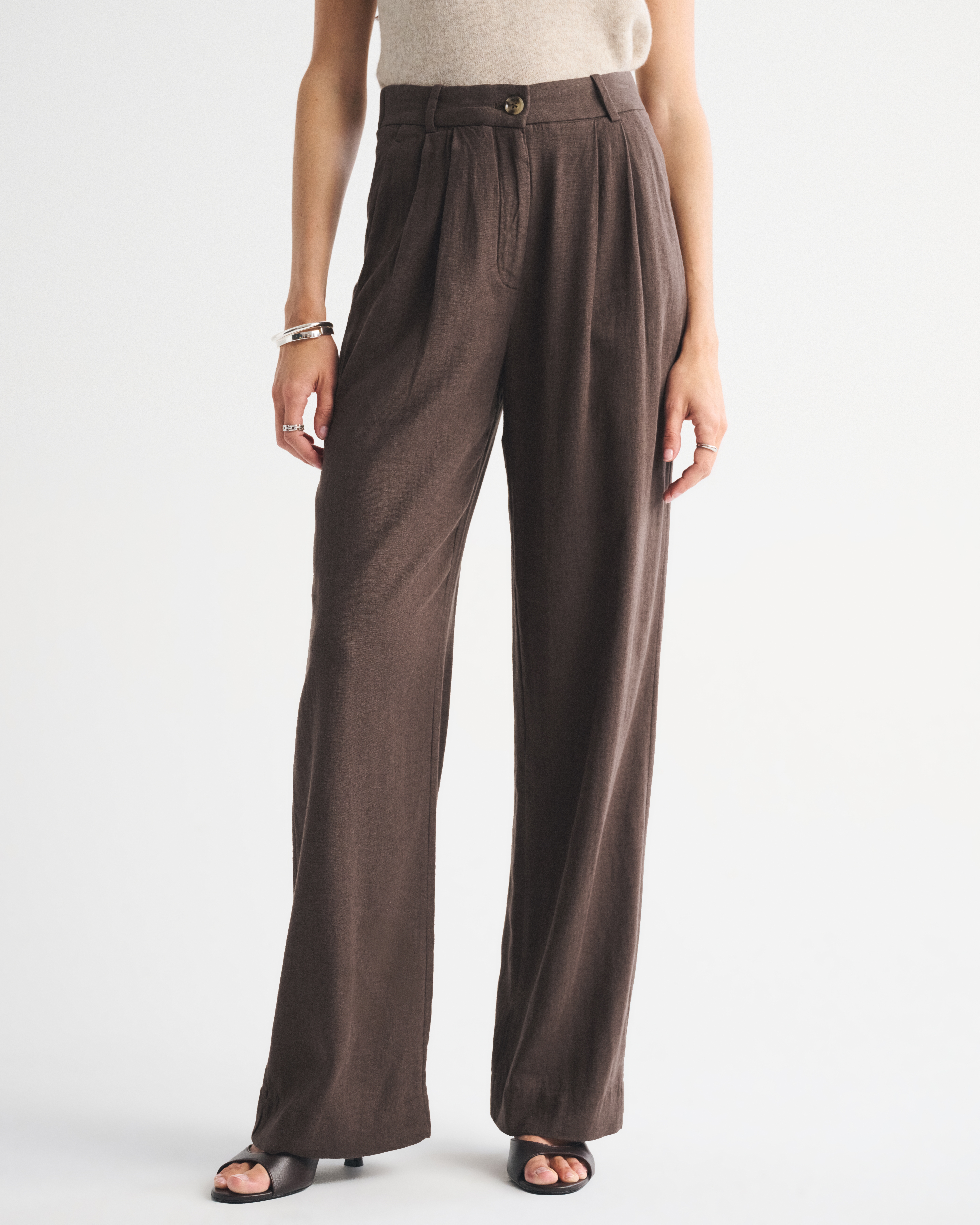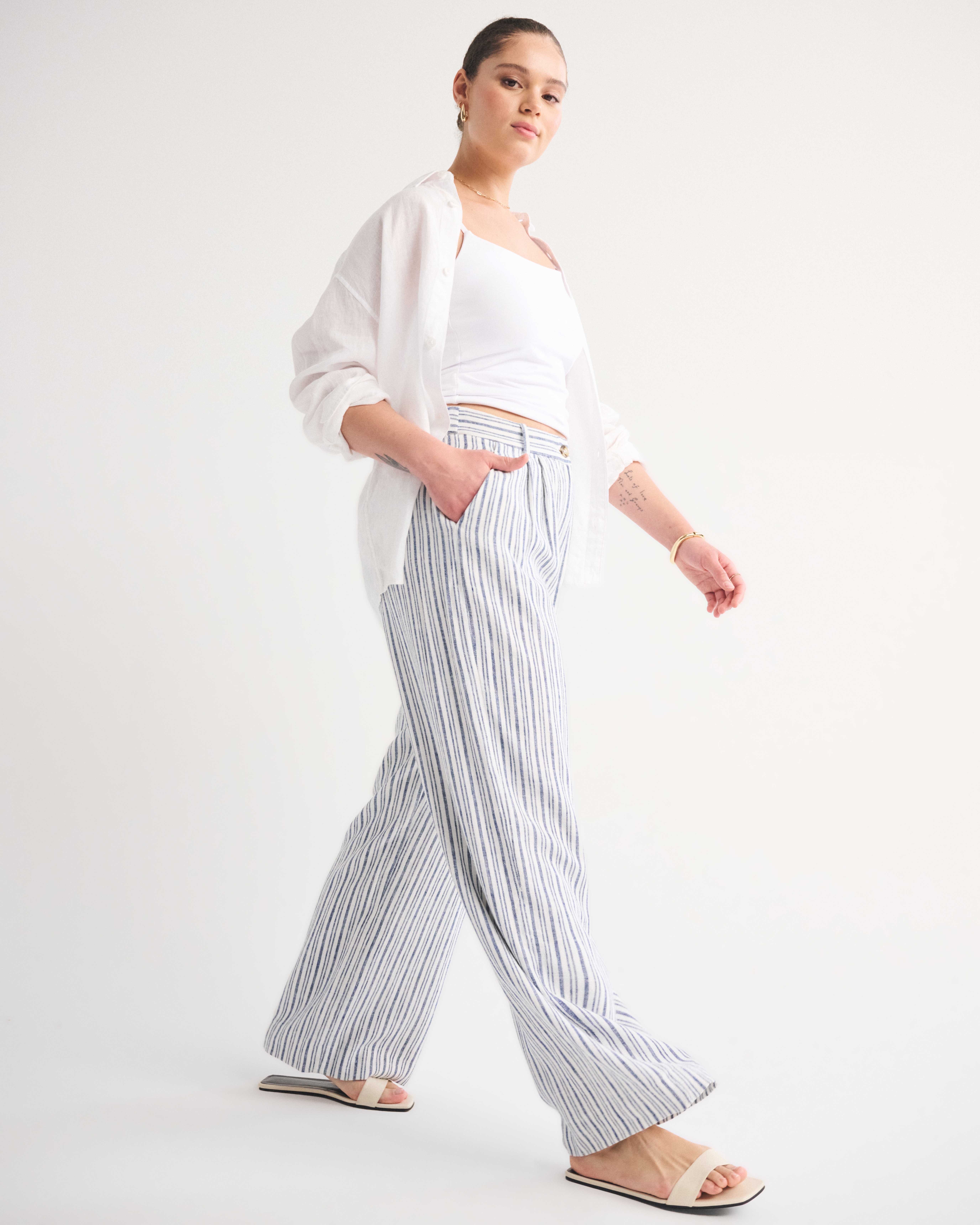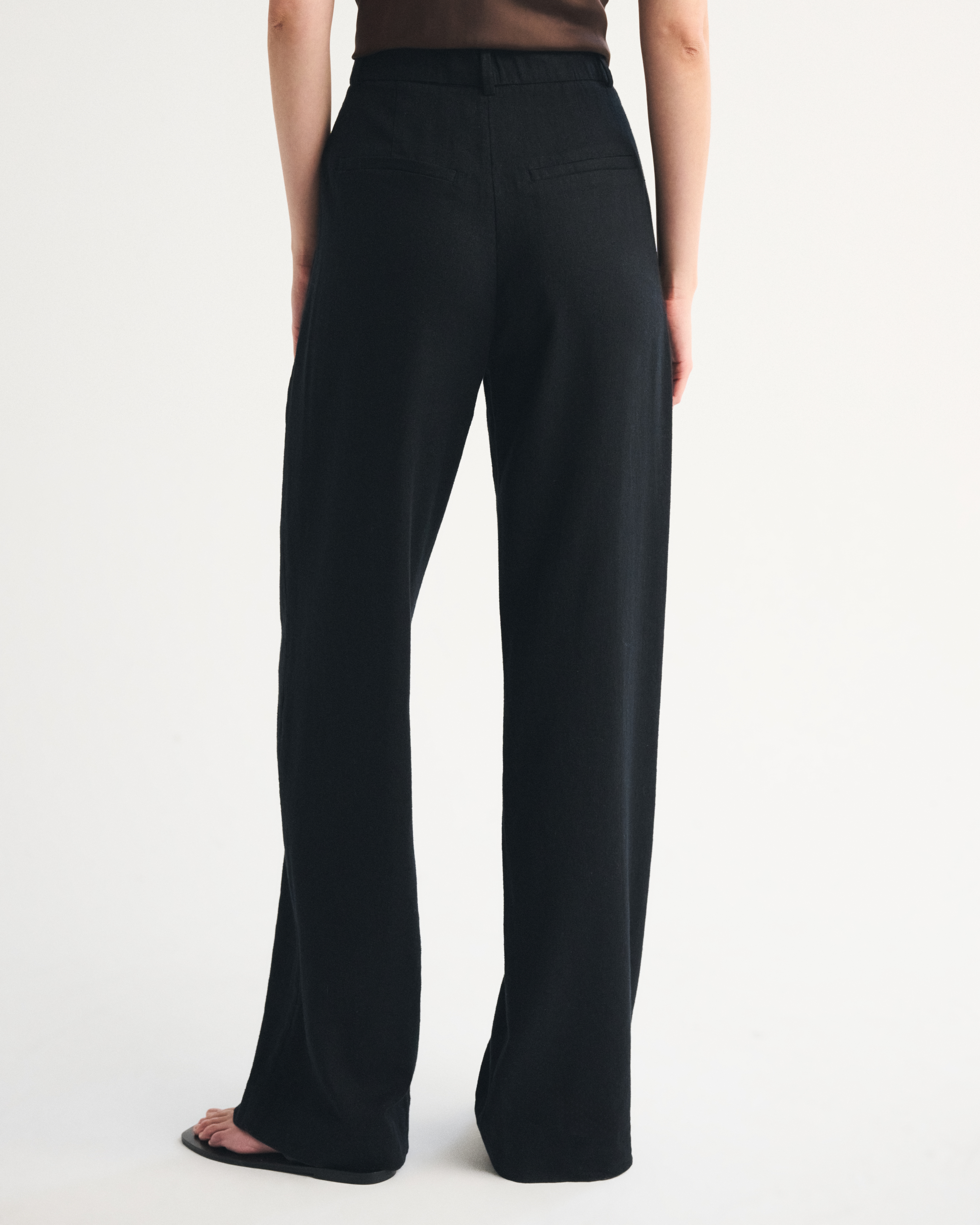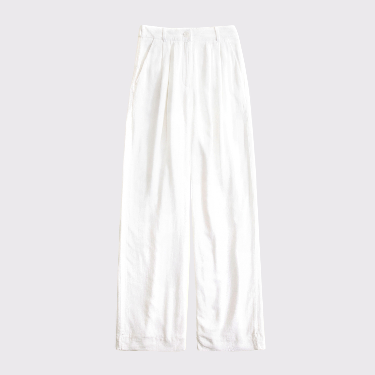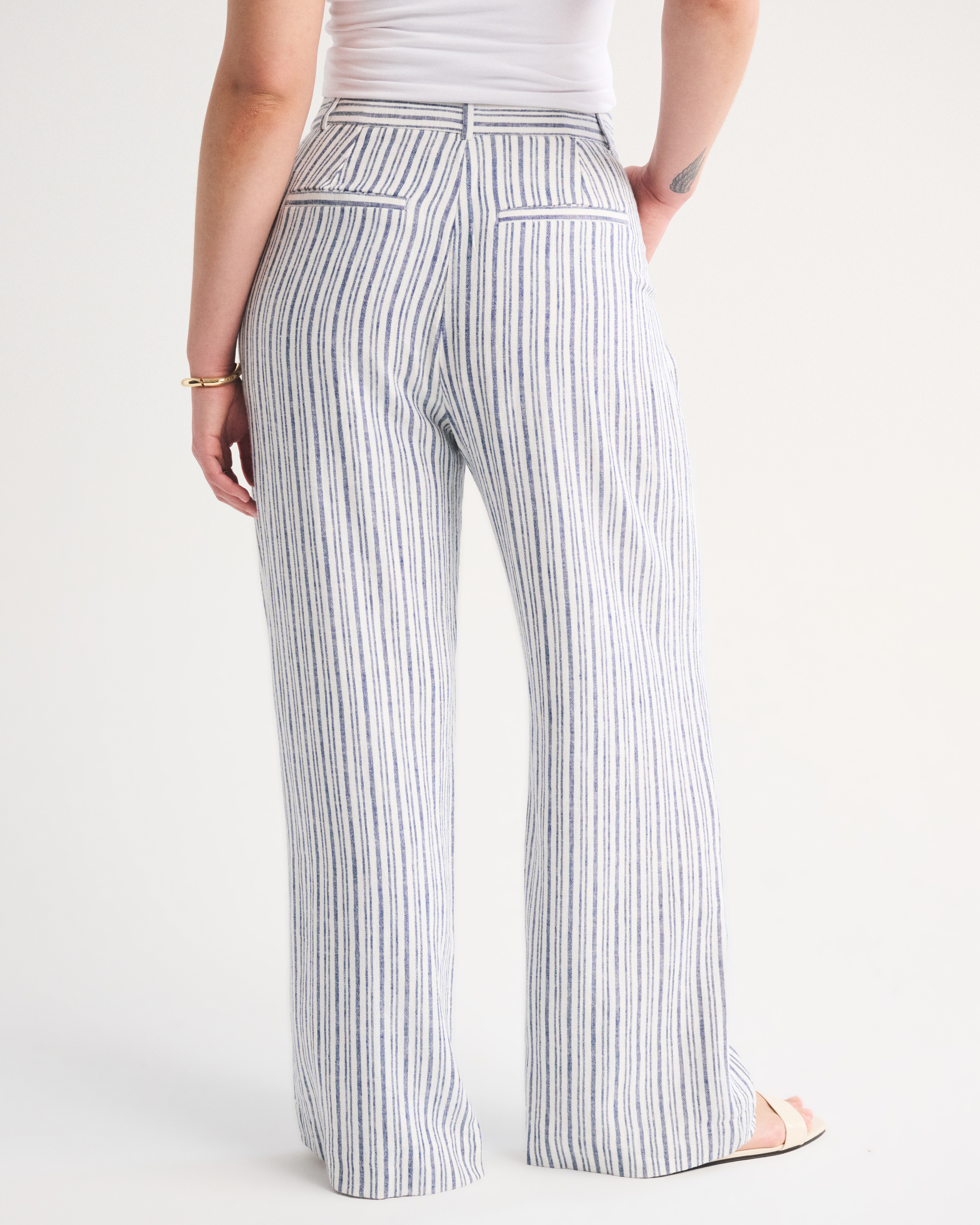 Our signature A&F Sloane tailored pant in our breezy linen-blend fabric. The A&F Sloane Tailored Pant is an ultra high rise tailored wide leg pant with figure-flattering pleat details, a functional fly and a partially elasticated waistband for ultimate adjustability. This fit is relaxed through the hips, and eases into a wide, full-length leg shape. Imported.