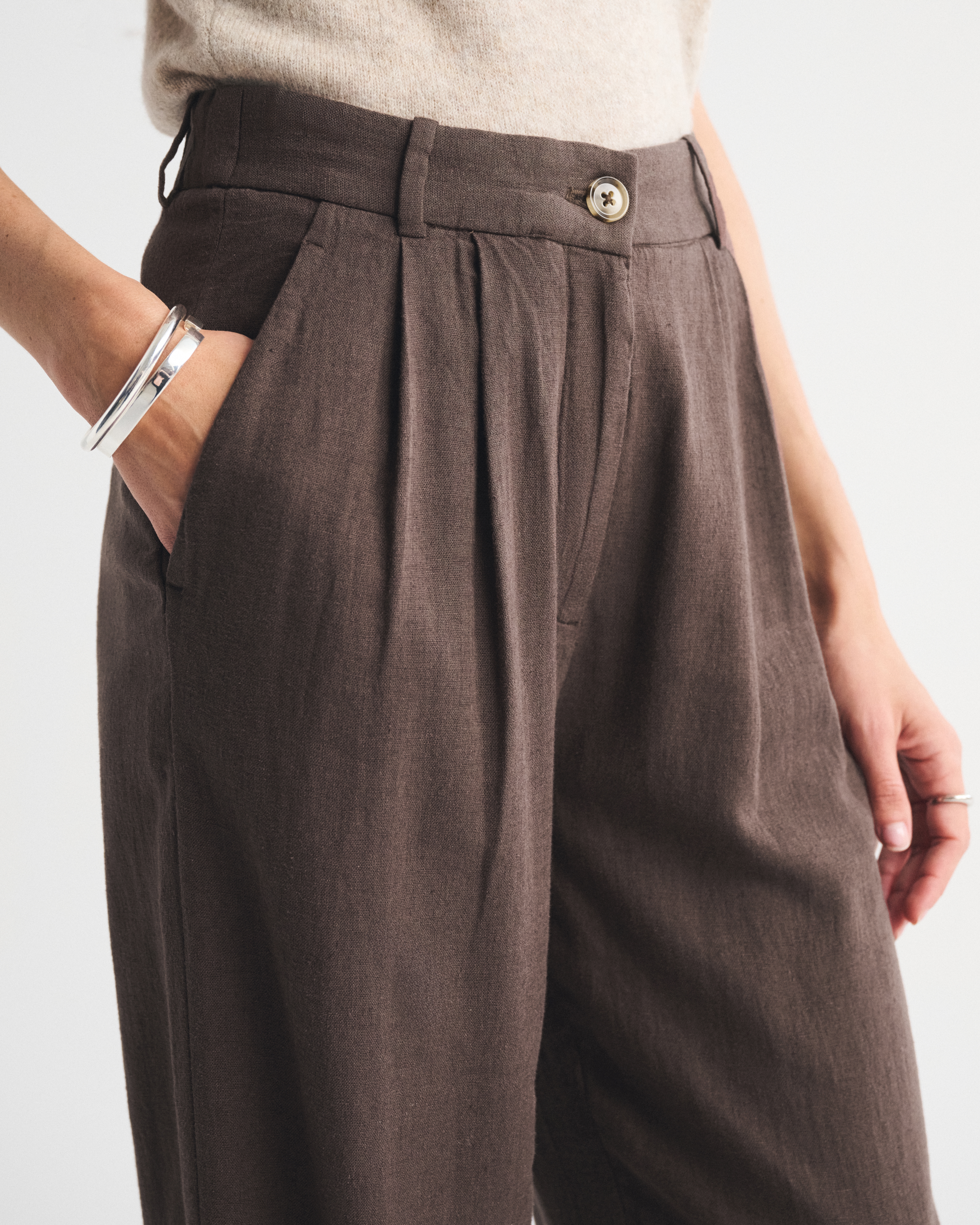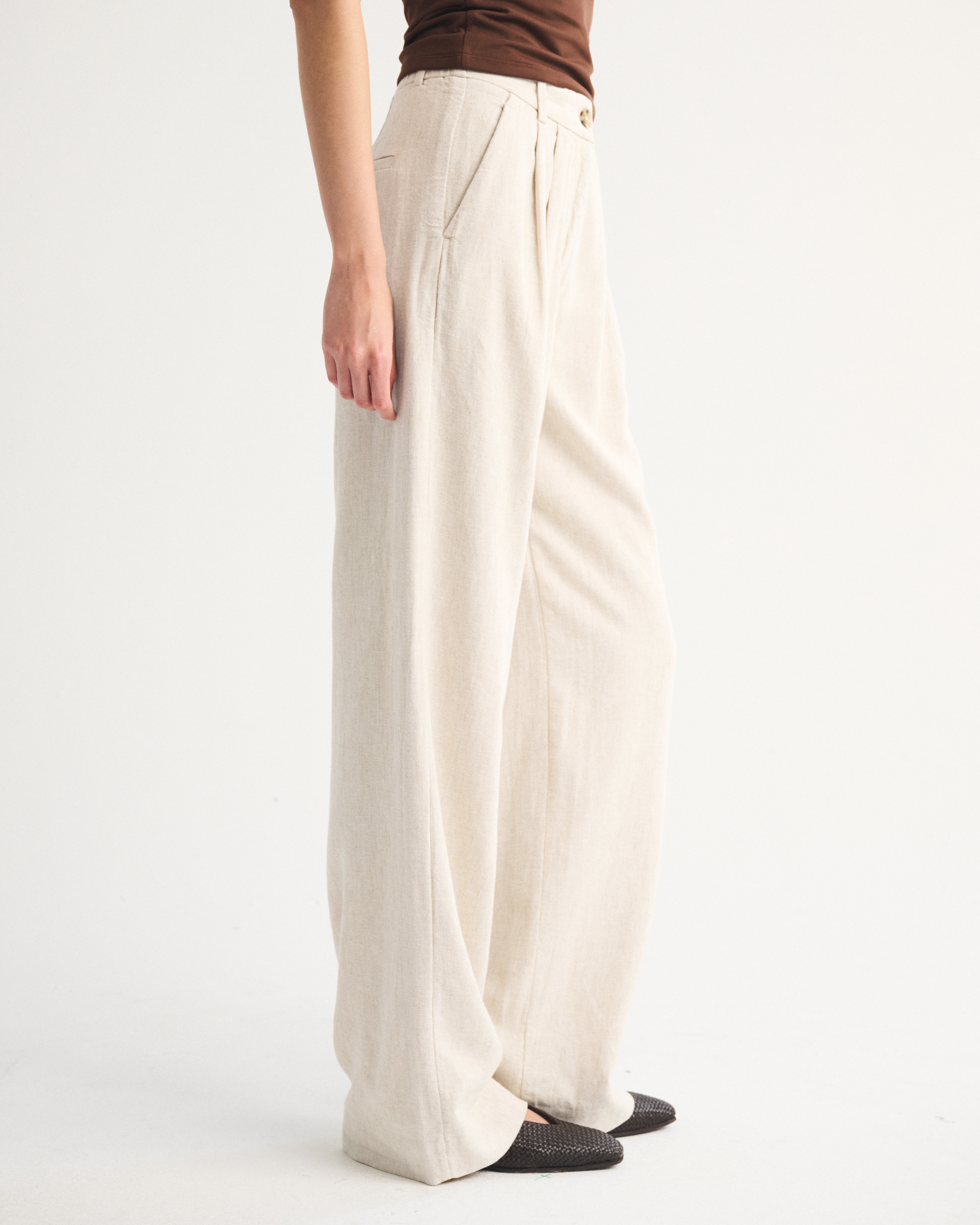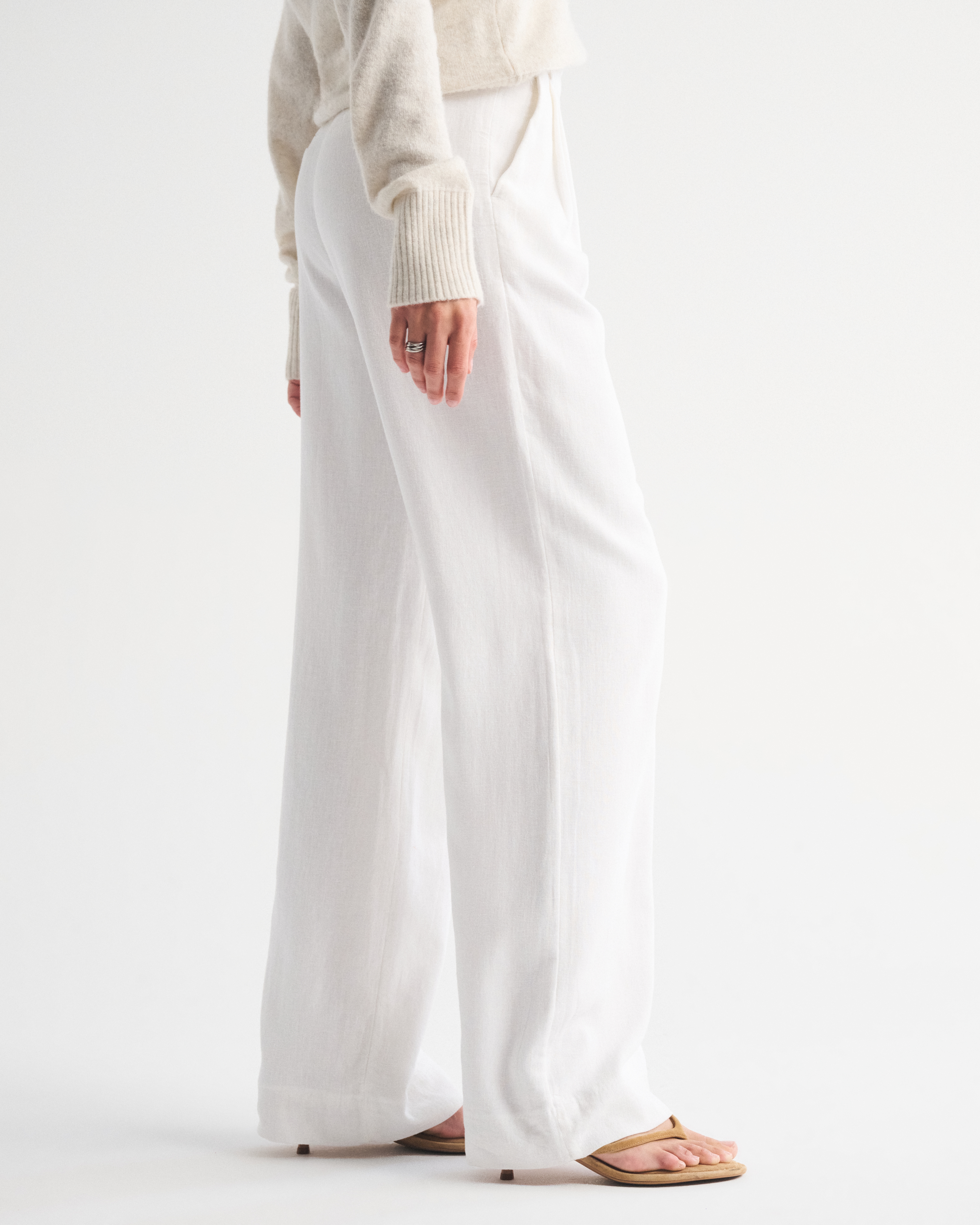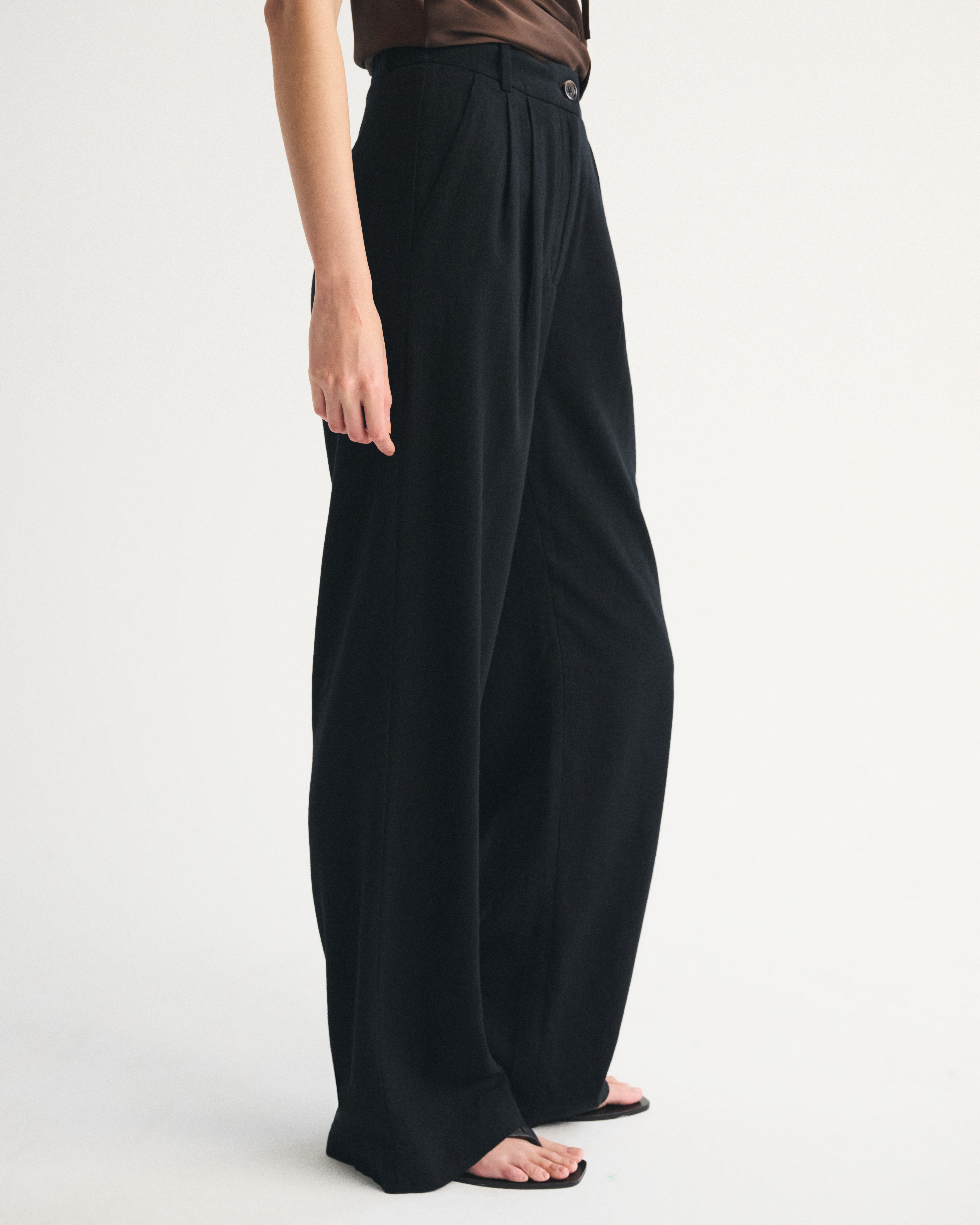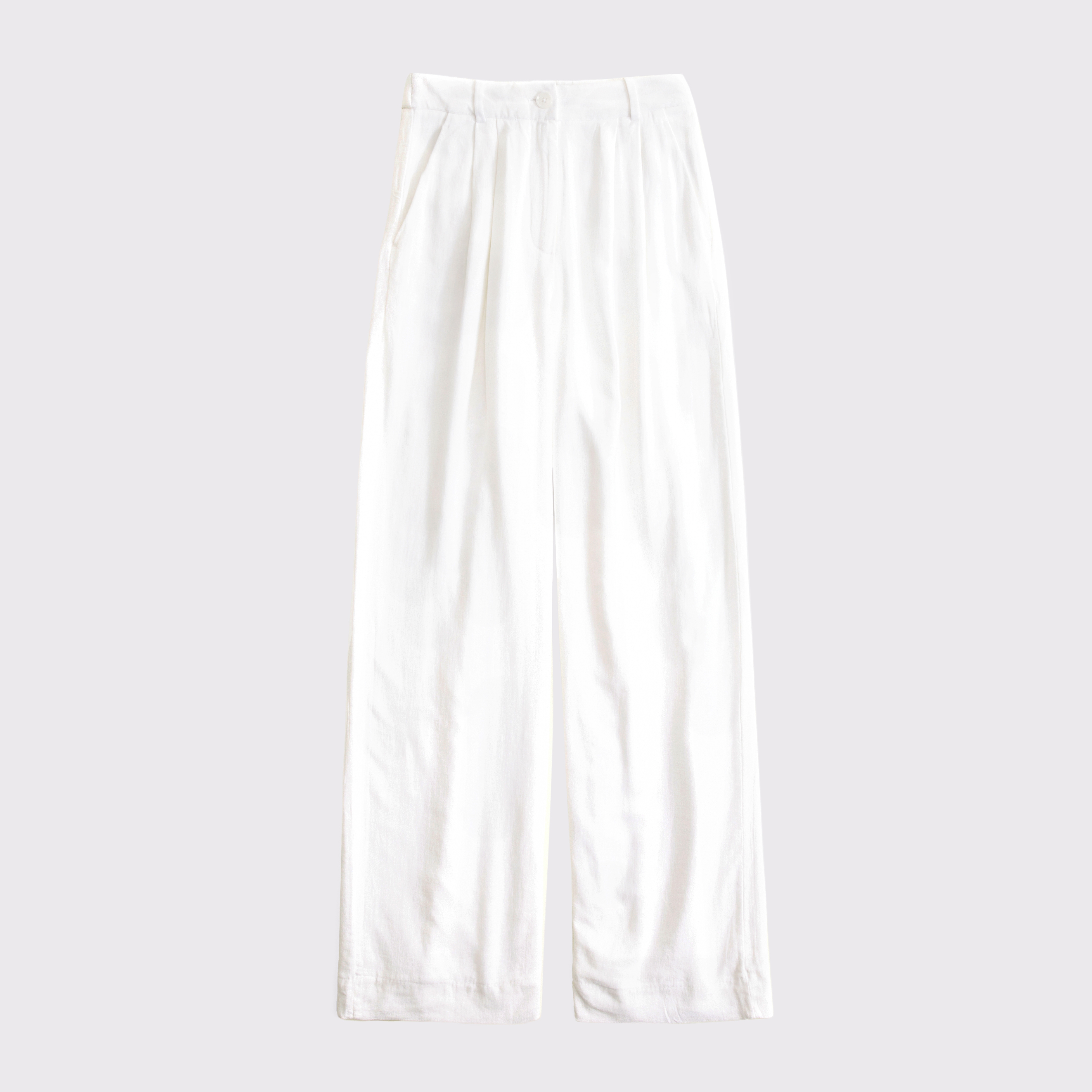 Our signature A&F Sloane tailored pant in our breezy linen-blend fabric. The A&F Sloane Tailored Pant is an ultra high rise tailored wide leg pant with figure-flattering pleat details, a functional fly and a partially elasticated waistband for ultimate adjustability. This fit is relaxed through the hips, and eases into a wide, full-length leg shape. Imported.