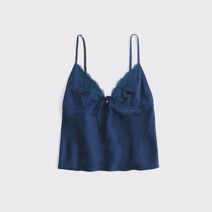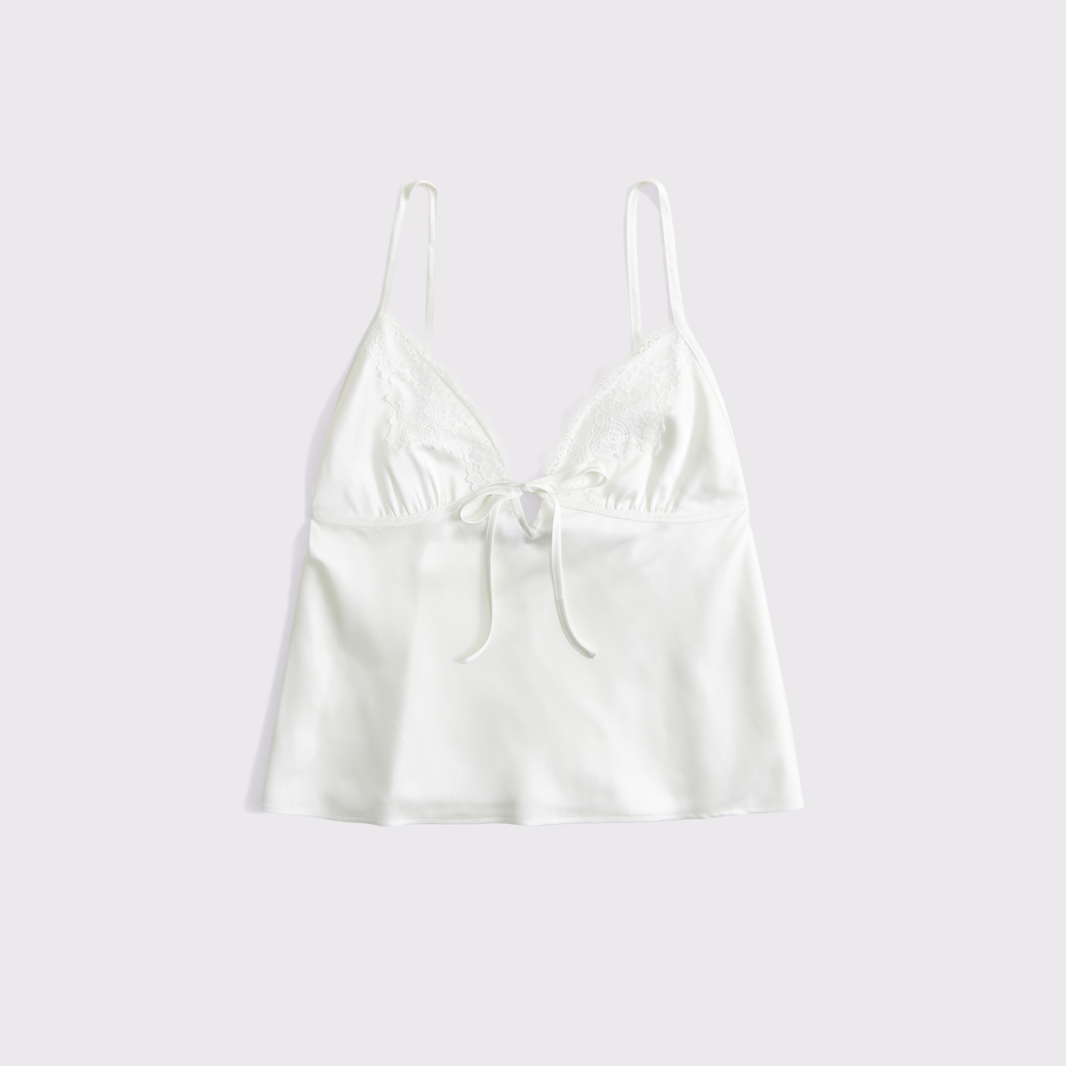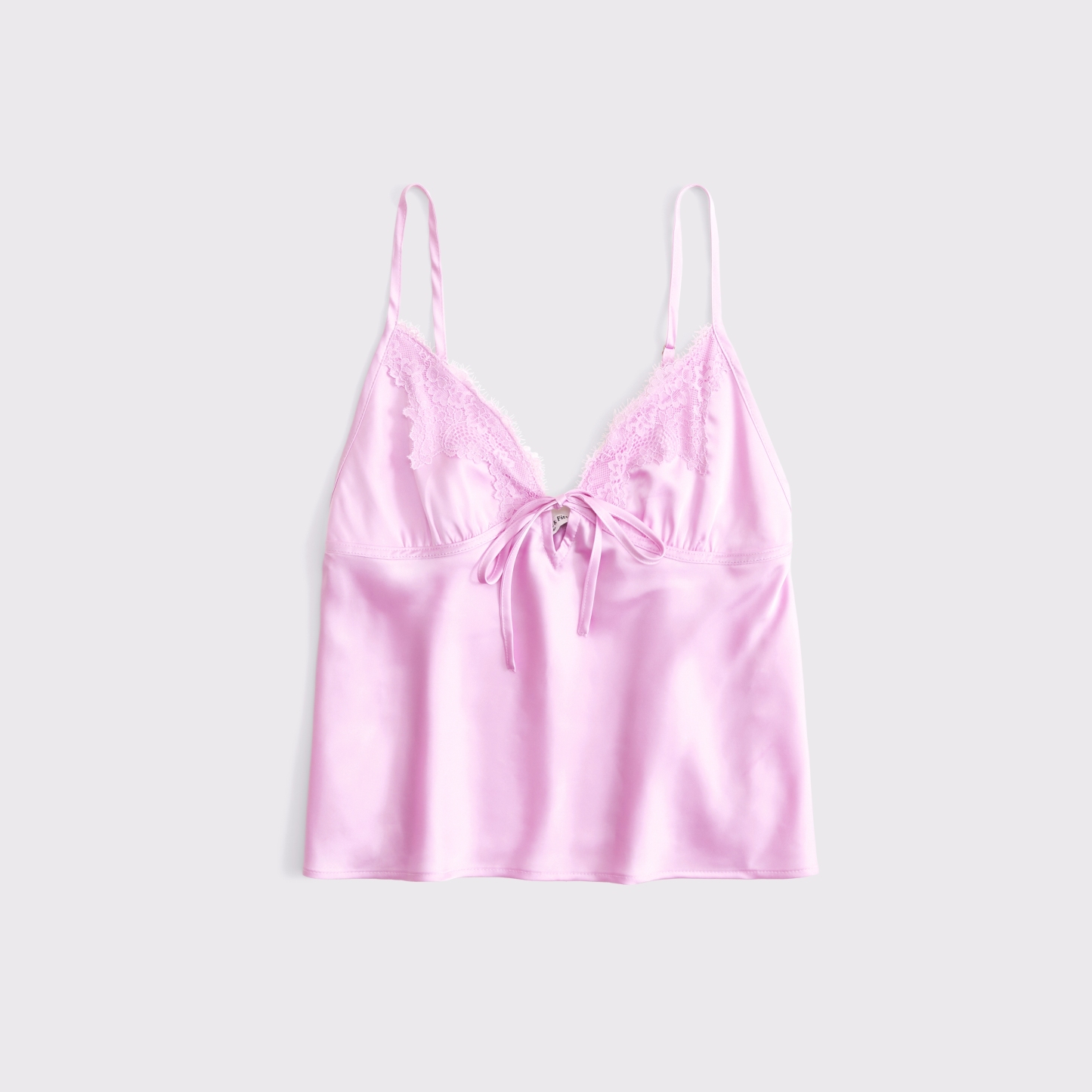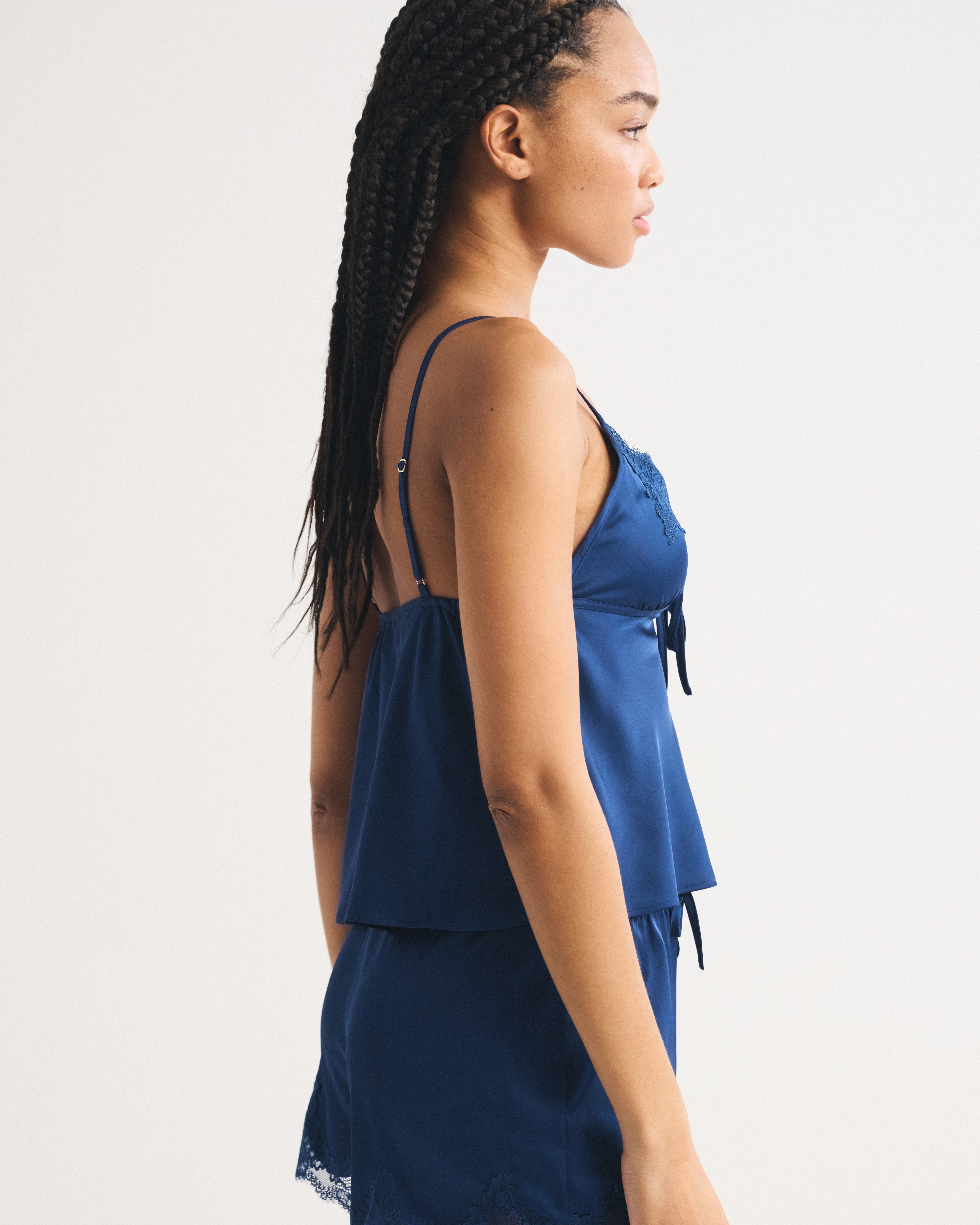 Classic sleep cami in our silky soft satin fabric. Features lace-trim details at the V-neckline, an adjustable tie-front detail, adjustable straps and an elasticated back for the perfect fit to keep you comfortable all night. Imported.