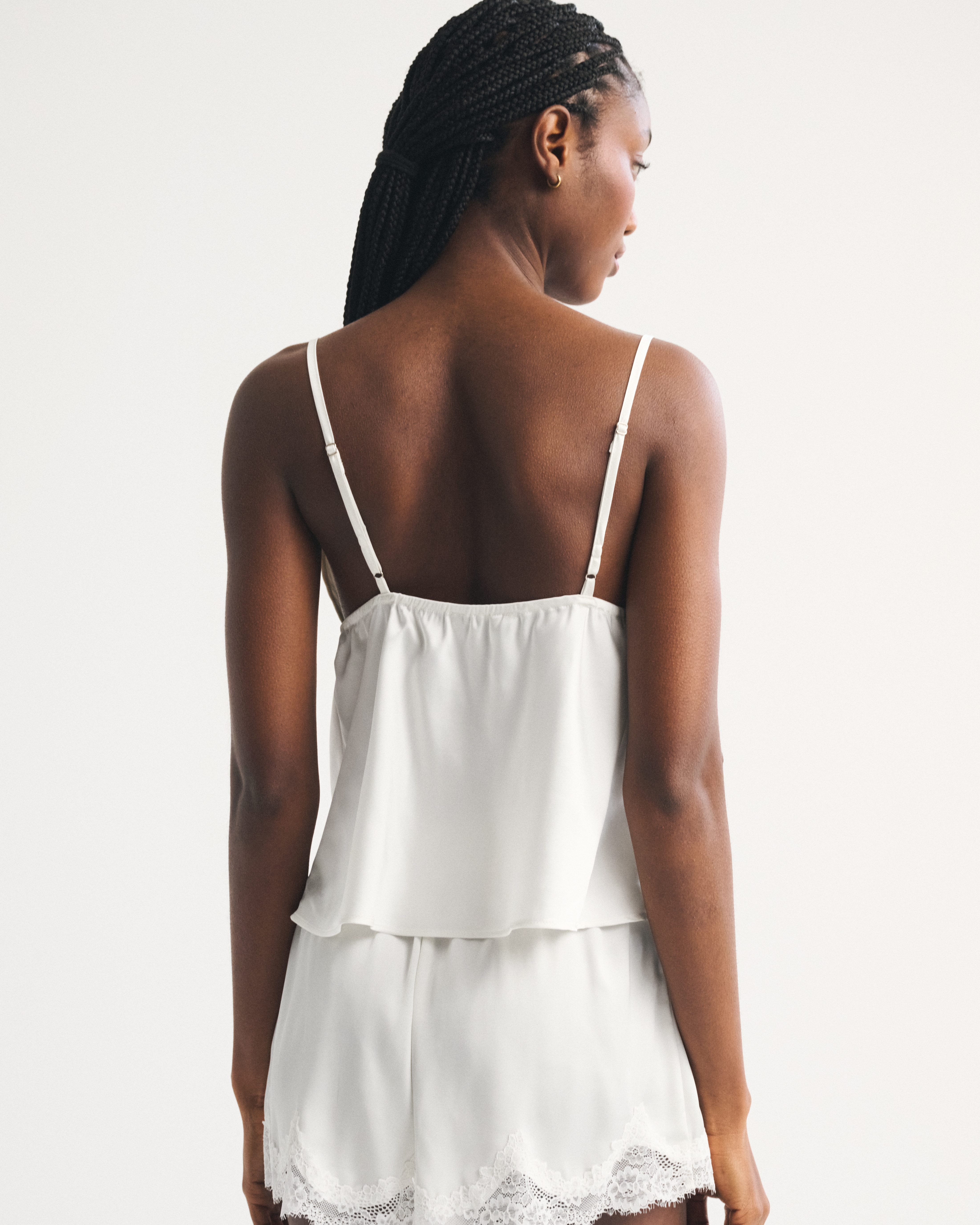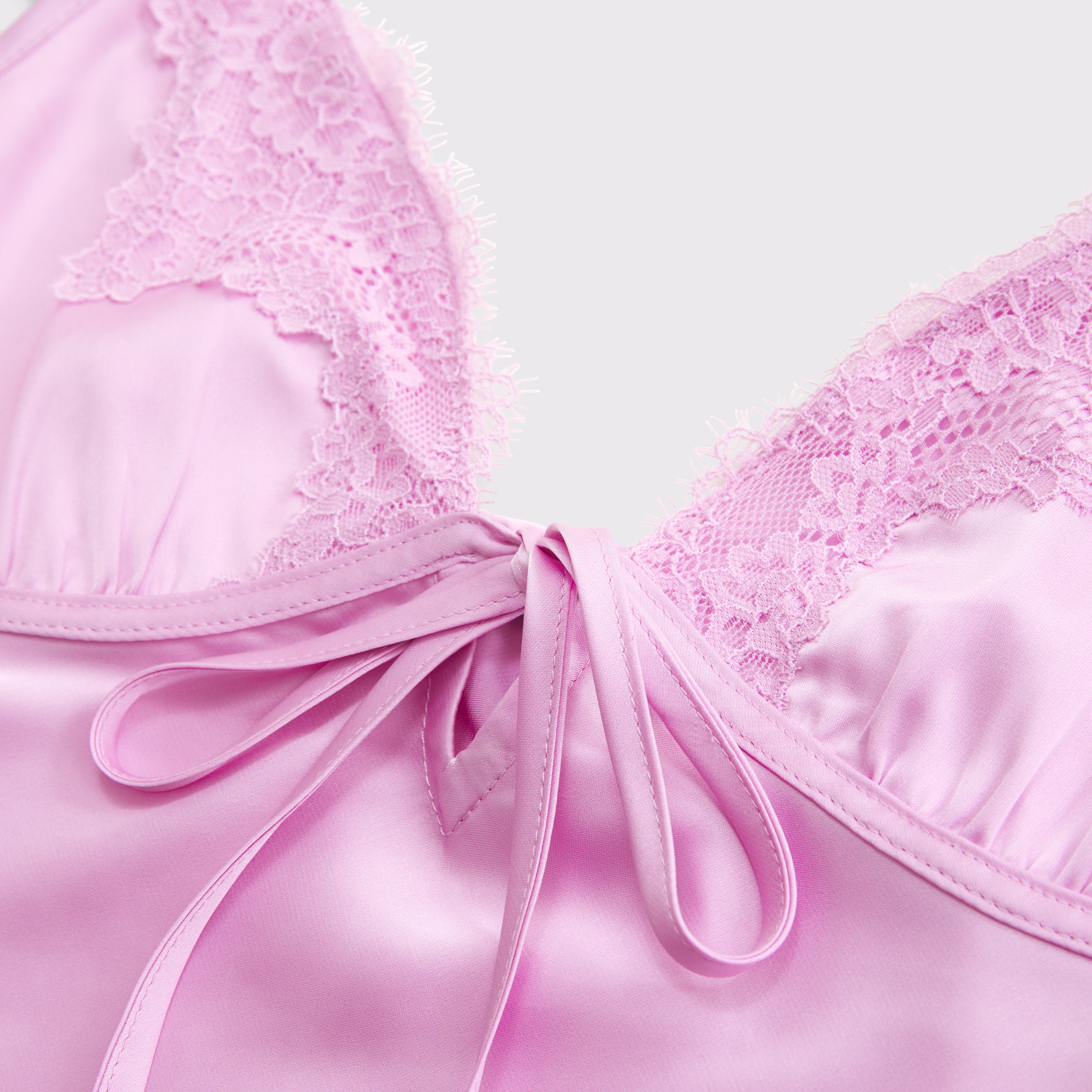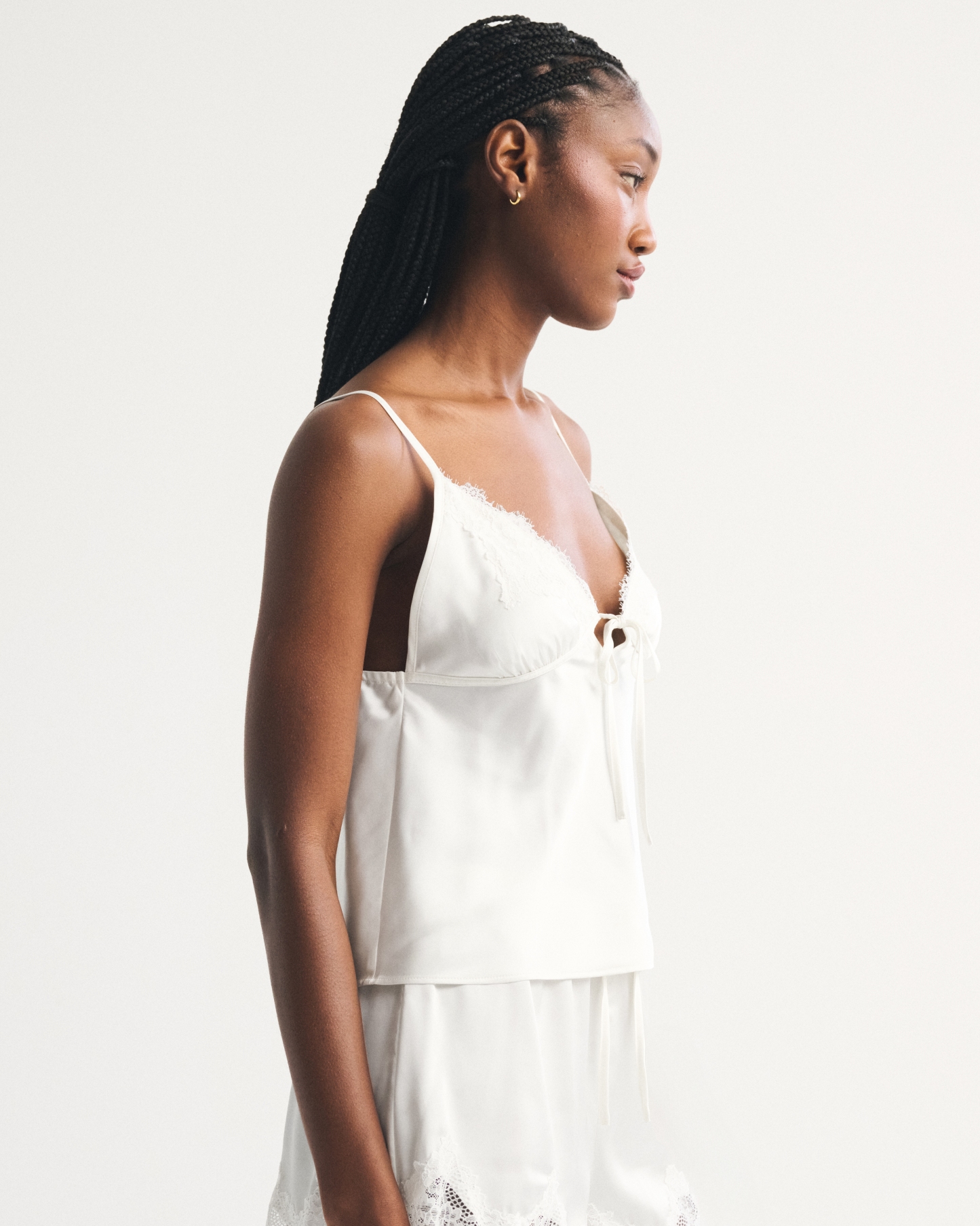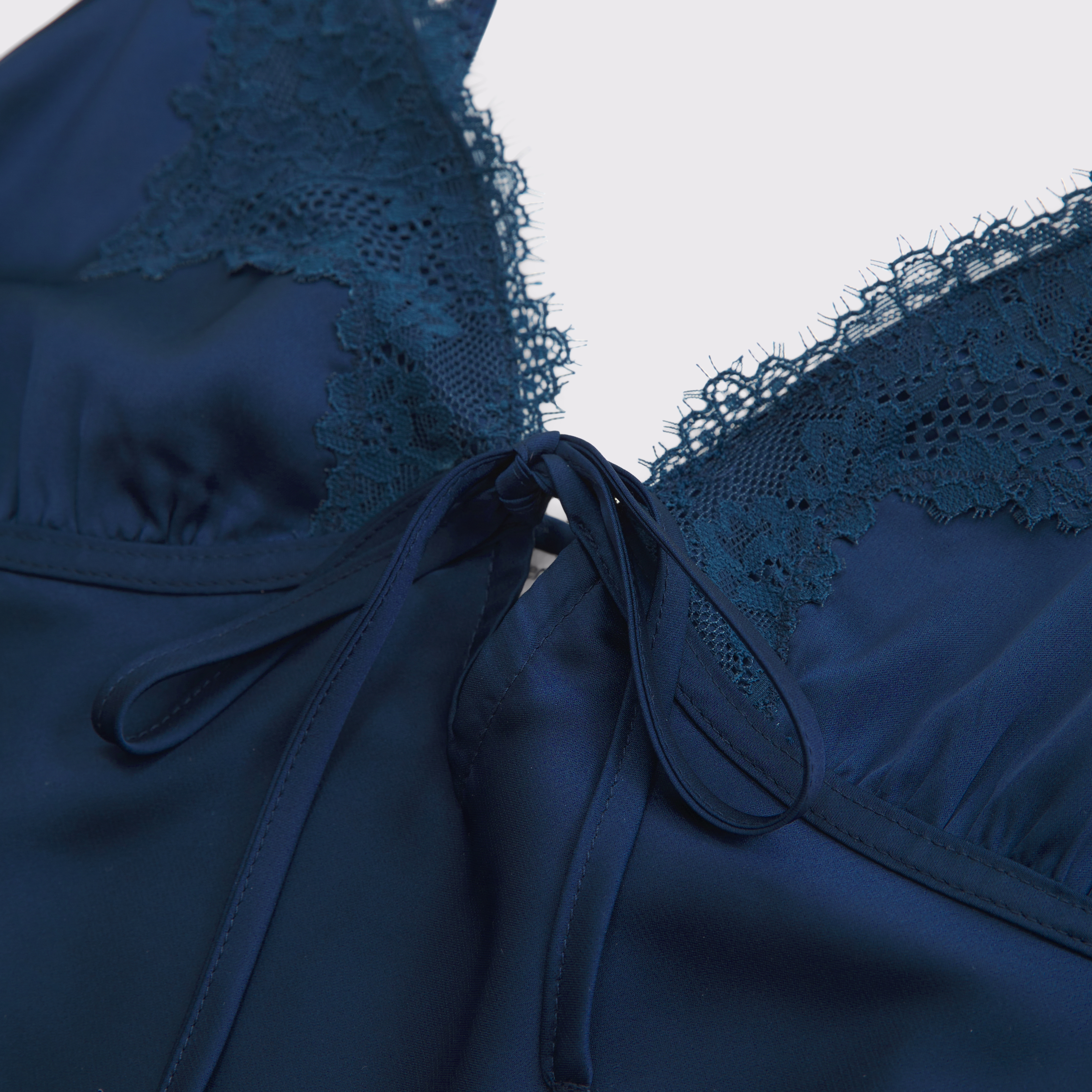 Classic sleep cami in our silky soft satin fabric. Features lace-trim details at the V-neckline, an adjustable tie-front detail, adjustable straps and an elasticated back for the perfect fit to keep you comfortable all night. Imported.
