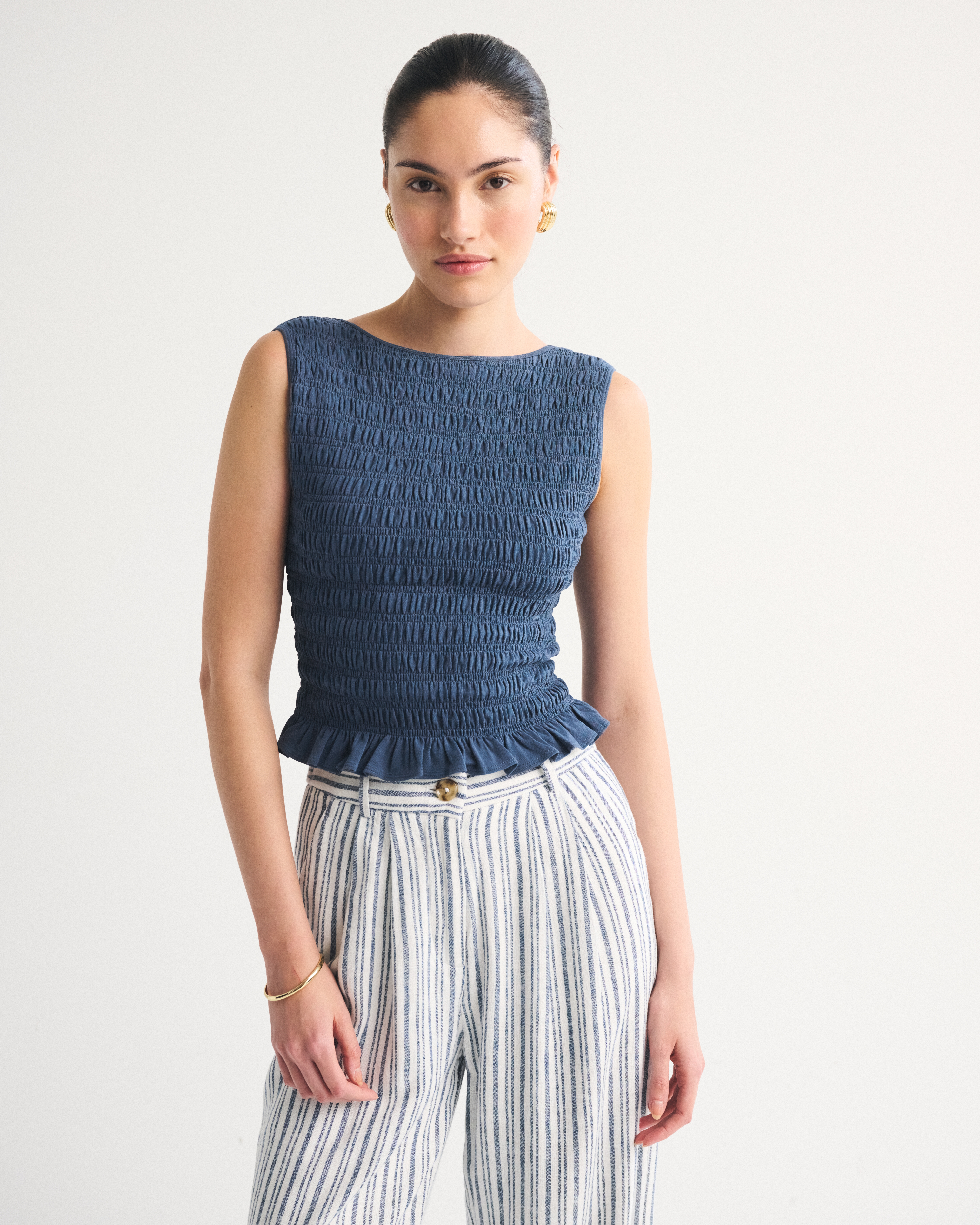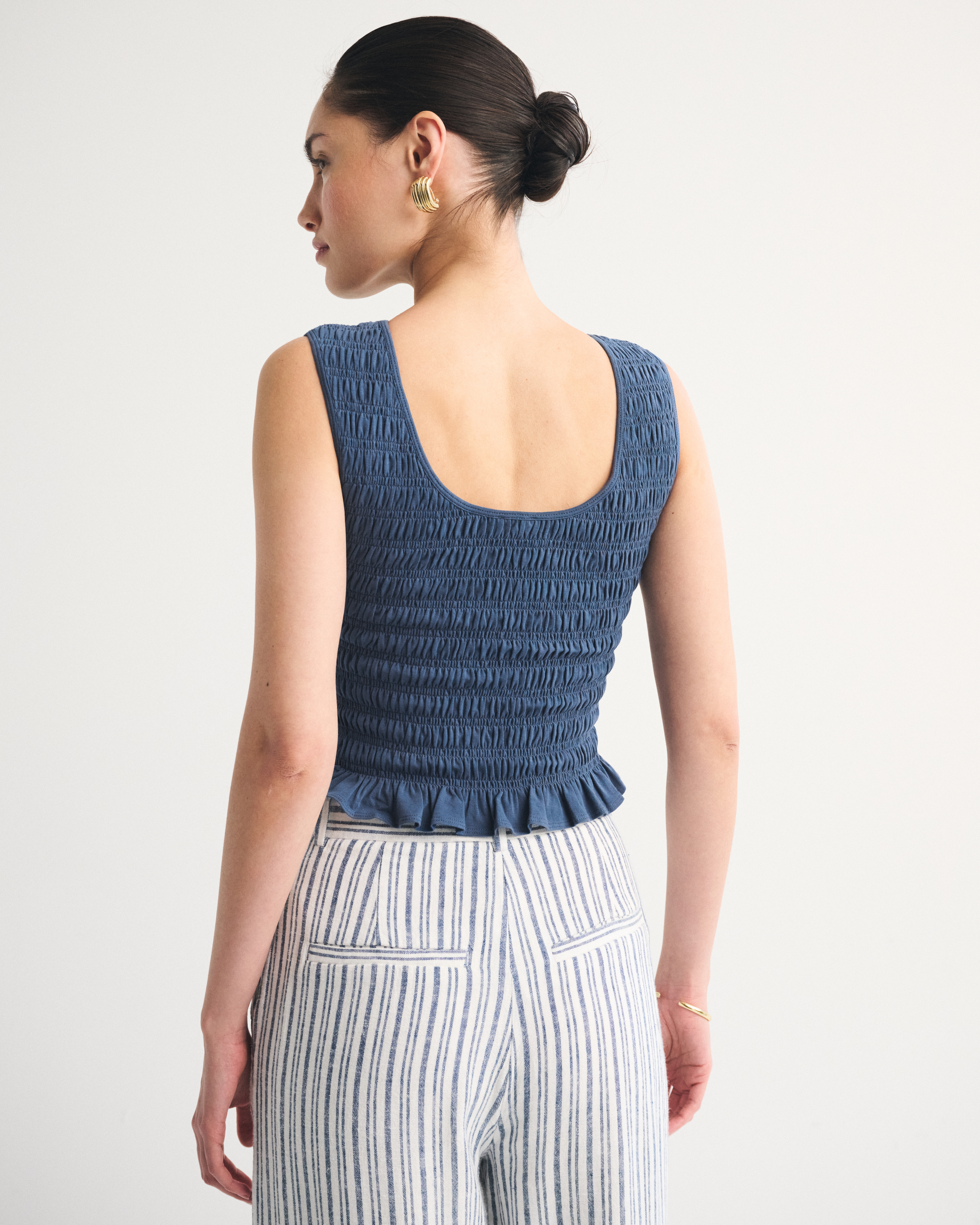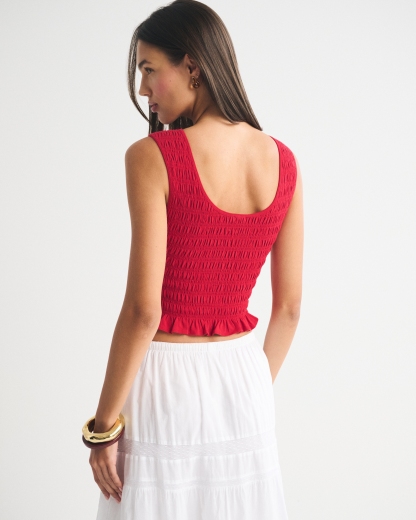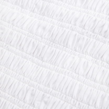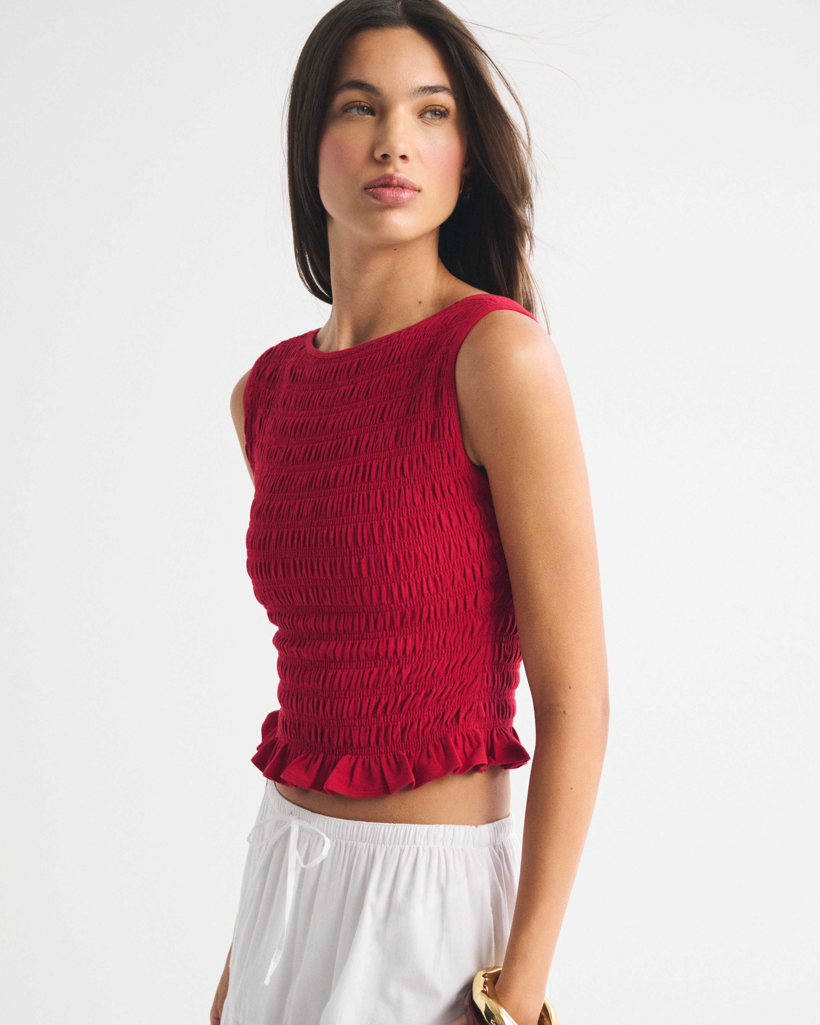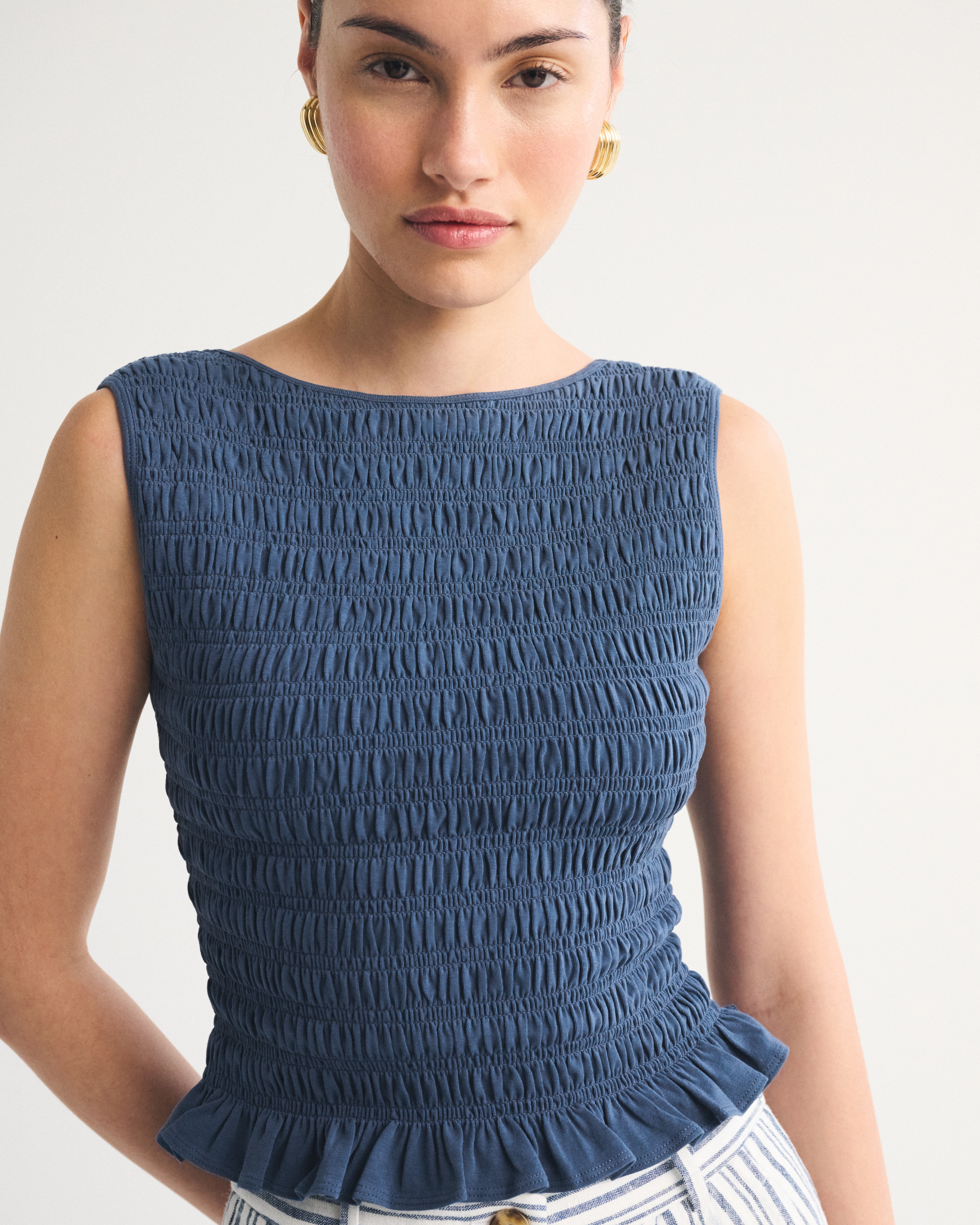 Slim-fitting shell top in our softAF cotton-blend seamless fabric, with all-over smocking details along the bodice. This reversible top offers a scoop neckline on one side and a slash neckline on the other when turned front to back. Imported.