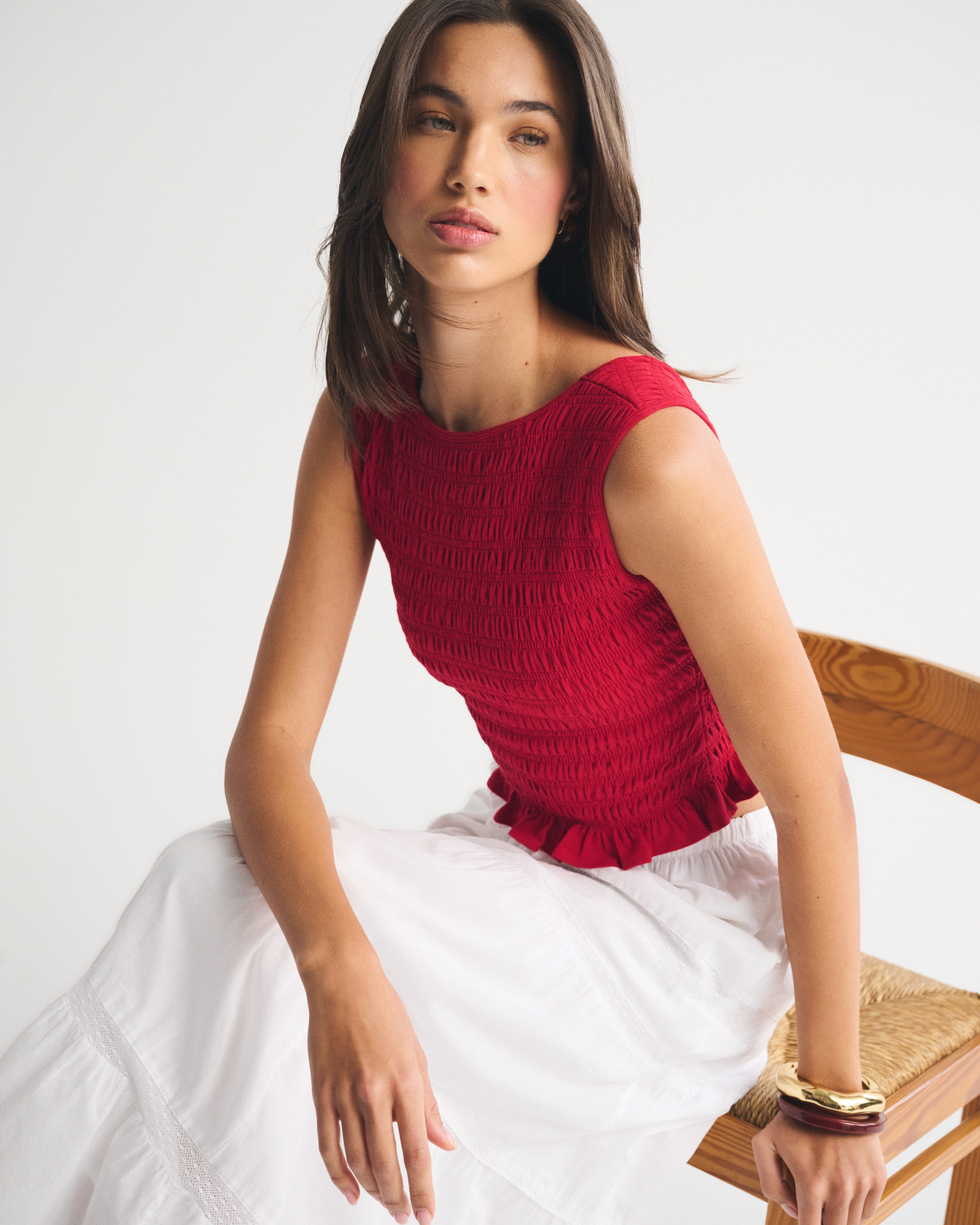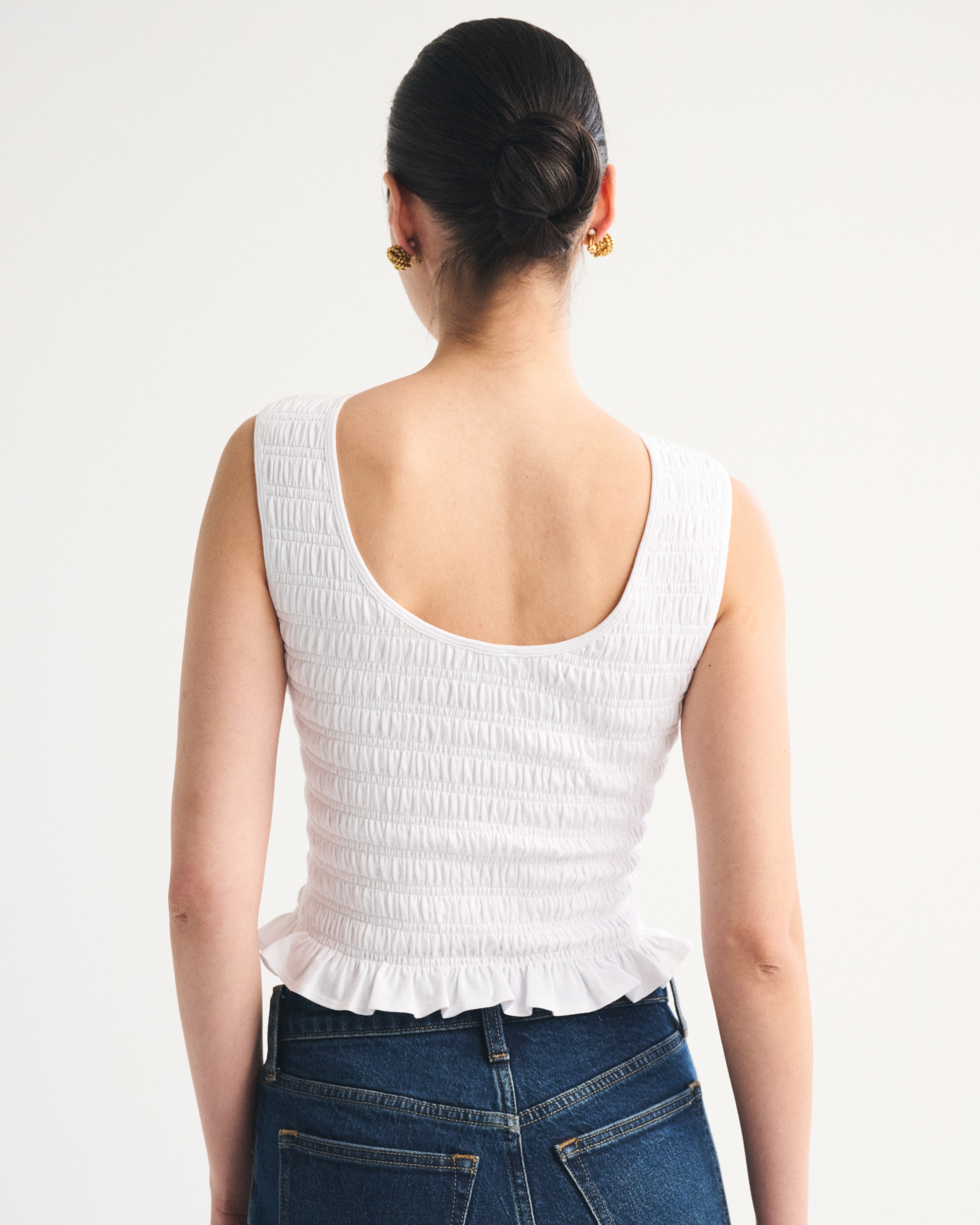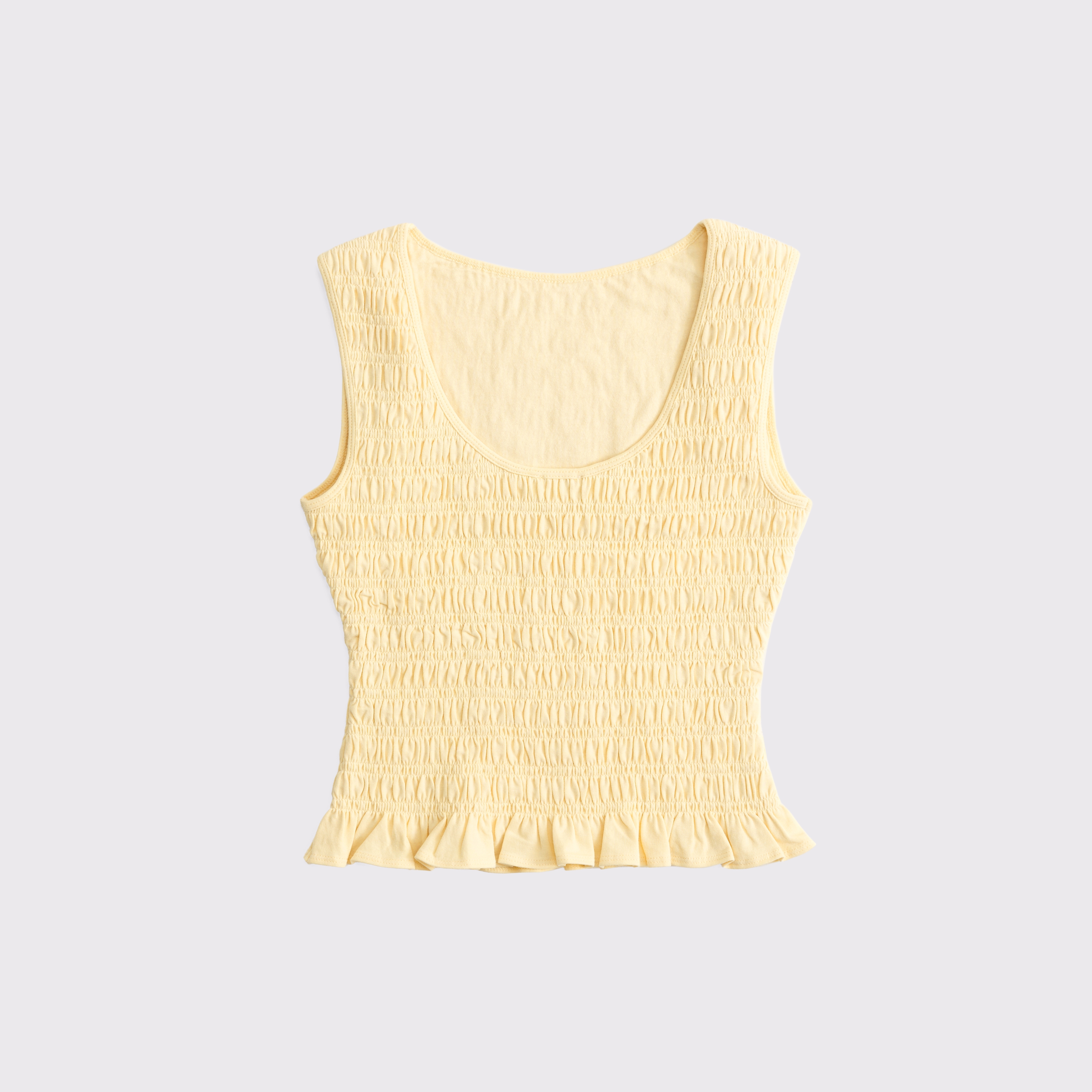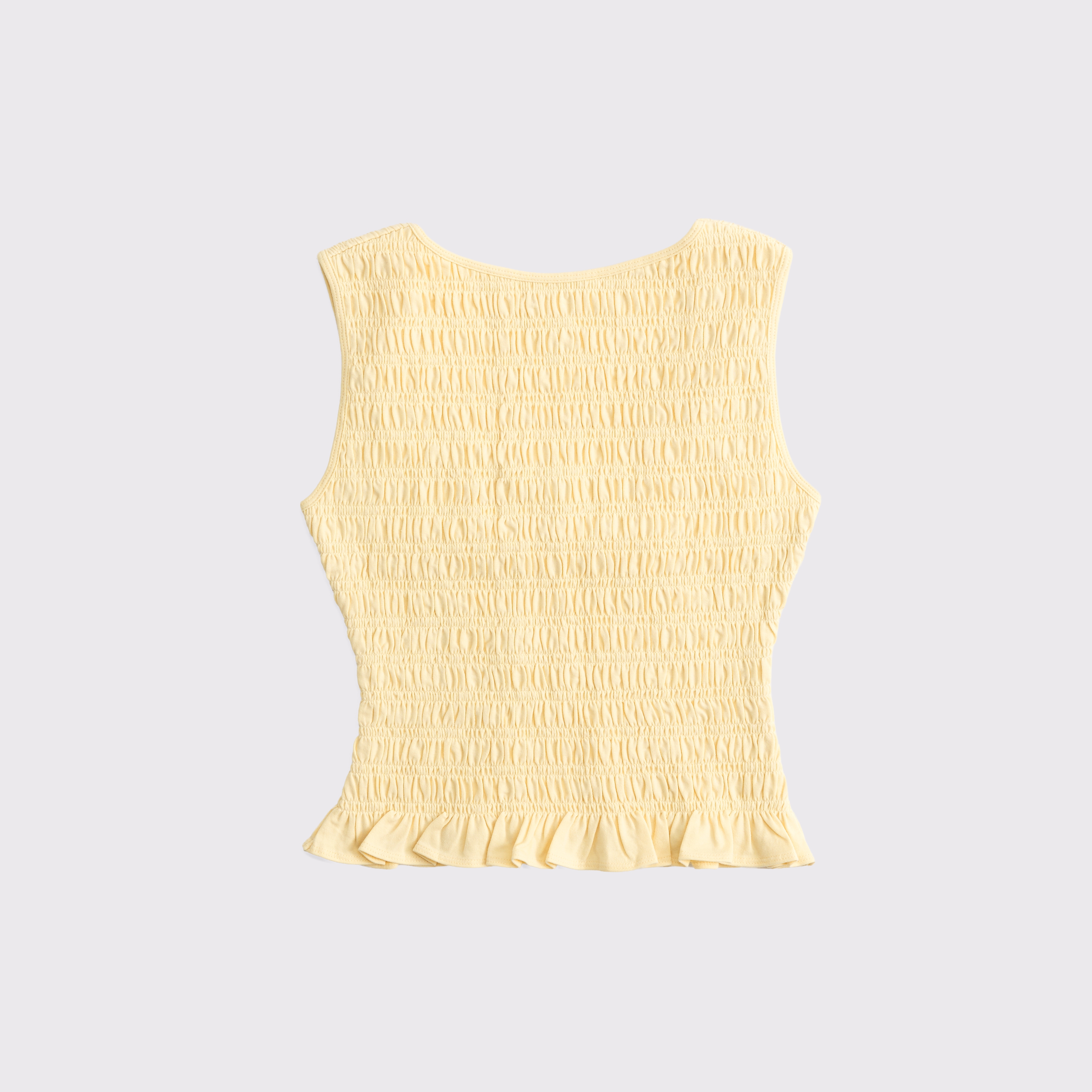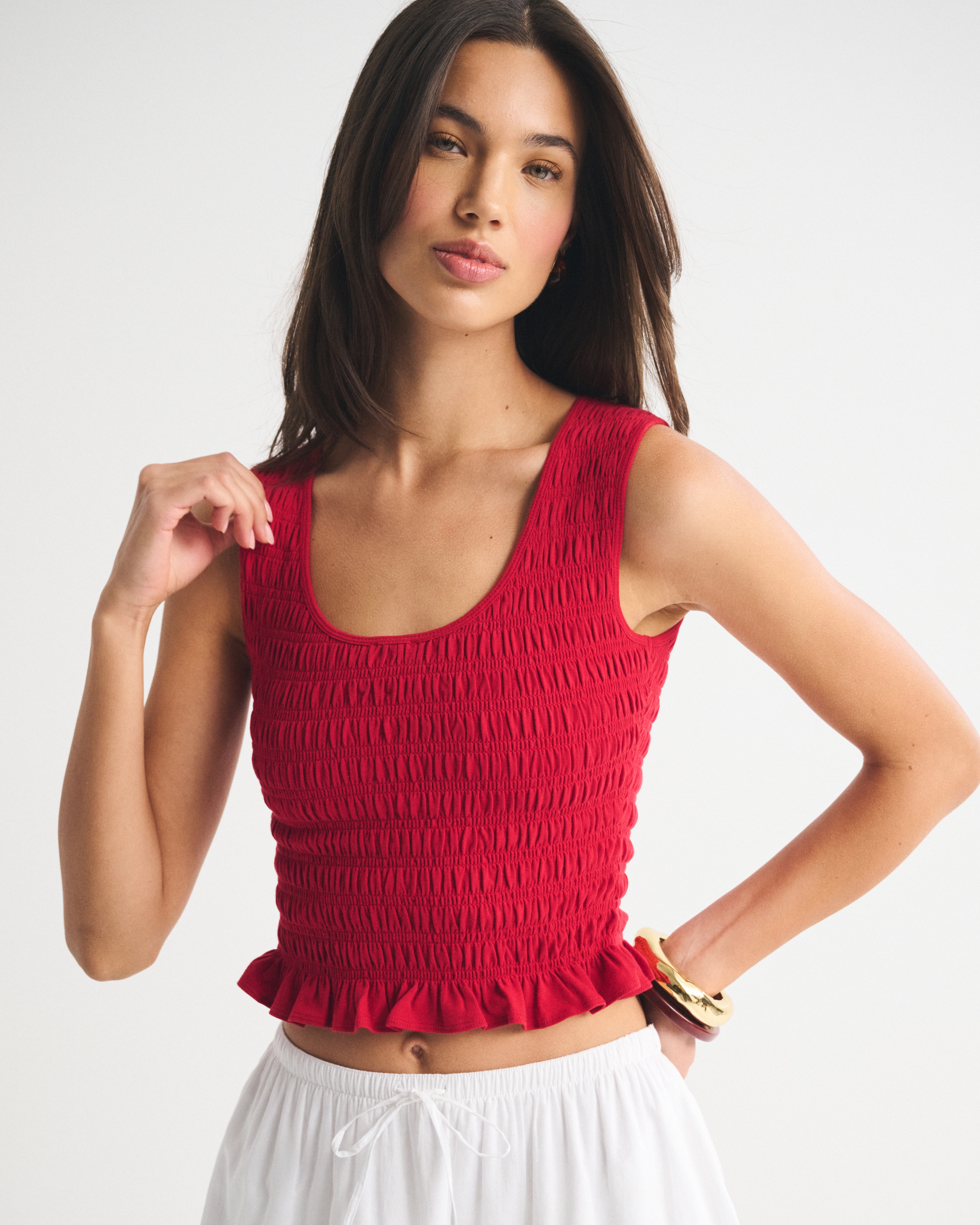 Slim-fitting shell top in our softAF cotton-blend seamless fabric, with all-over smocking details along the bodice. This reversible top offers a scoop neckline on one side and a slash neckline on the other when turned front to back. Imported.