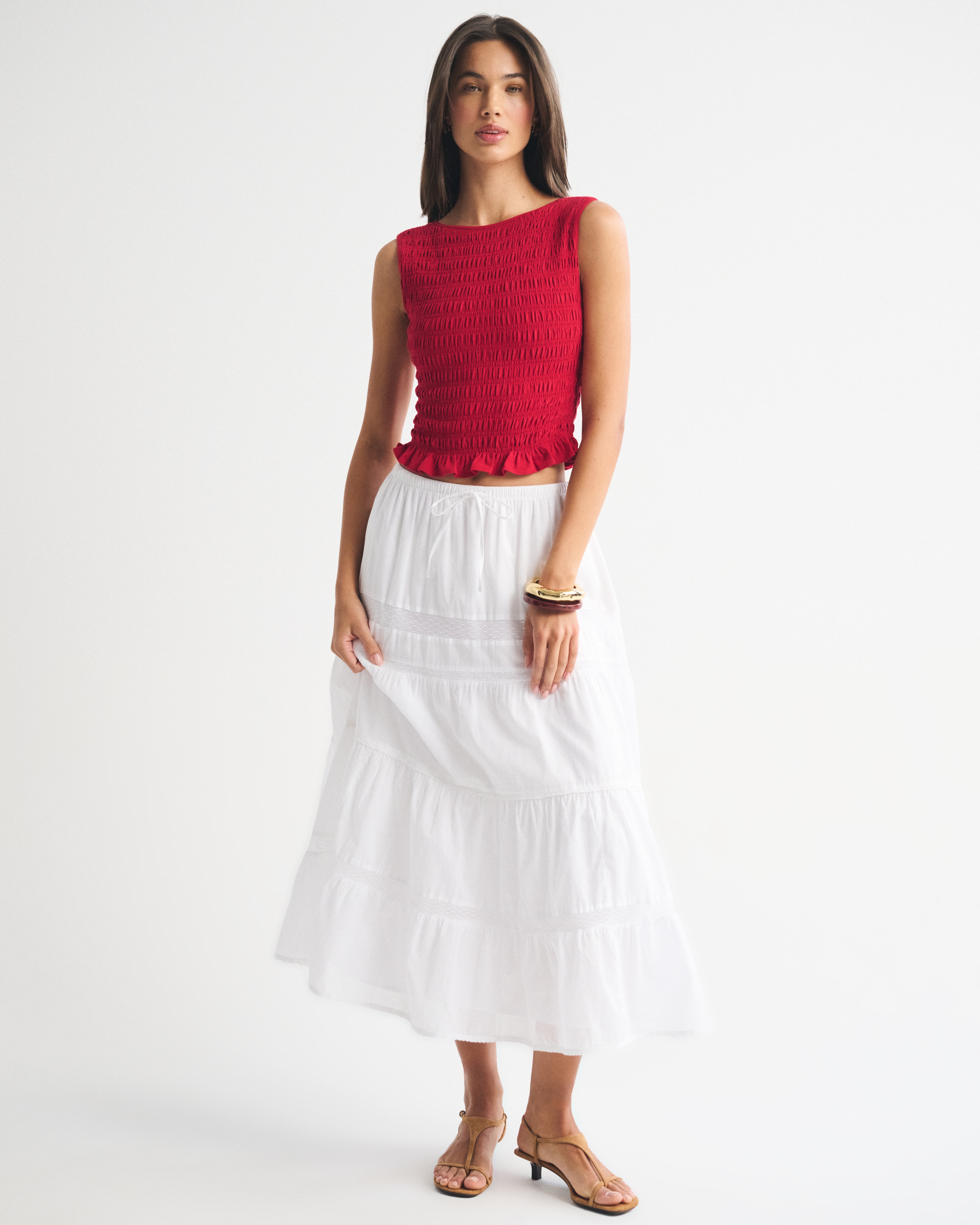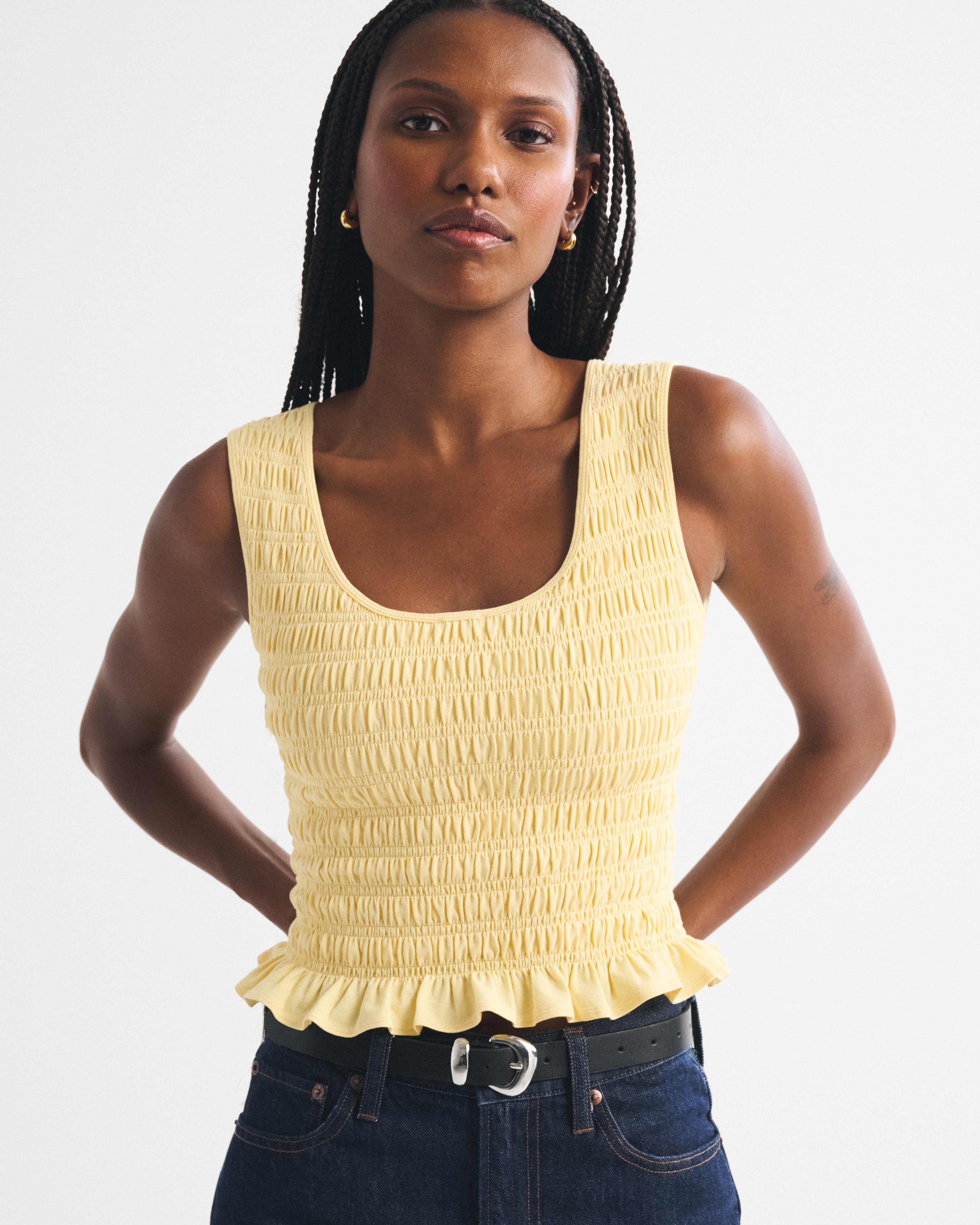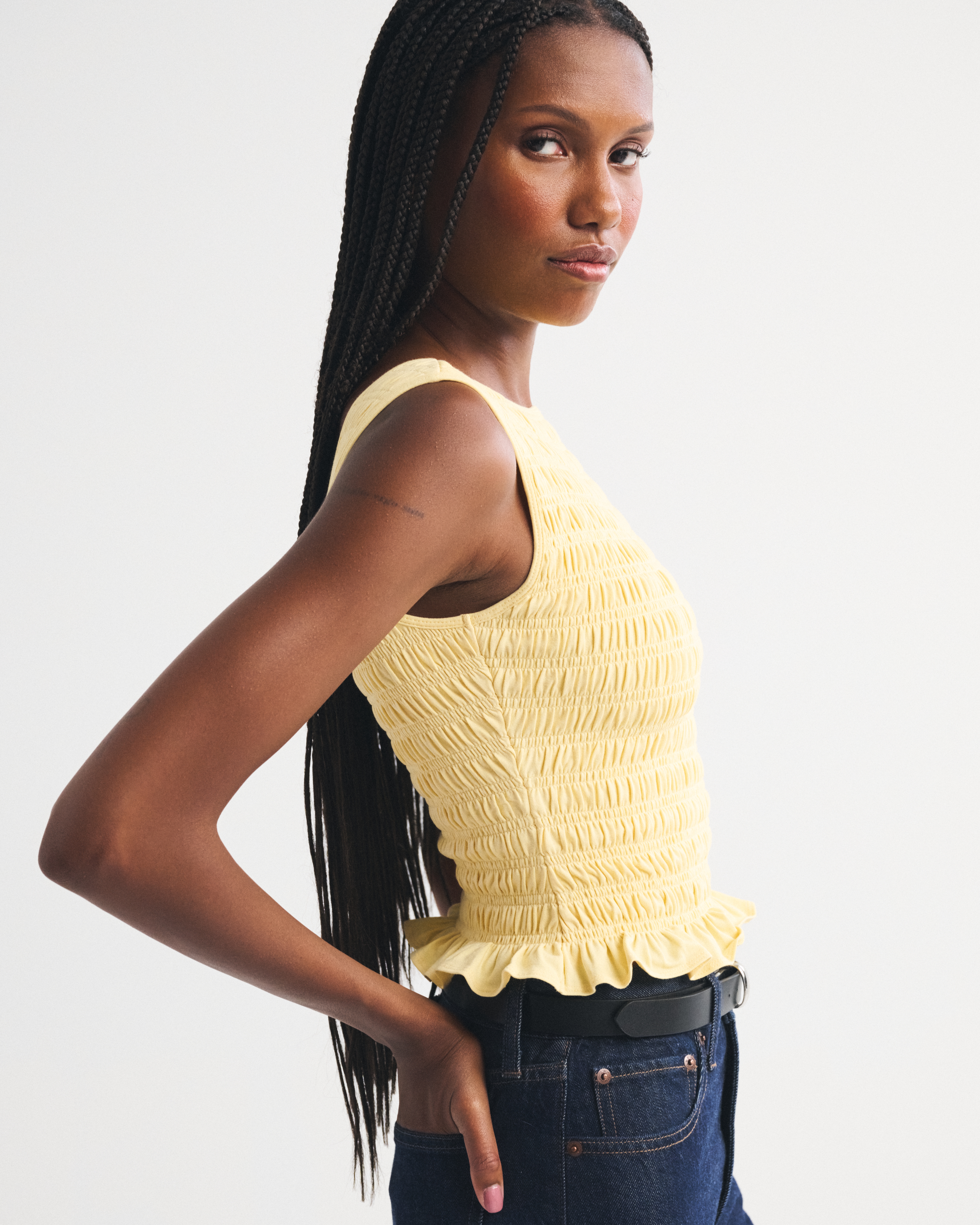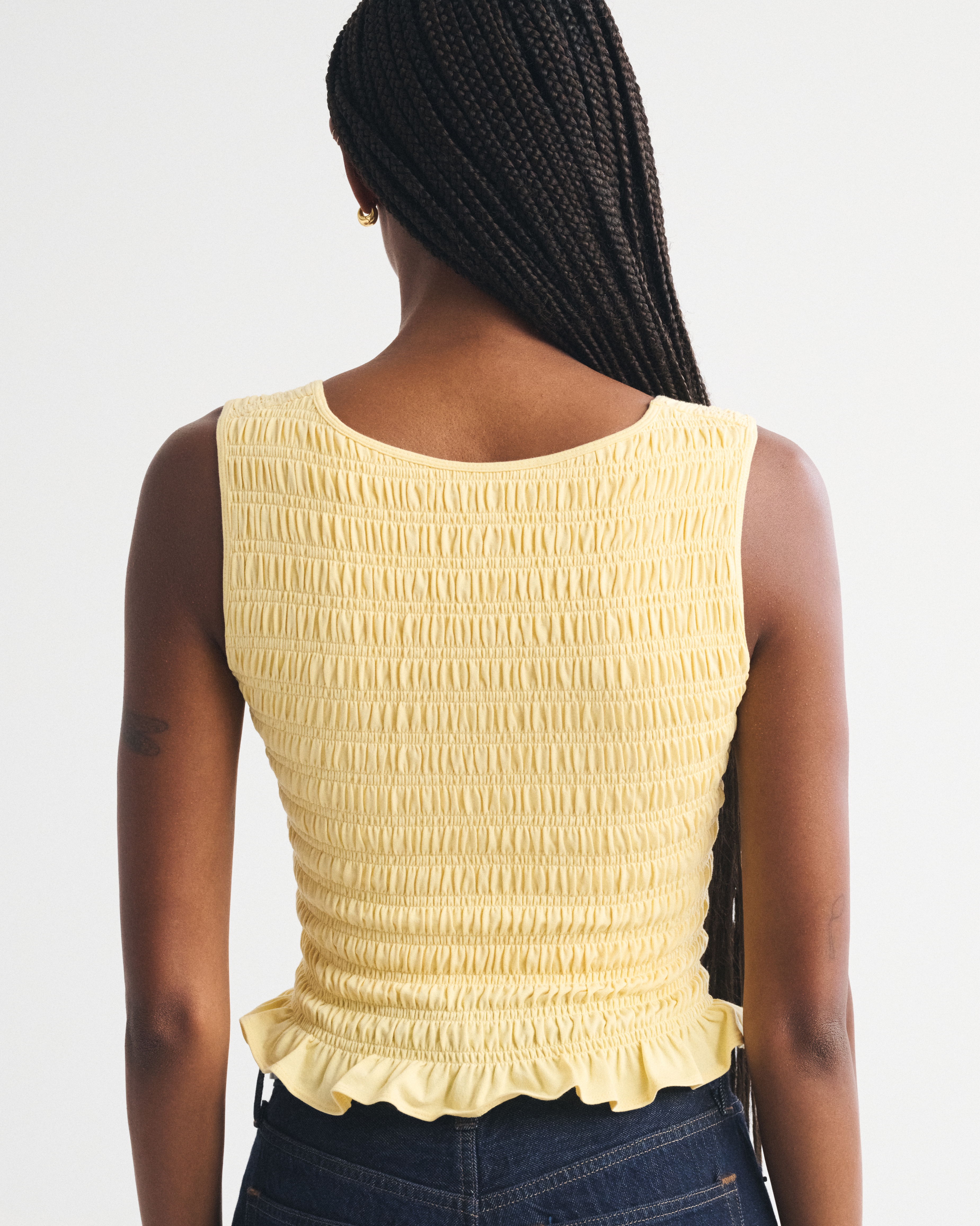 Slim-fitting shell top in our softAF cotton-blend seamless fabric, with all-over smocking details along the bodice. This reversible top offers a scoop neckline on one side and a slash neckline on the other when turned front to back. Imported.