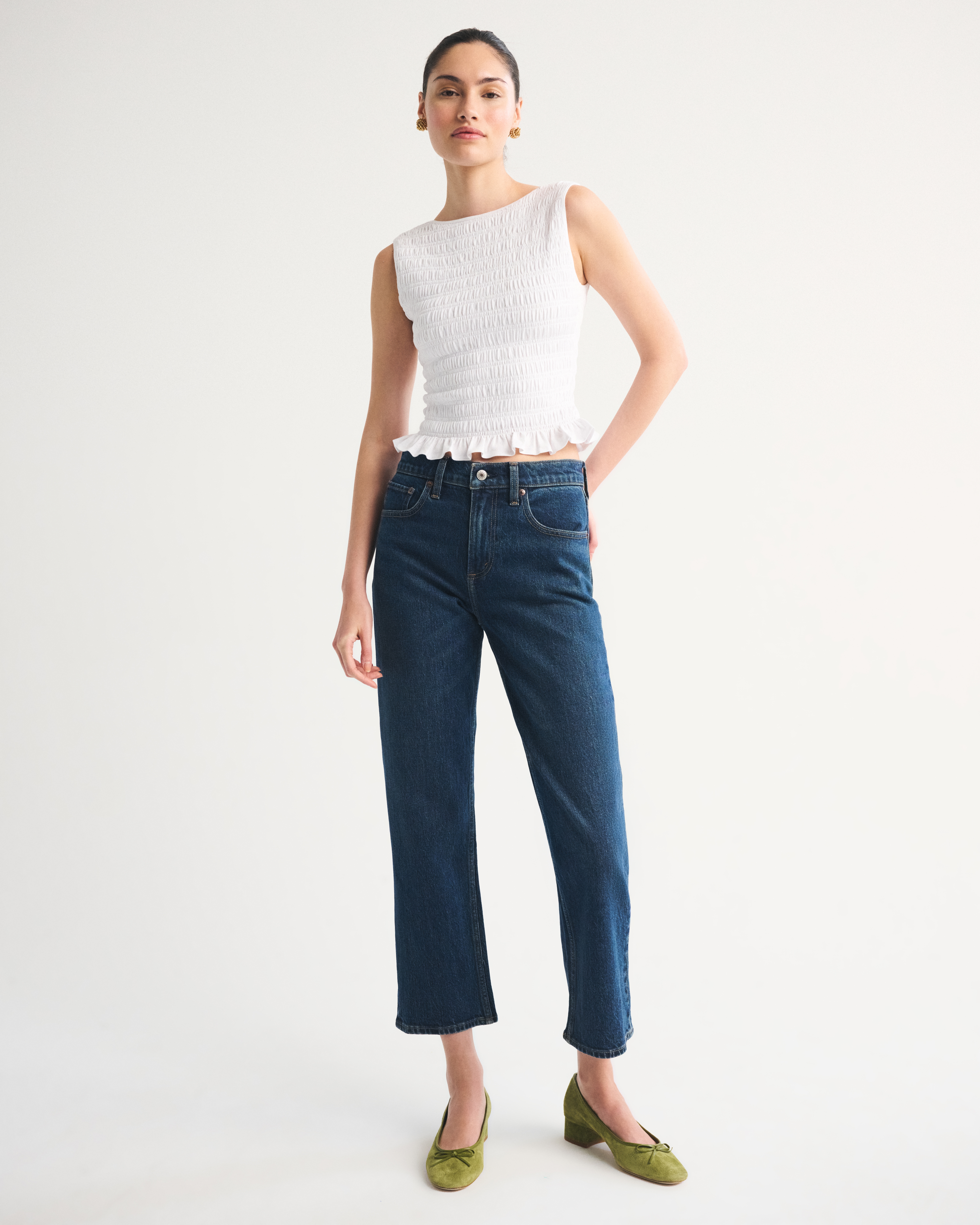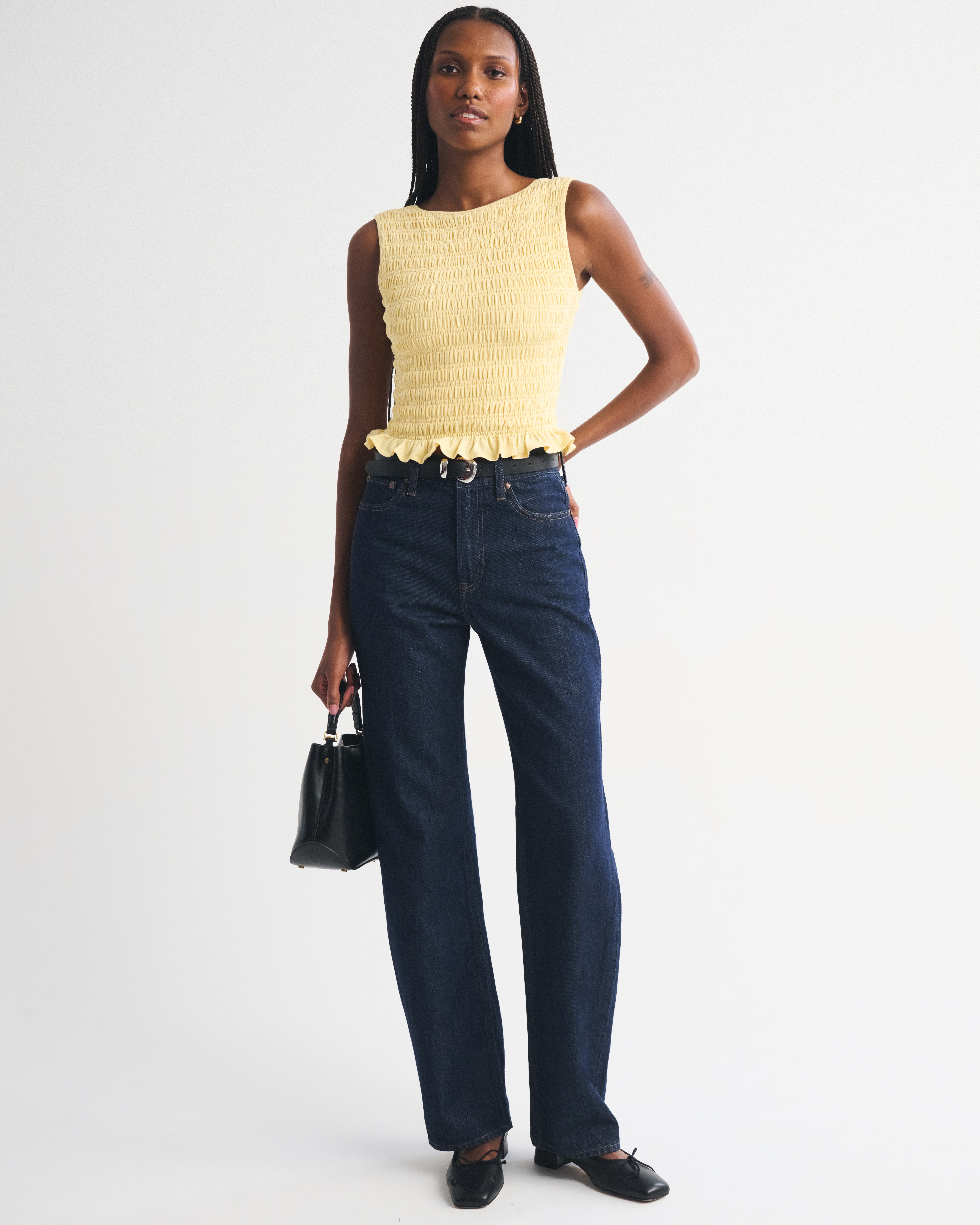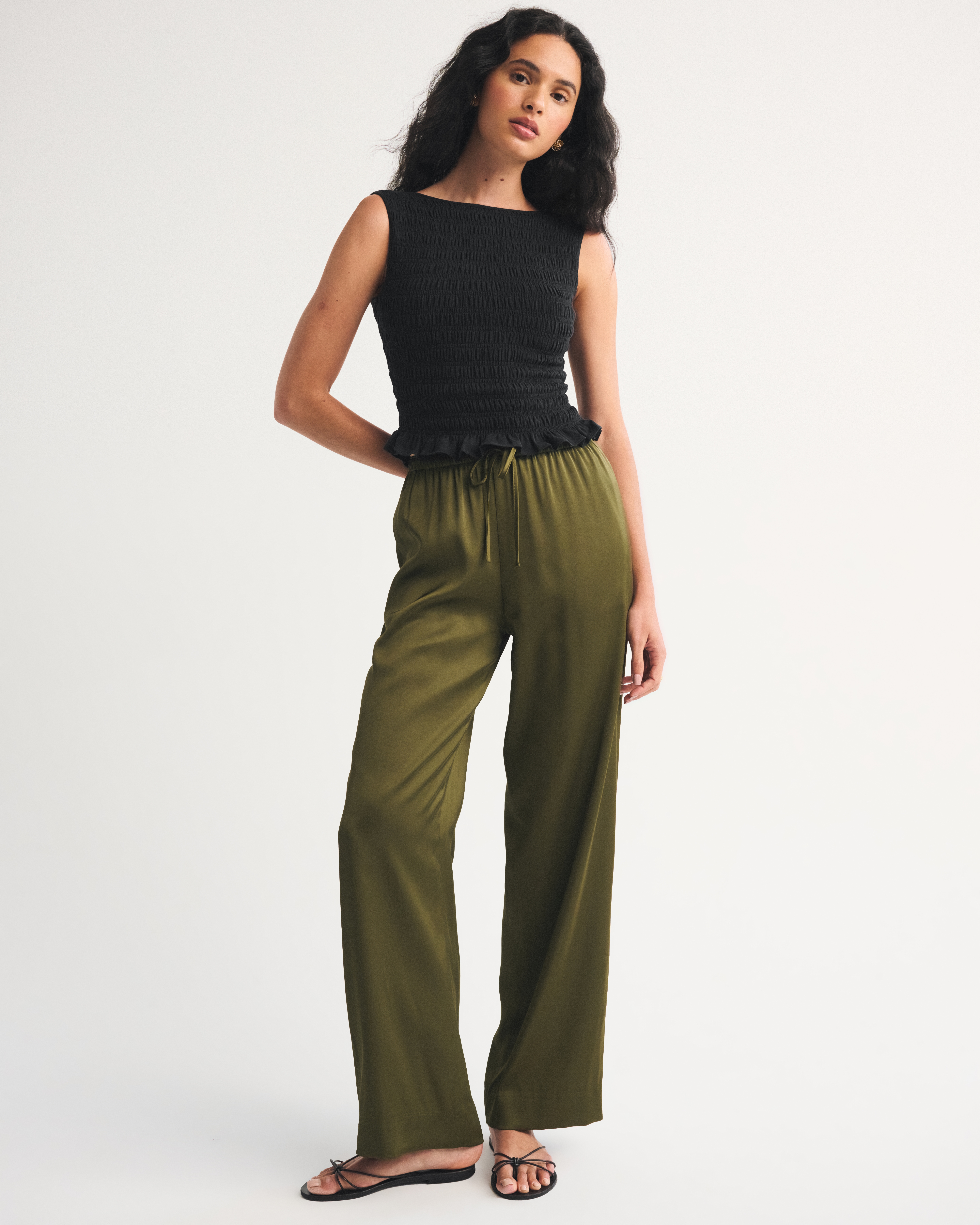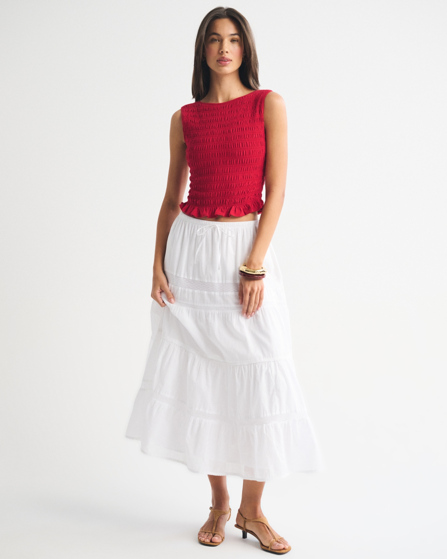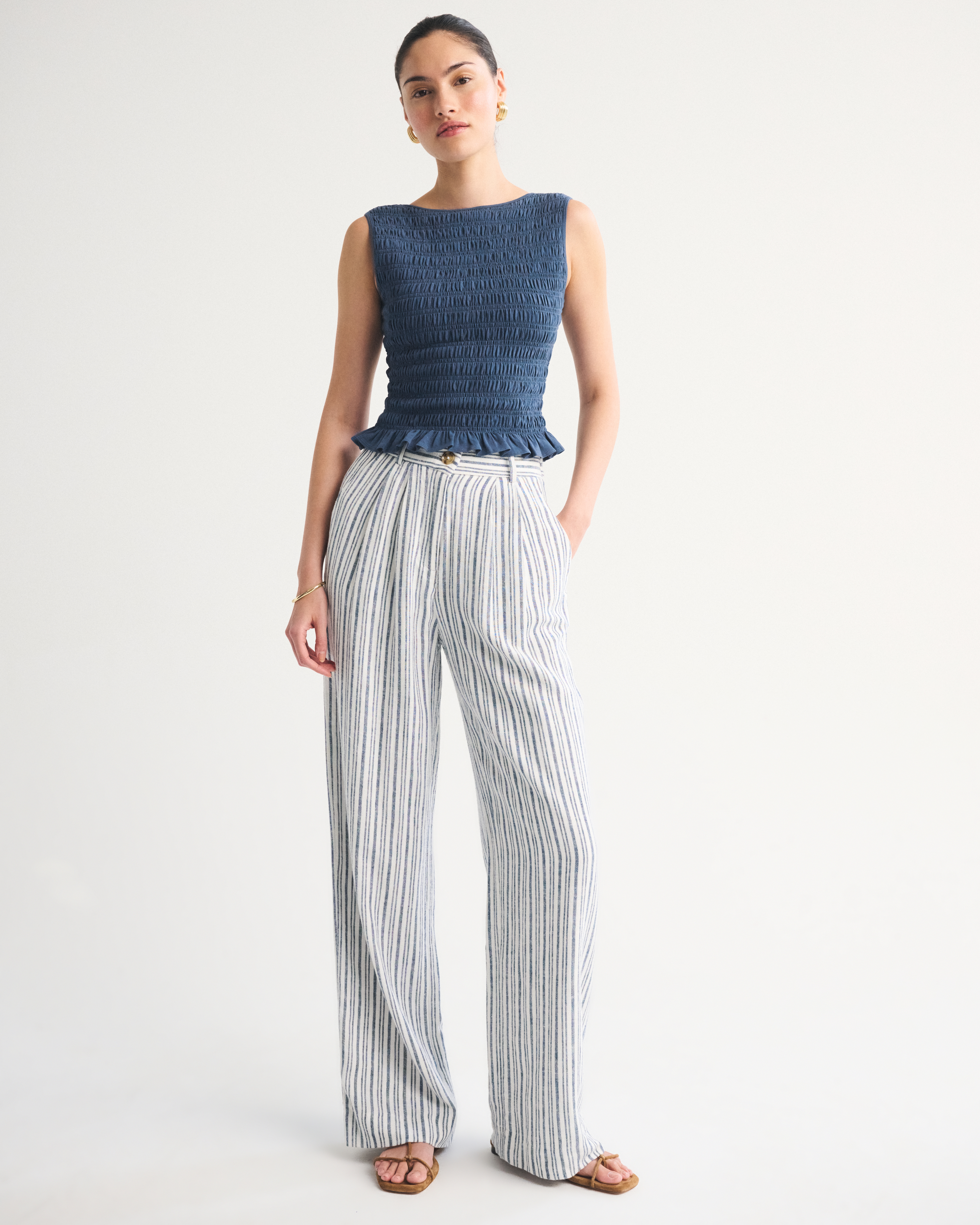 Slim-fitting shell top in our softAF cotton-blend seamless fabric, with all-over smocking details along the bodice. This reversible top offers a scoop neckline on one side and a slash neckline on the other when turned front to back. Imported.